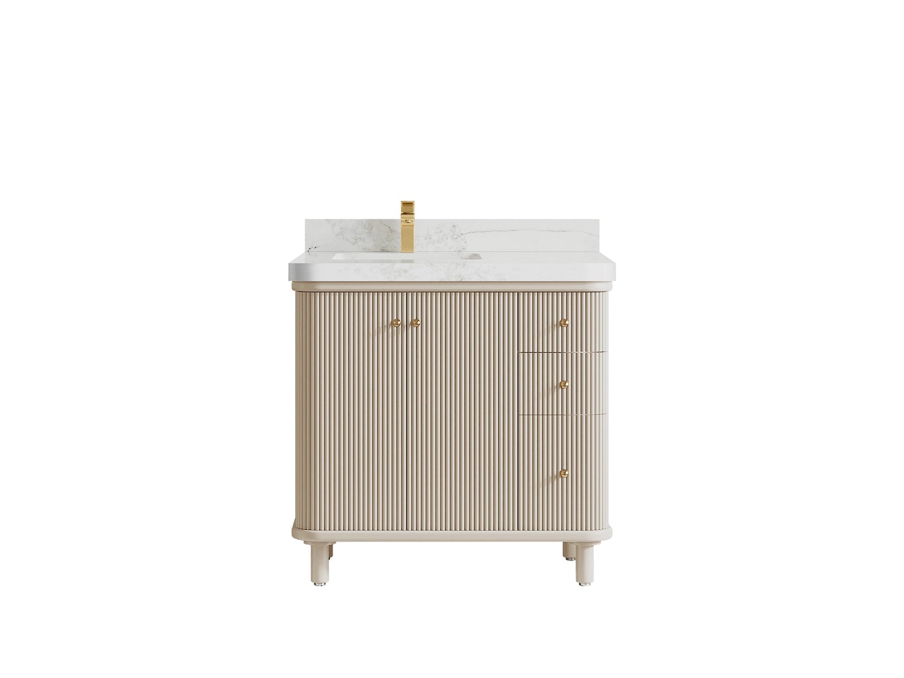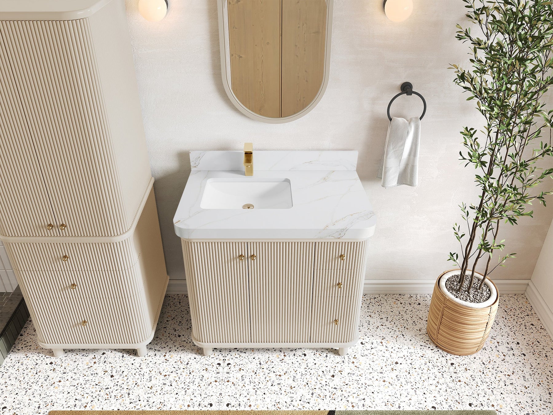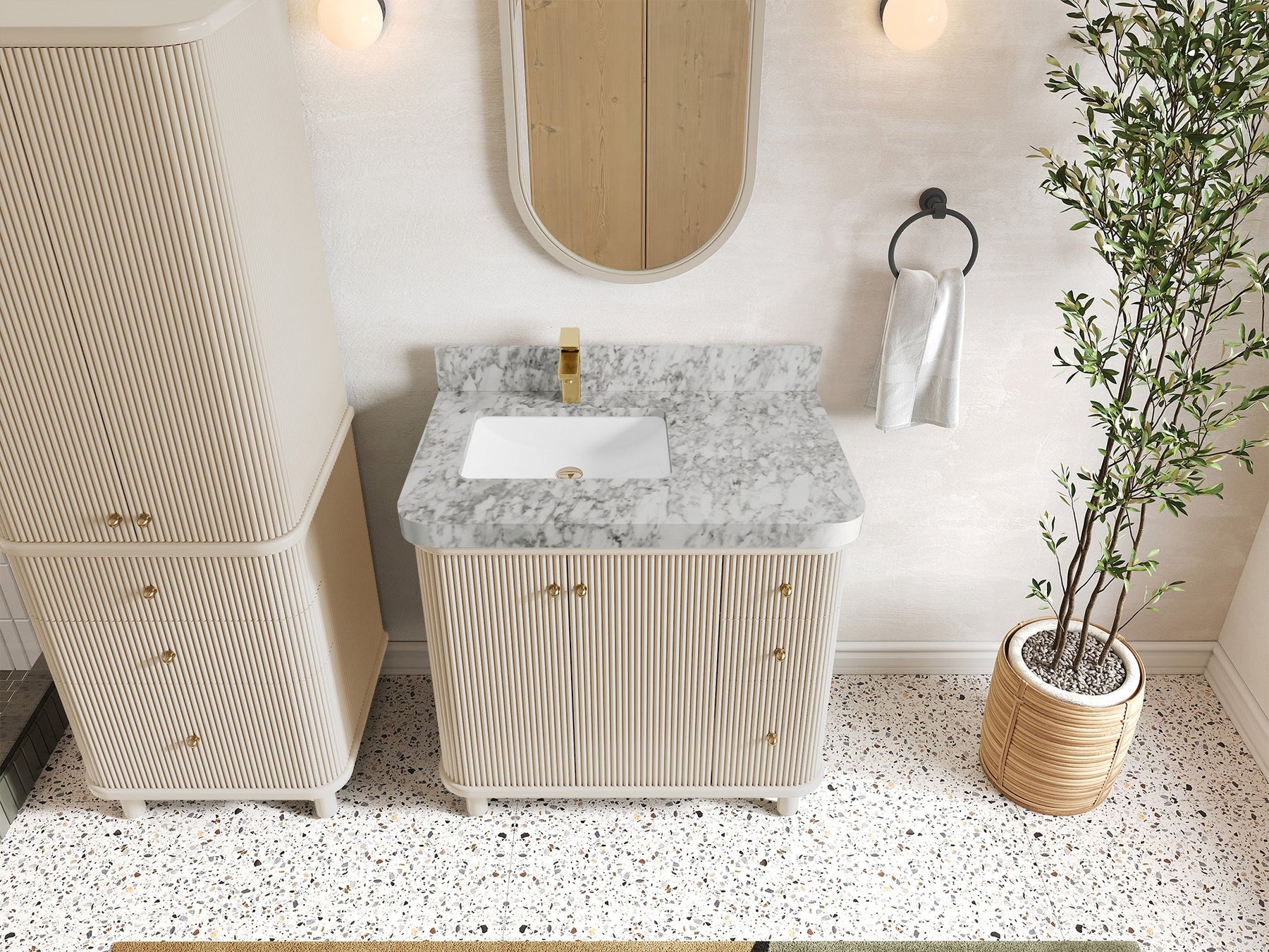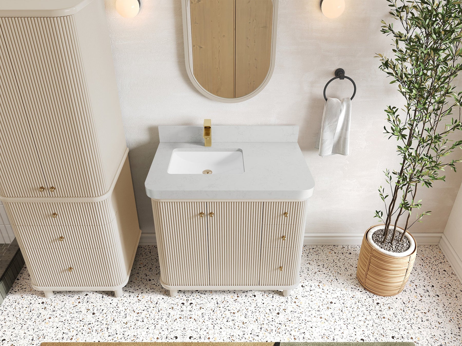 Vanity Countertops options: For Calacatta Laza Quartz, Empira White Quartz, Pure White Quartz, Palissandro Quartz, Calacatta Nuvo Quartz, Carrara Quartz, Carrara Marble, Calacatta Gold Quartz, Calacatta Sienna Quartz we have Straight - Mitered Edge option.