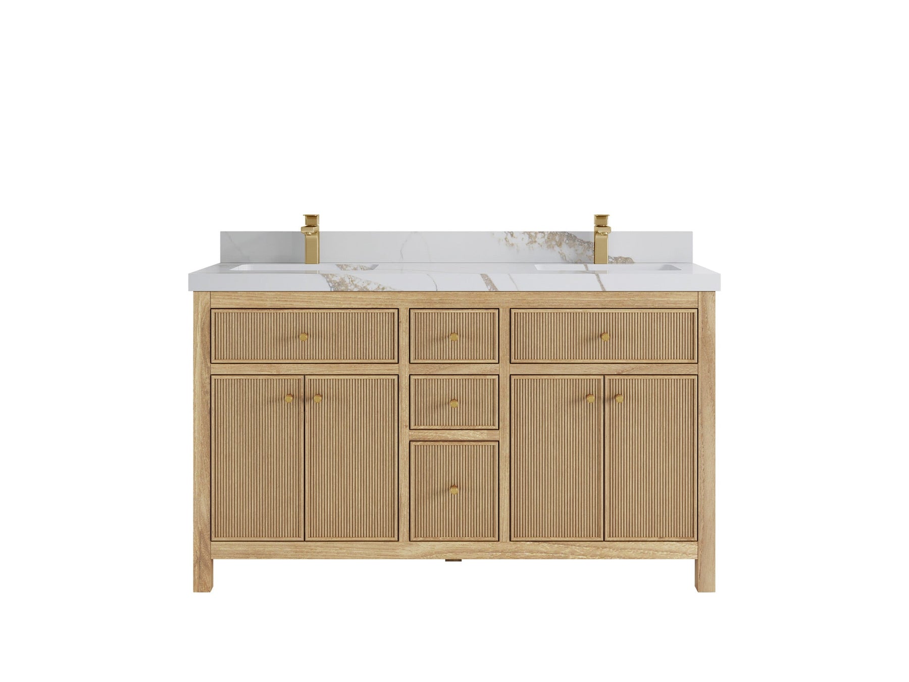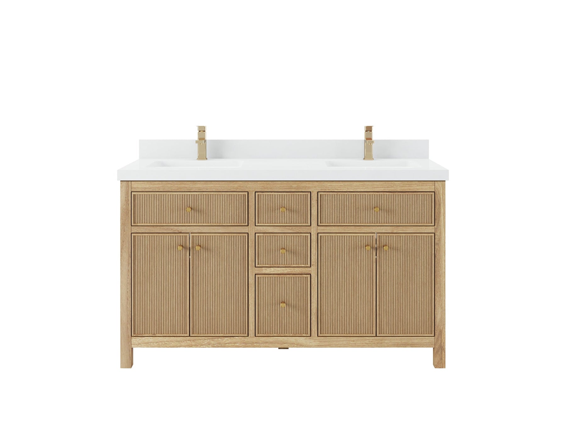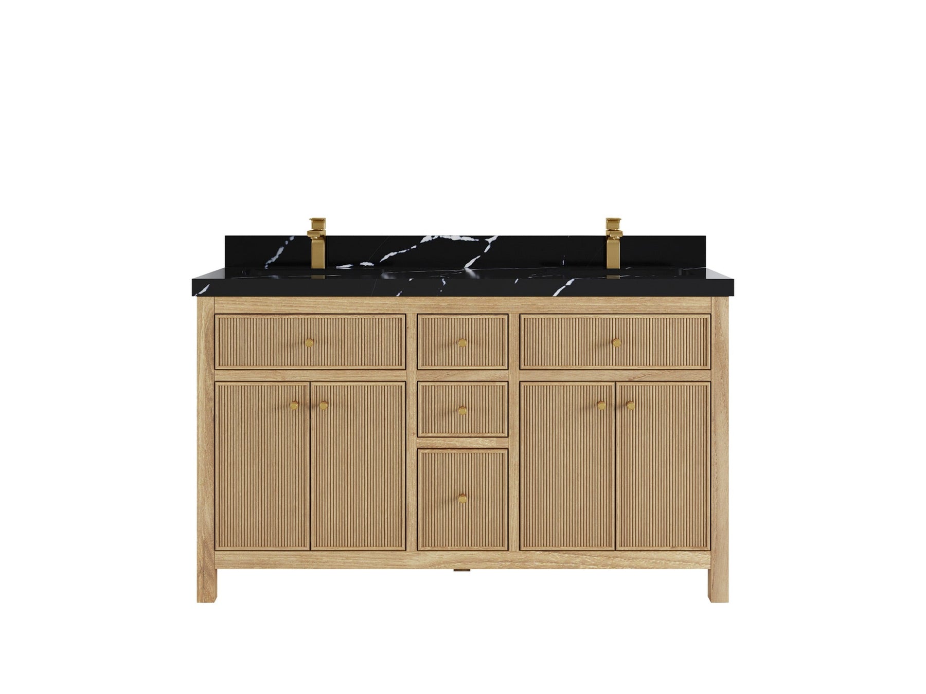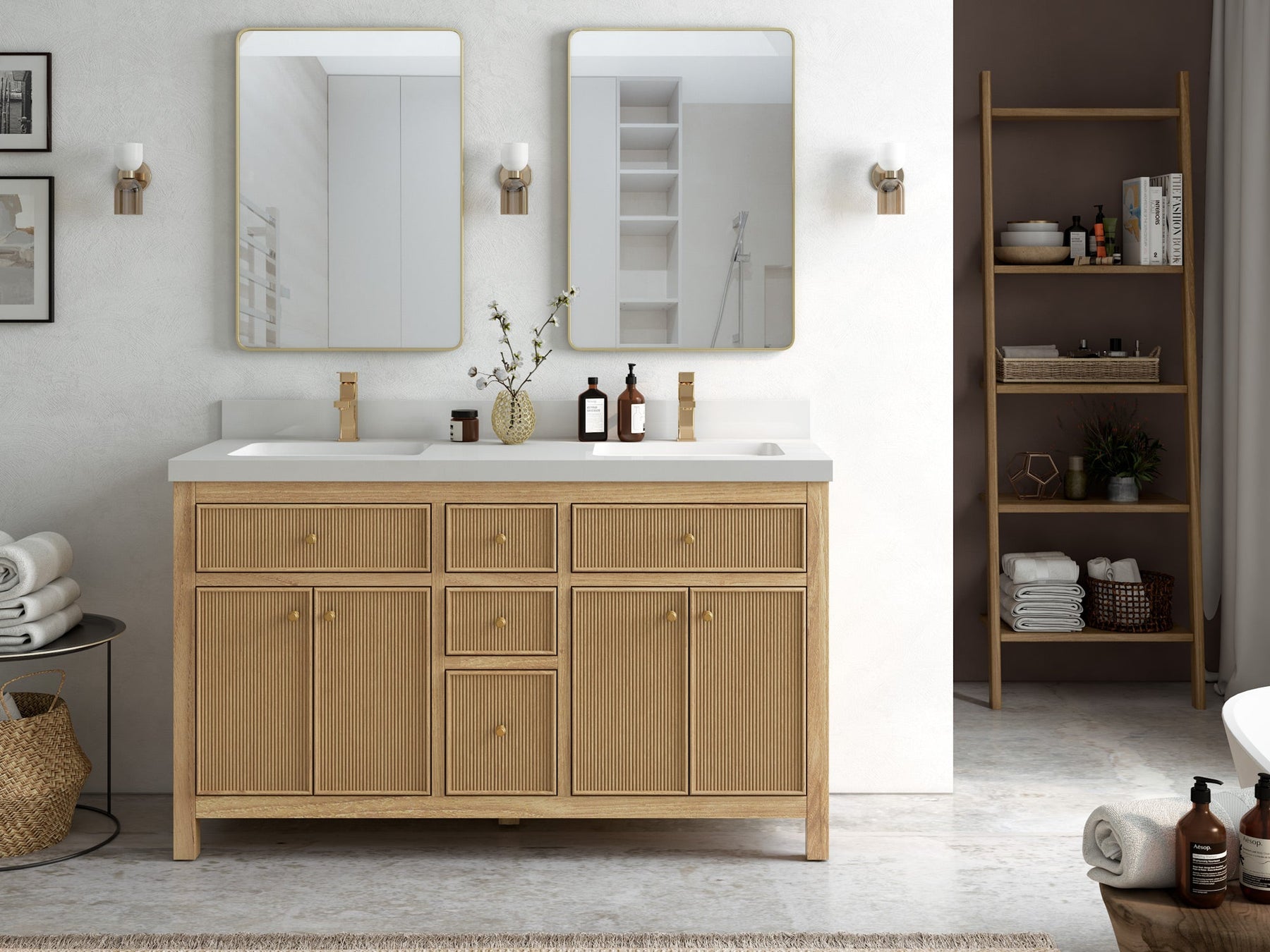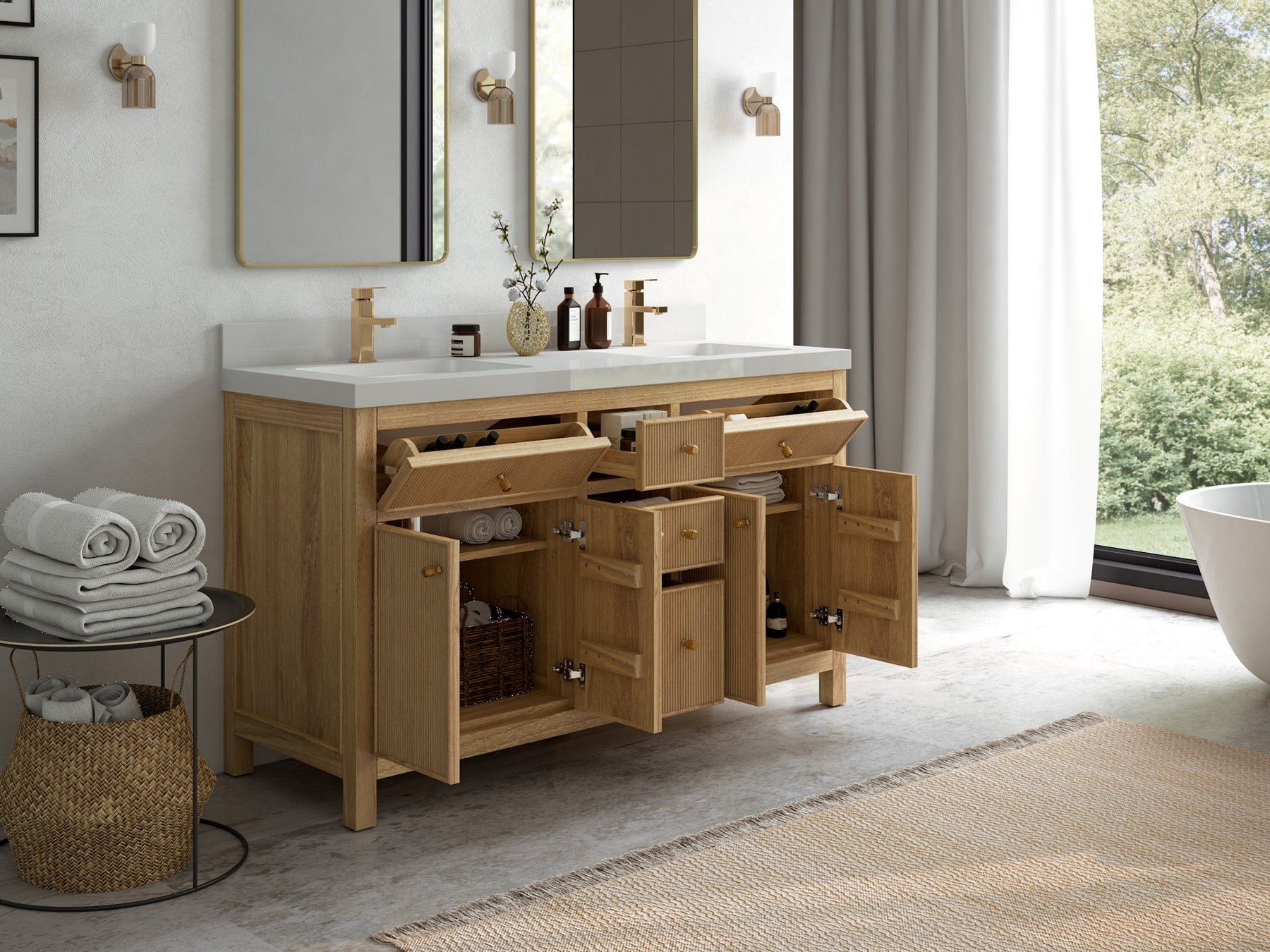 1. Crafted from premium teak wood with reeded design, this vanity showcases a sleek build, complemented by soft-close hardware for quiet and effortless operation. Add antique brass hardware for a touch of vintage charm!