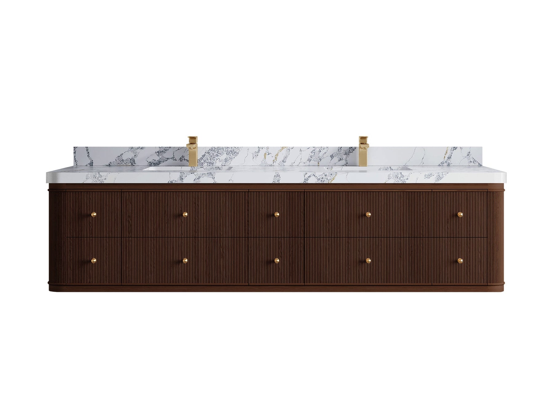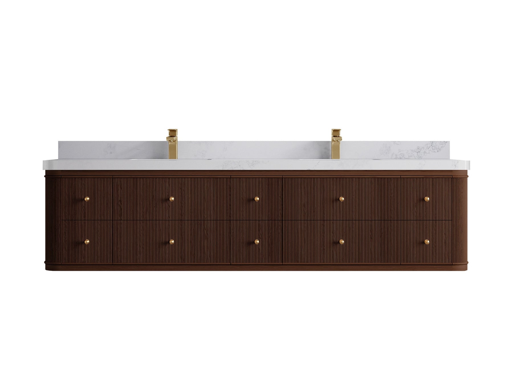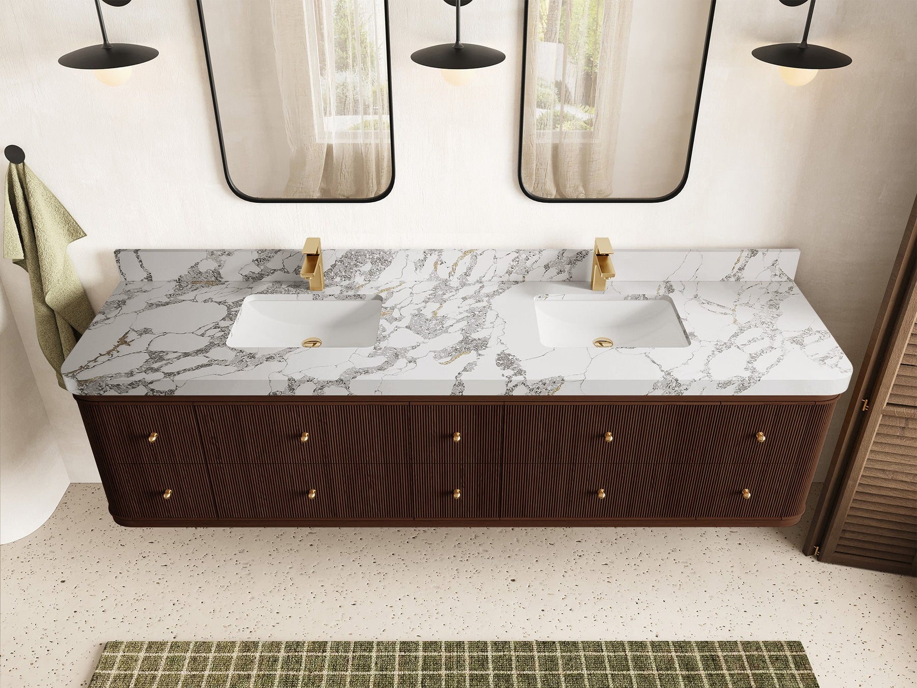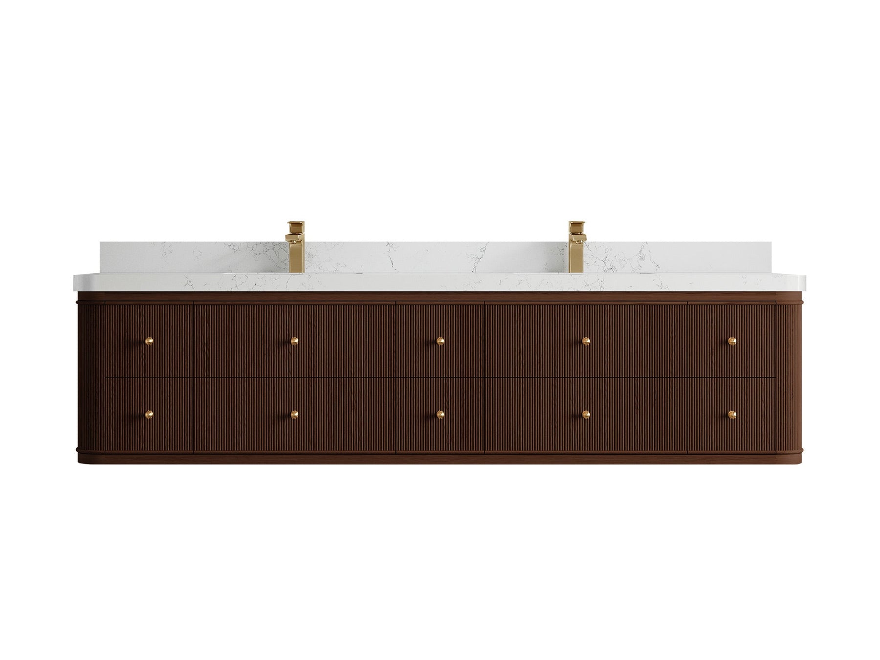 4. Integrated White Quartz Countertop The double-sink countertop features a durable and easy-to-clean white quartz surface with subtle veining, adding a touch of luxury.
