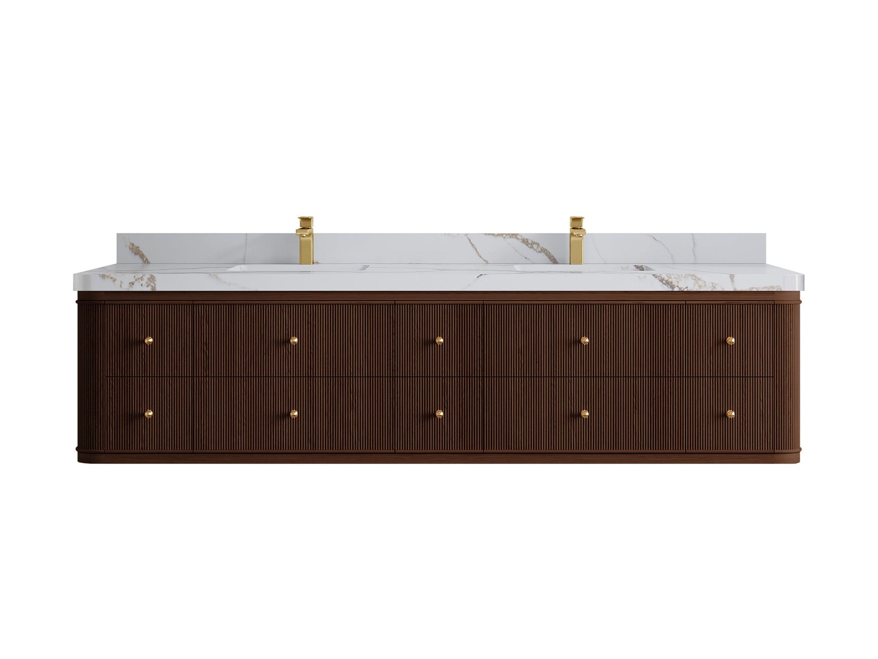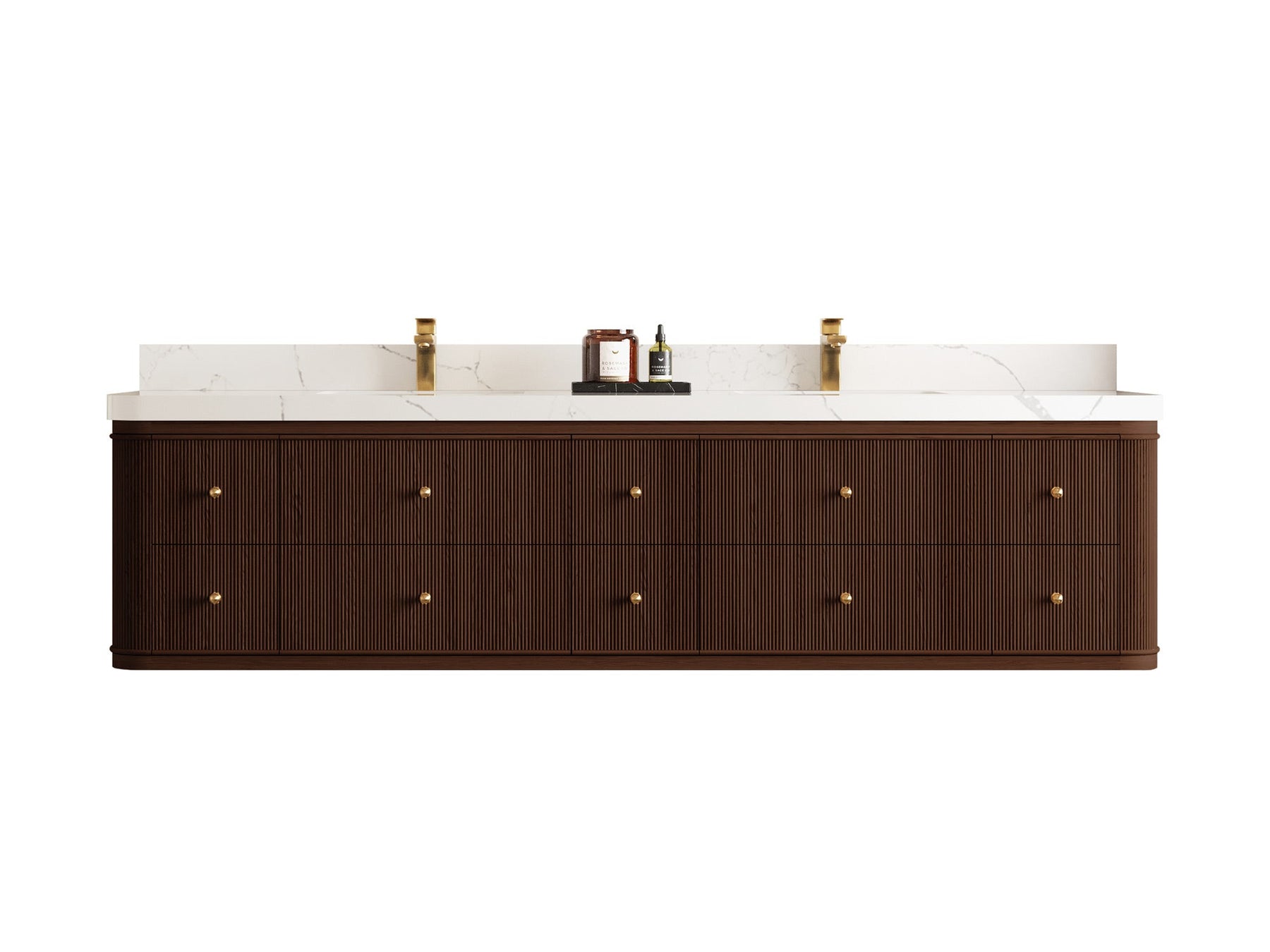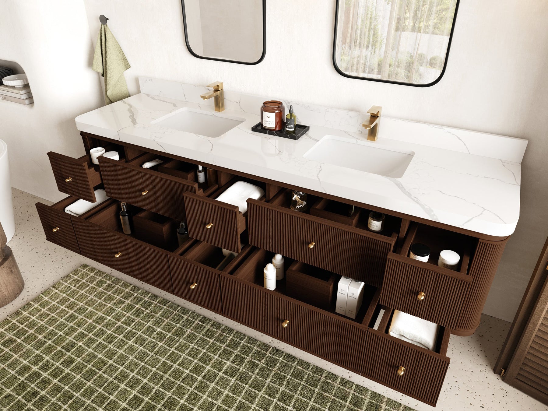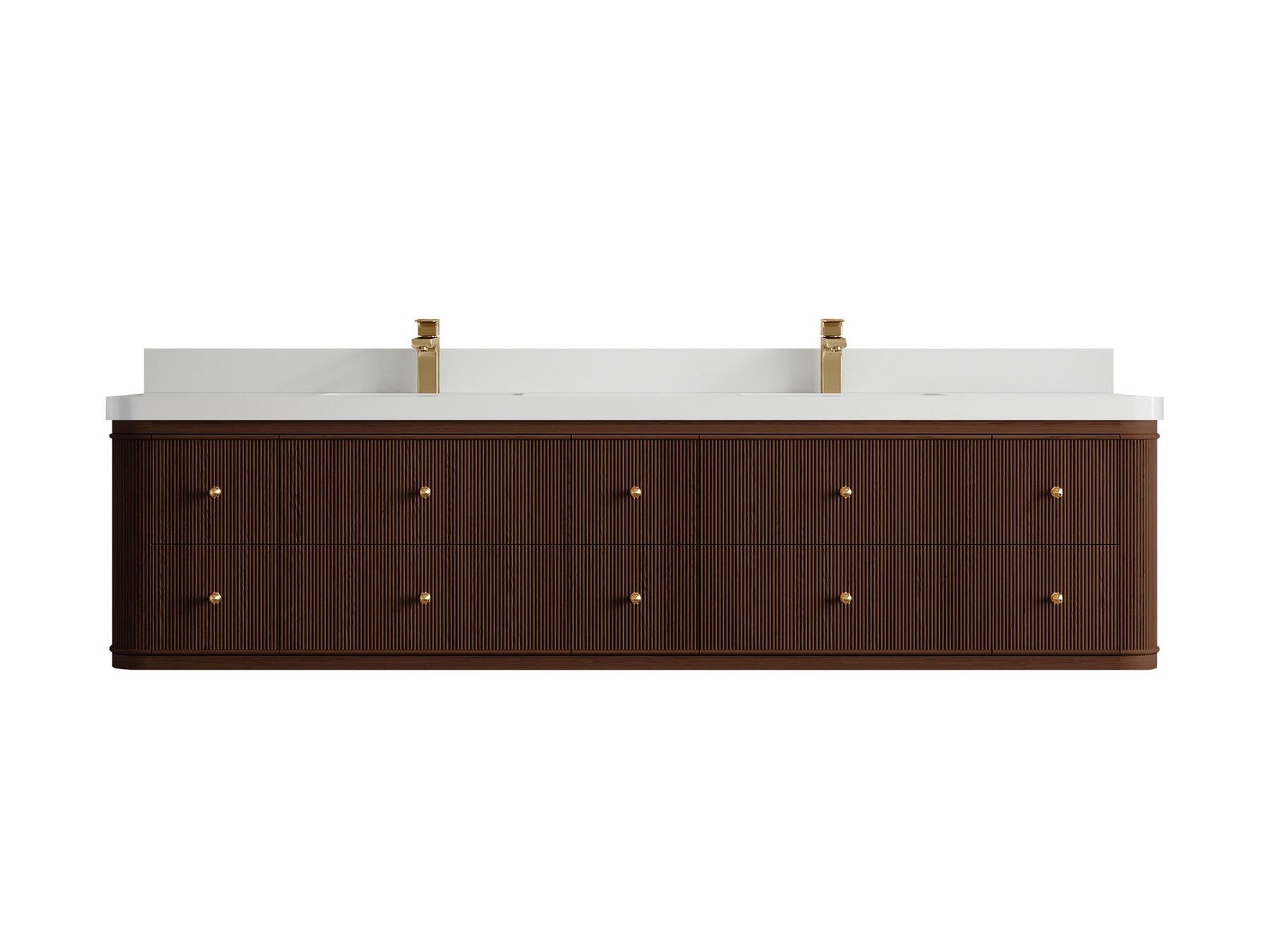 4. Integrated White Quartz Countertop The double-sink countertop features a durable and easy-to-clean white quartz surface with subtle veining, adding a touch of luxury.