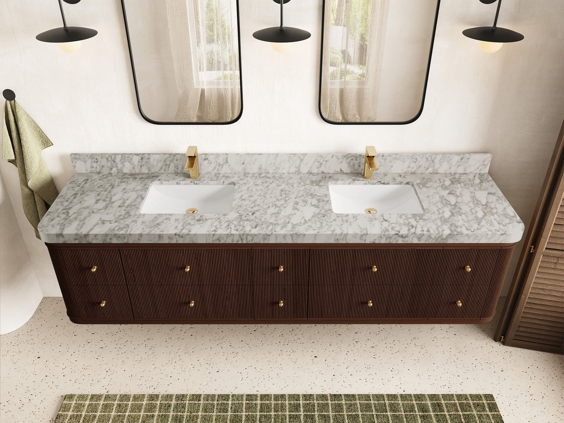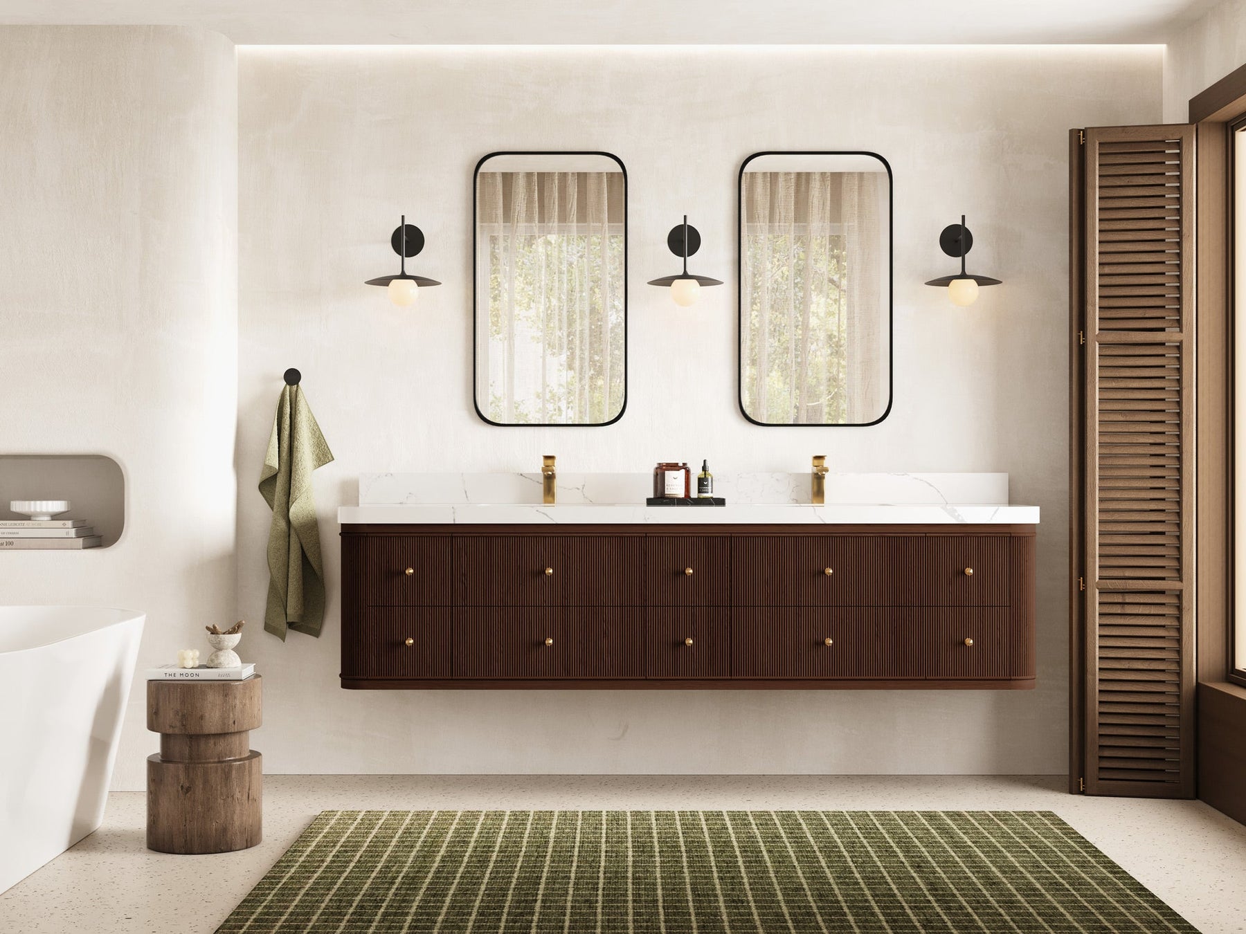 5. Minimalist Lighting & Hardware Complemented by matte black wall sconces and brass-finished faucets and knobs, the collection reflects timeless sophistication and contrast.