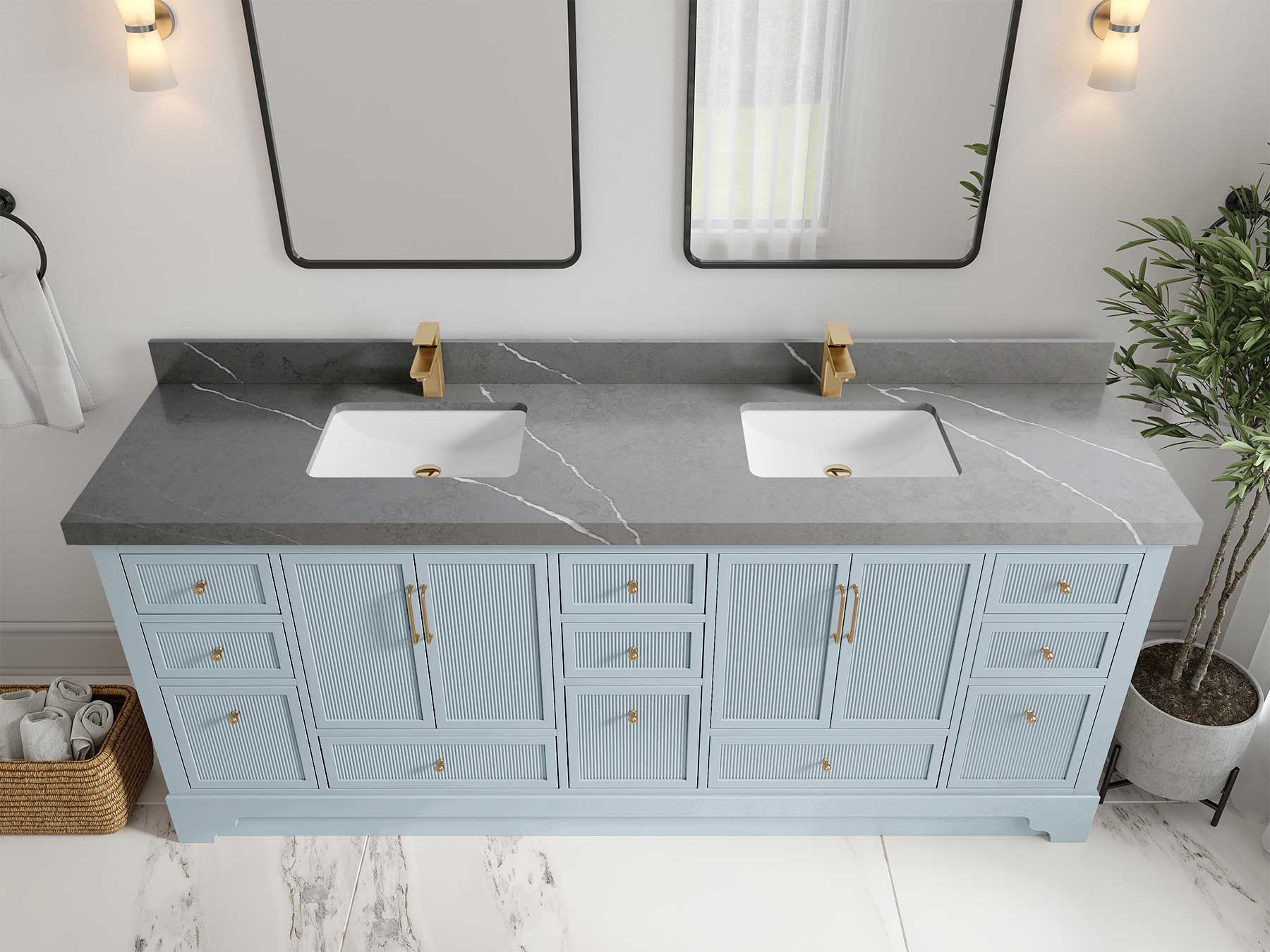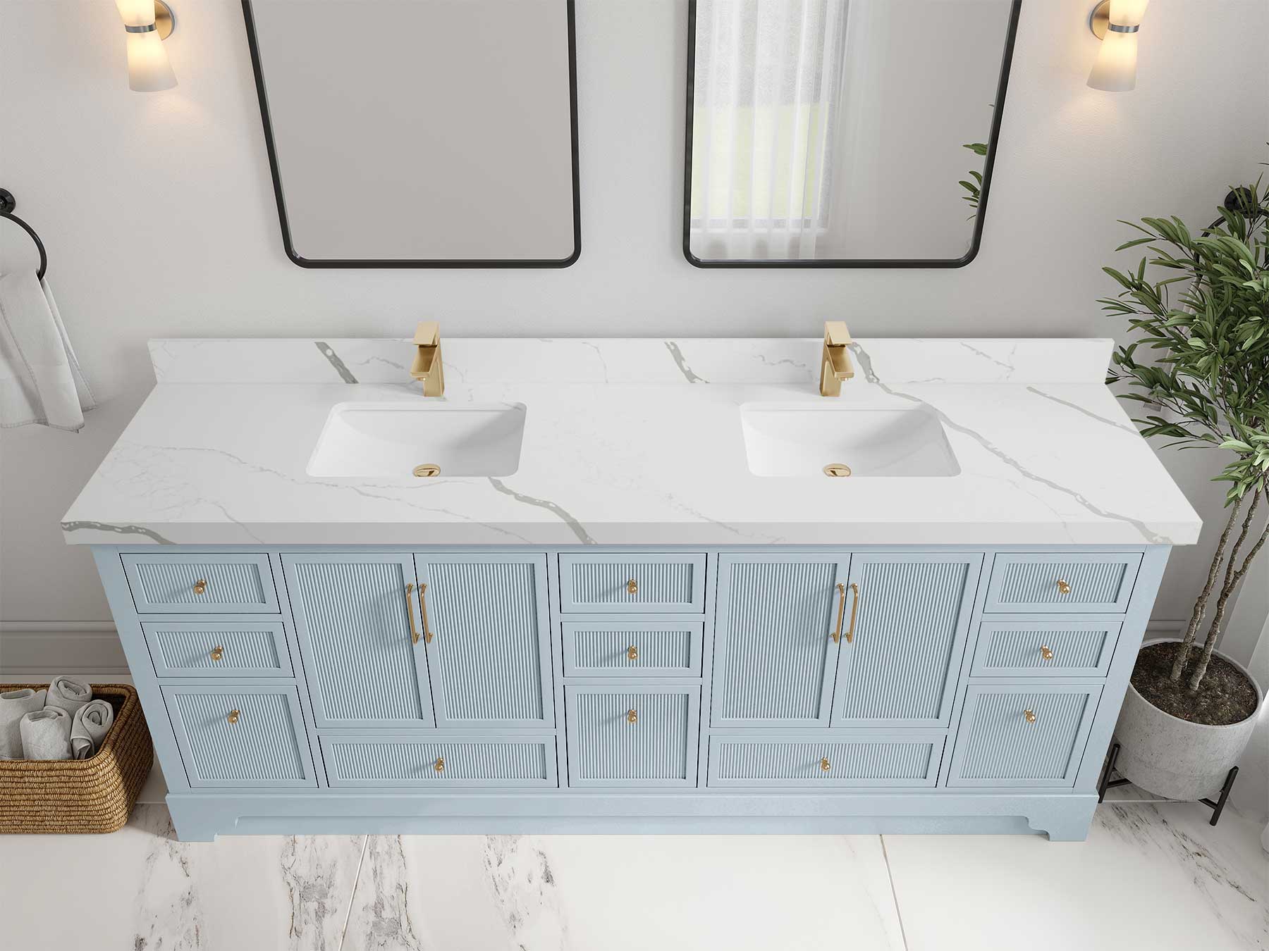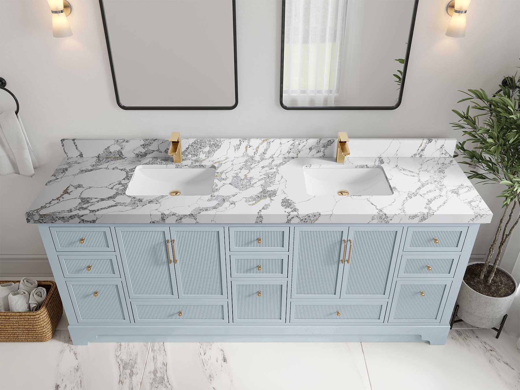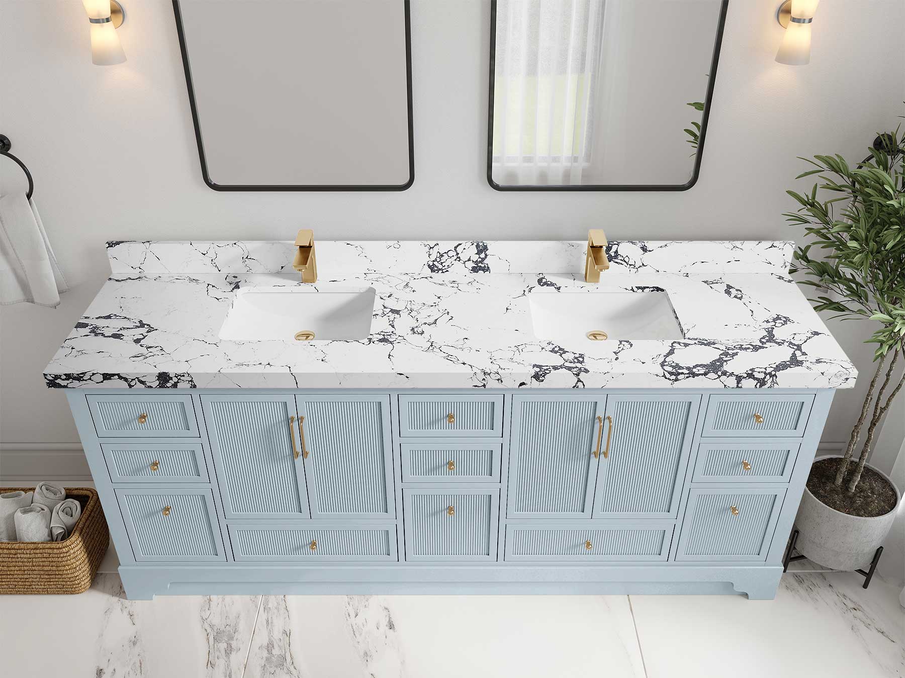 Vanity Countertops options: For Calacatta Laza Quartz, Empira White Quartz, Pure White Quartz, Palissandro Quartz we have 2 options Straight-Mitered Edge and Double Cove Edge; For Calacatta Nuvo Quartz, Carrara Marble, Carrara Quartz, Piatra Gray Quartz, Pearl Light Gray Quartz, Calacatta Black Quartz, Calacatta Gold Quartz, Calacatta Sienna Quartz, Calacatta Poanazzo Quartz, Venatino Quartz, Viola Brown Quartz, Viola Gold Quartz, Viola Night Quartz, Viola Biagio Quartz, Berkshire Brass Quartz, Frosty Carrara Quartz, Onyx Quartz we have Straight - Mitered Edge option.
