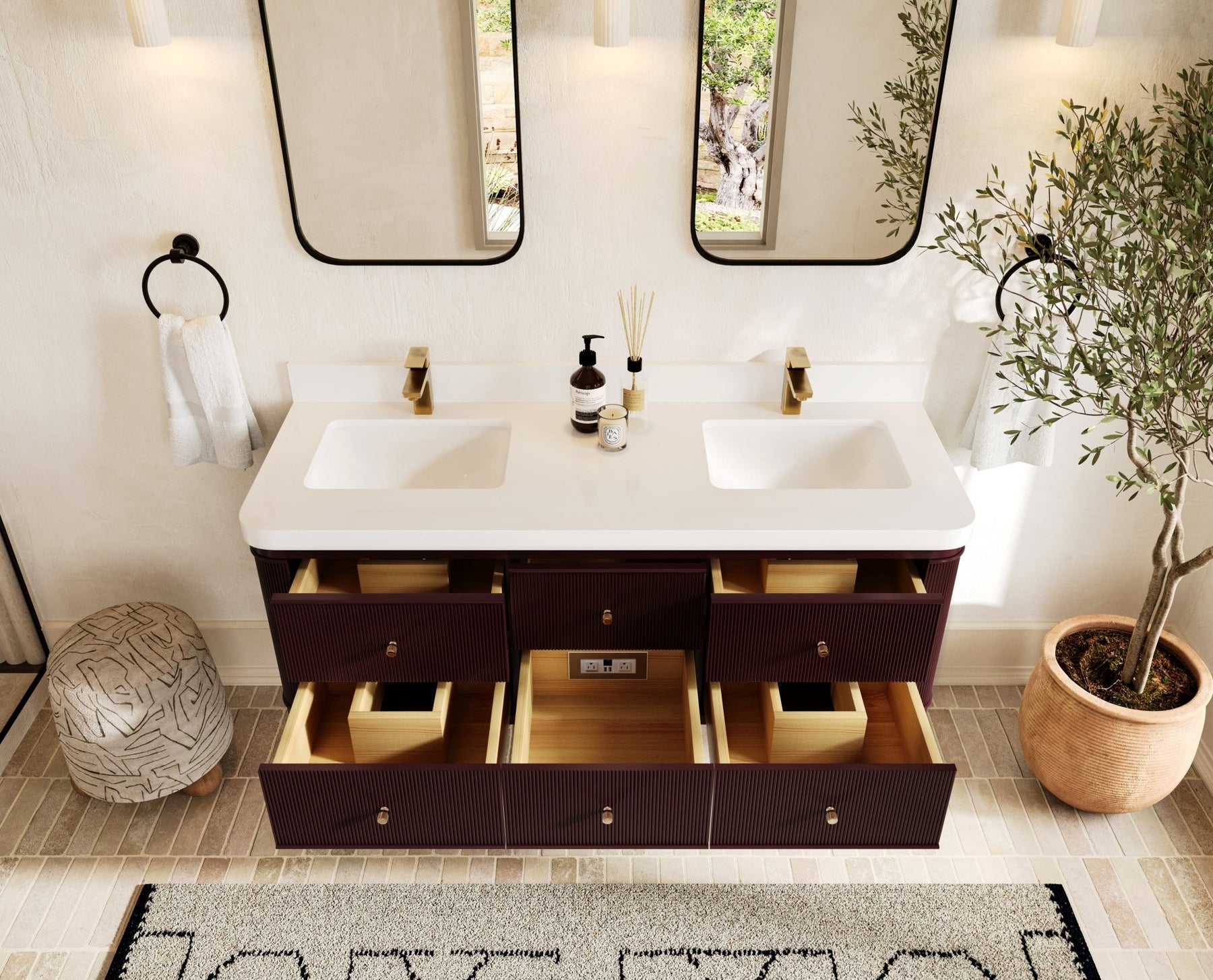 The Hampton Collection embodies understated elegance through its fluted detailing, soft rounded corners, and floating form. This wall-mounted vanity creates an elevated sense of space while offering exceptional storage and organization. Every drawer opens to reveal a thoughtfully designed interior with natural wood compartments, built-in power outlets, and soft-close hardware for a seamless experience.
