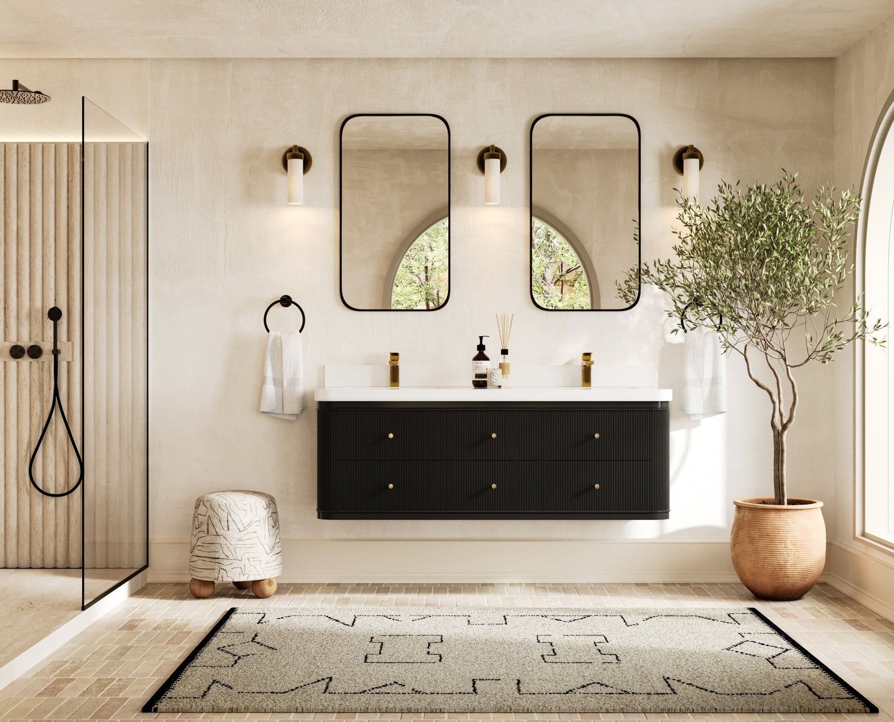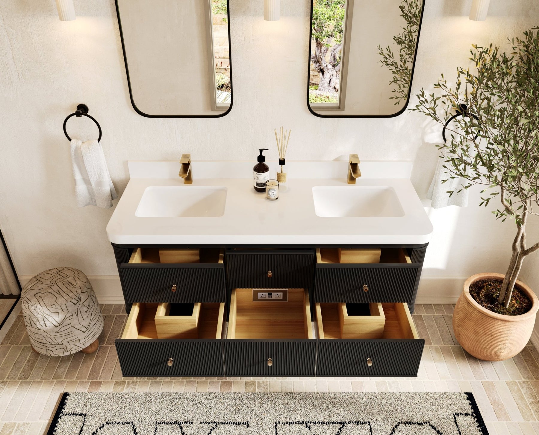 The Hampton Collection embodies understated elegance through its fluted detailing, soft rounded corners, and floating form. This wall-mounted vanity creates an elevated sense of space while offering exceptional storage and organization. Every drawer opens to reveal a thoughtfully designed interior with natural wood compartments, built-in power outlets, and soft-close hardware for a seamless experience.