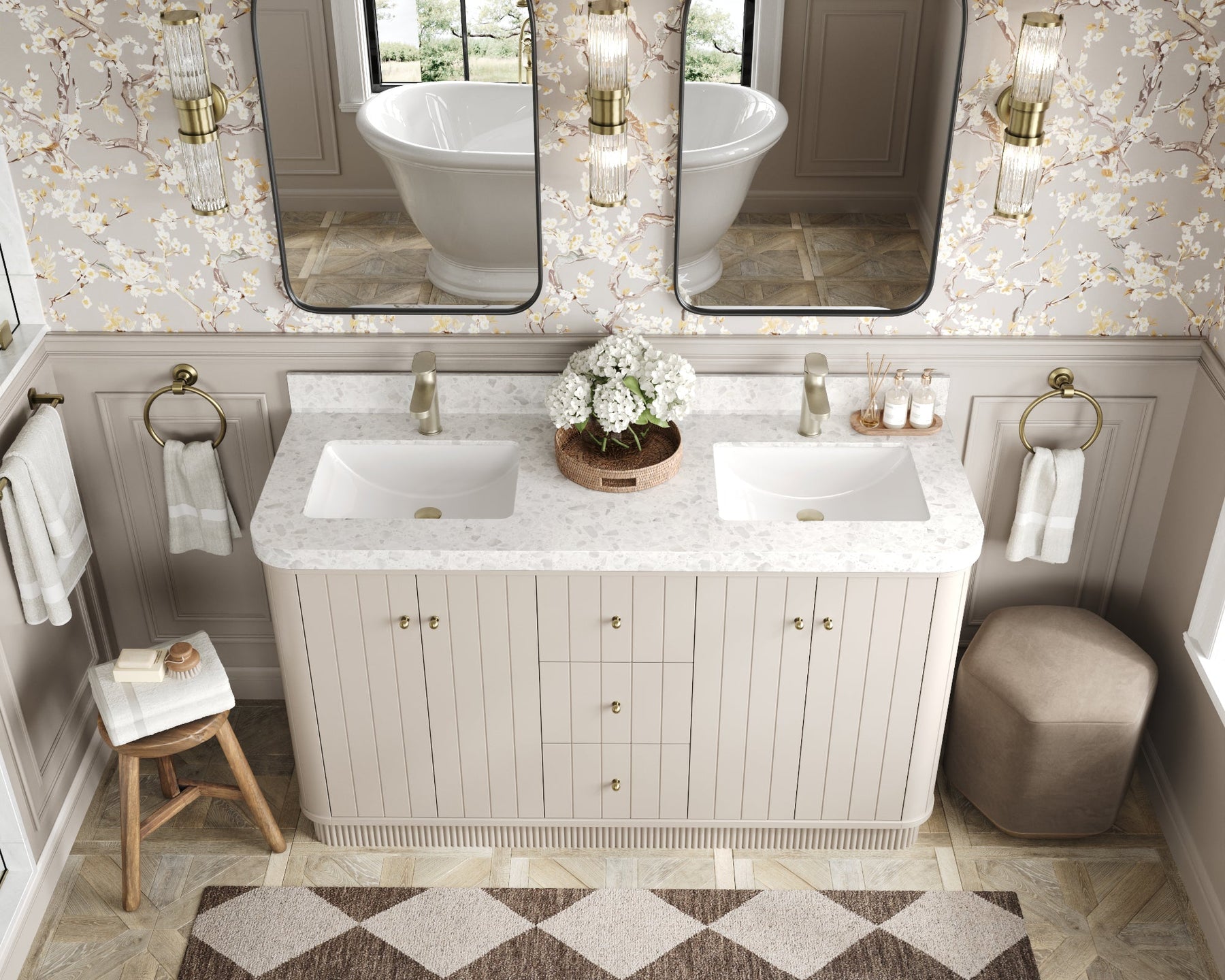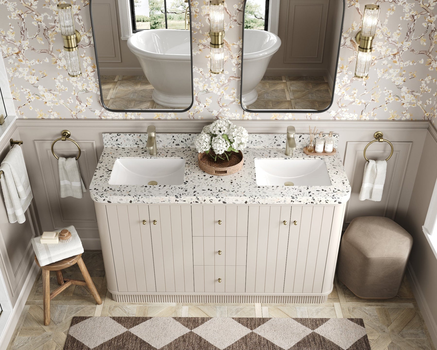 Vanity Countertops options: For Calacatta Laza Quartz, Calacatta Gold Quartz, Empira White Quartz, Pure White Quartz, Palissandro Quartz, Calacatta Nuvo Quartz, Carrara Marble, Carrara Quartz, Calacatta Sienna Quartz, Terrazzo Arctic Breeze, Terrazzo Golden Dusk we have Rounded - Edge option.