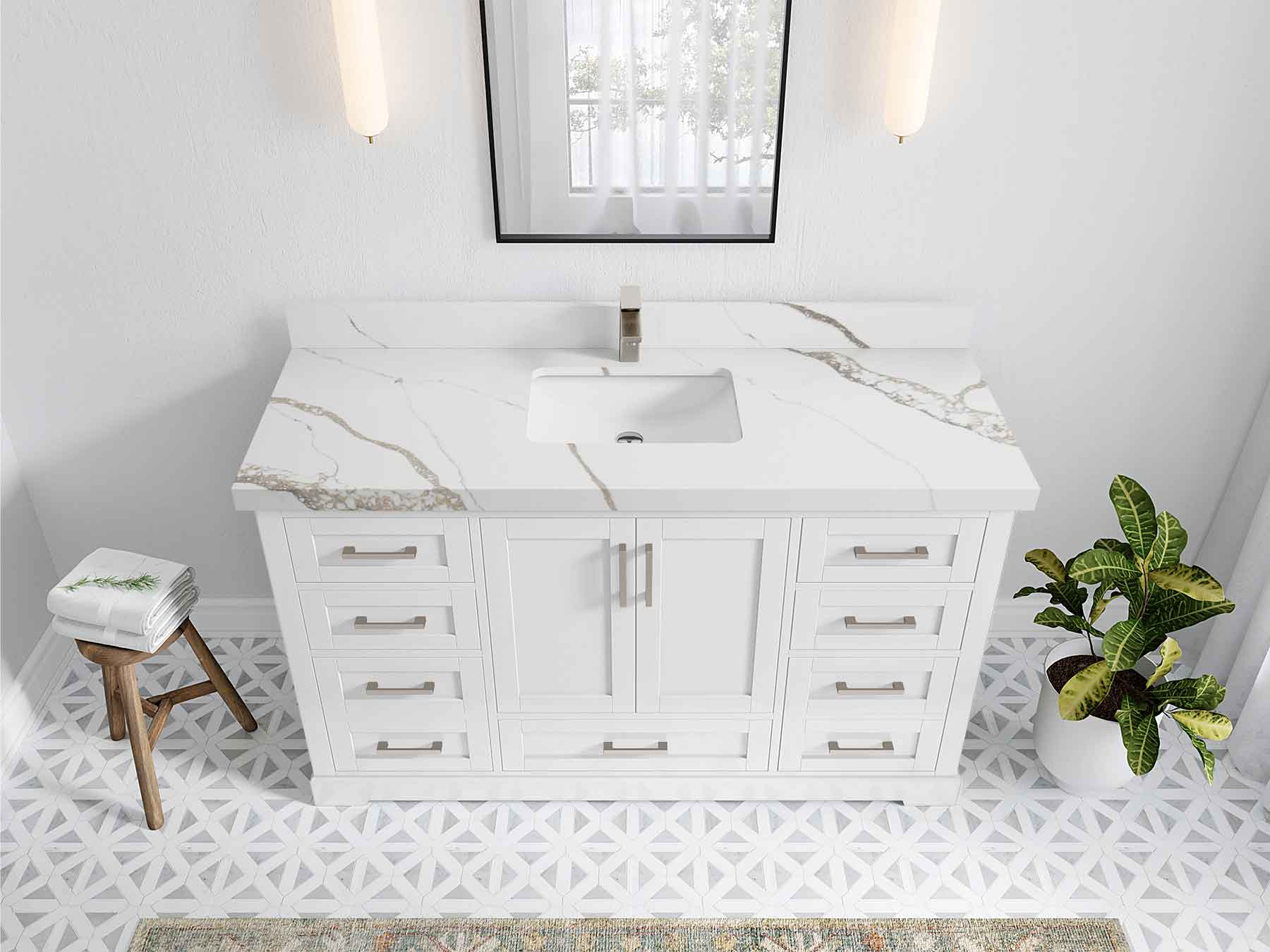Boston 60 in. W x 22 in. D Single Sink Bathroom Vanity in White with 2 in Calacatta Nuvo Quartz Countertop - Top View
