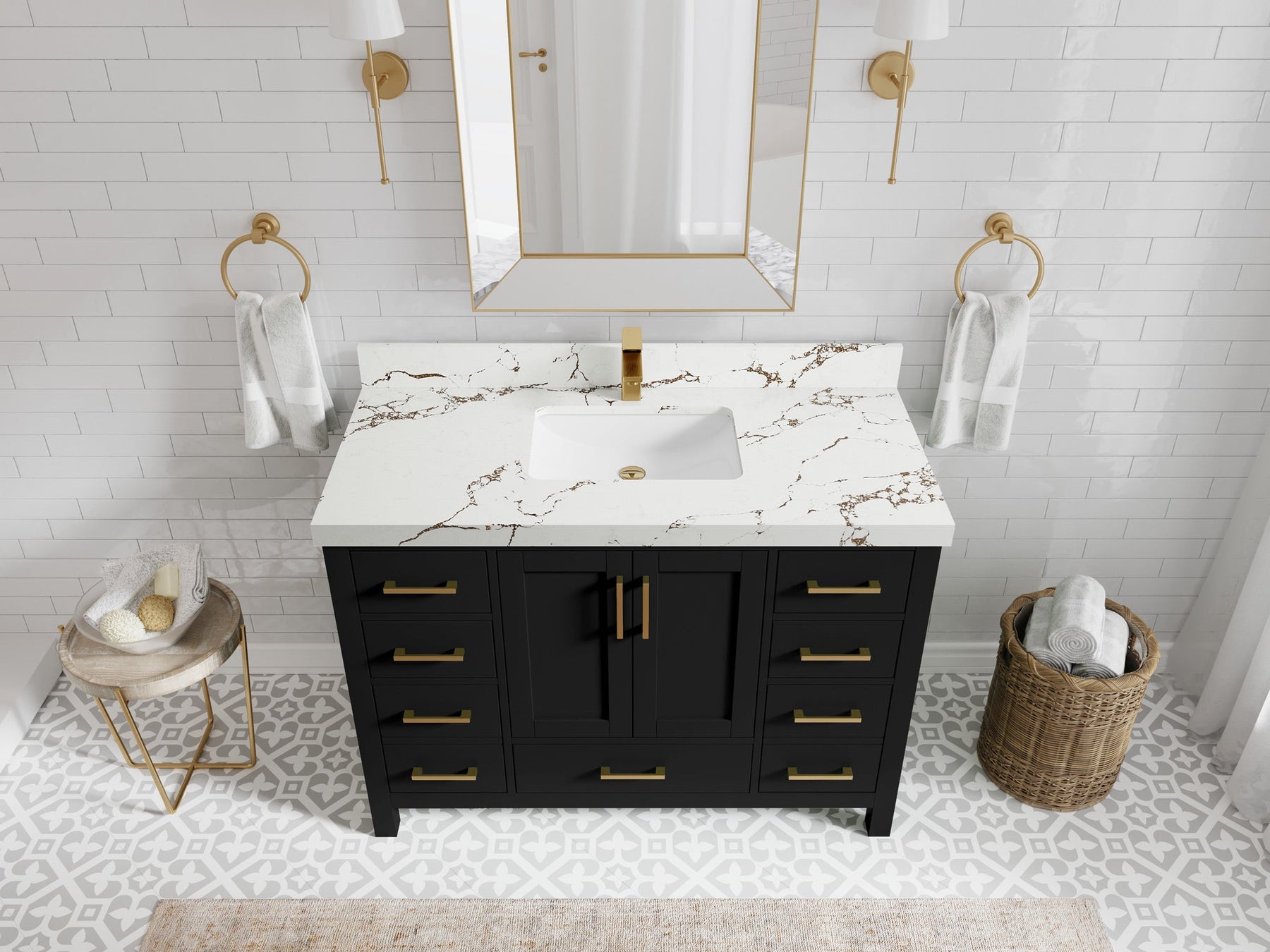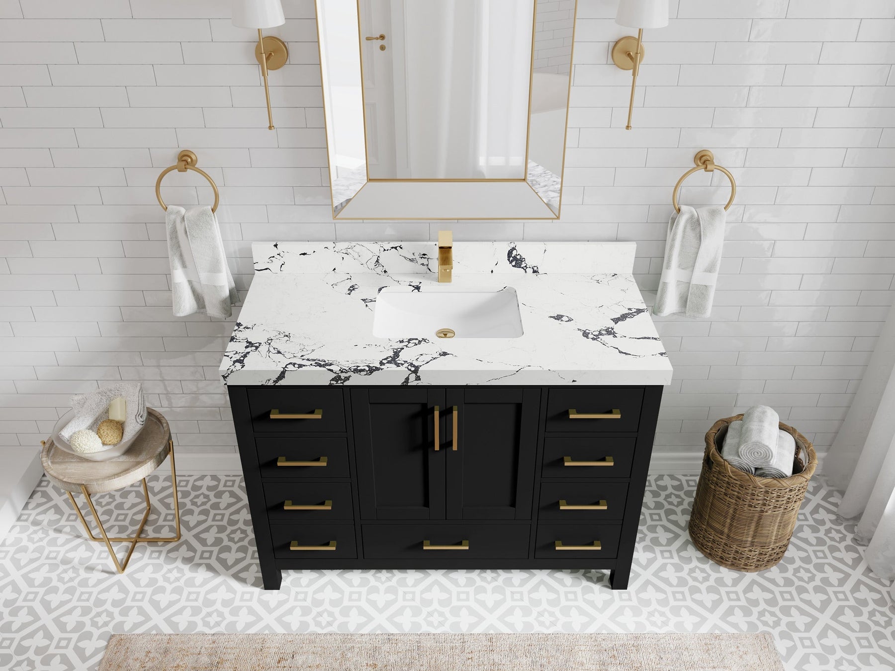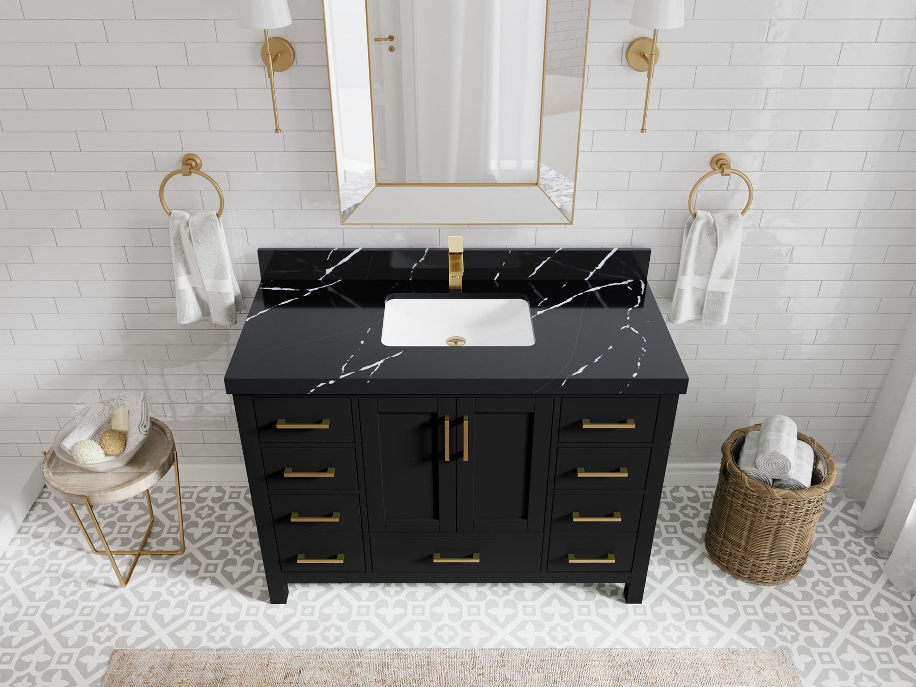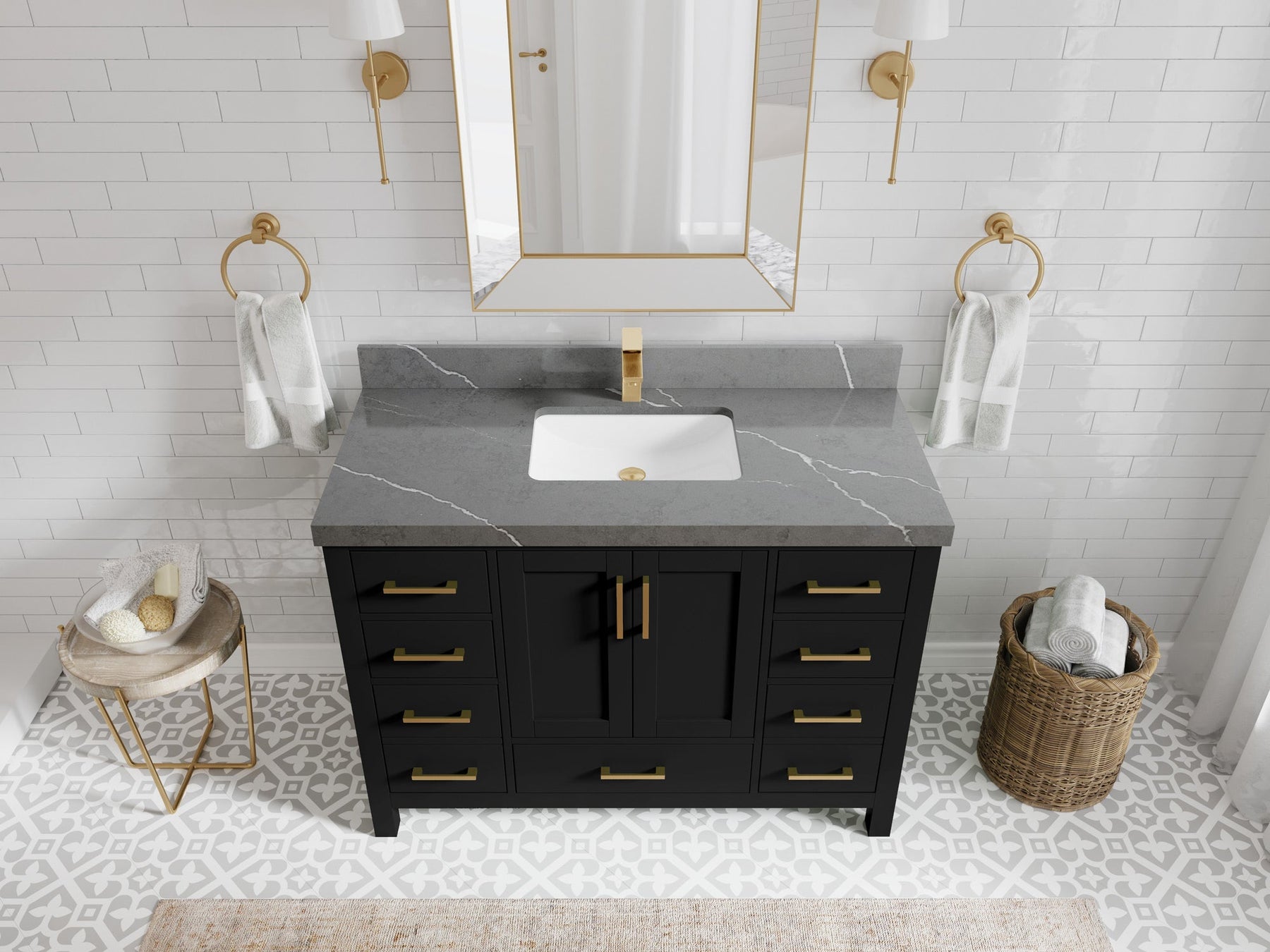 1. Traditional style with a modern twist - made from birch tree and plywood, this bathroom vanity features a clean, contemporary design with soft-close hardware and gold and nickel brushed hardware.