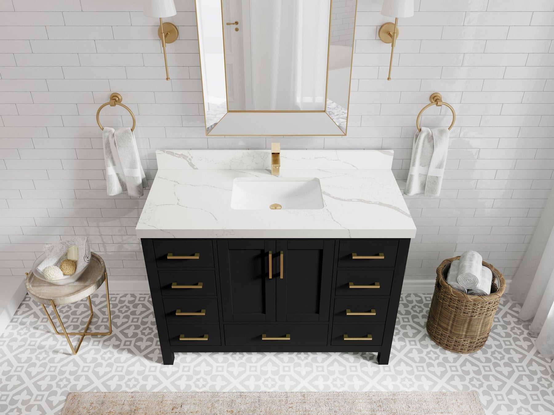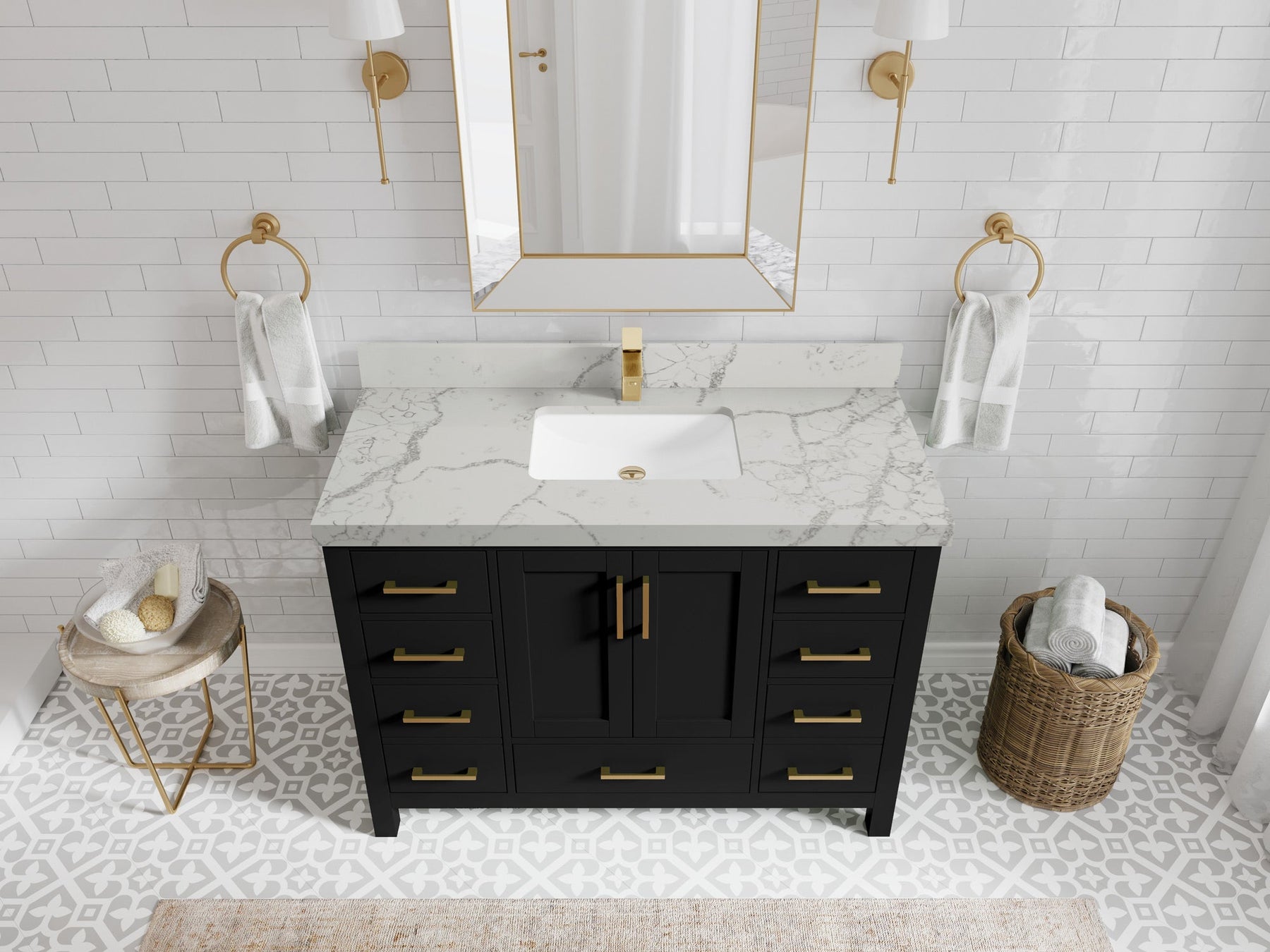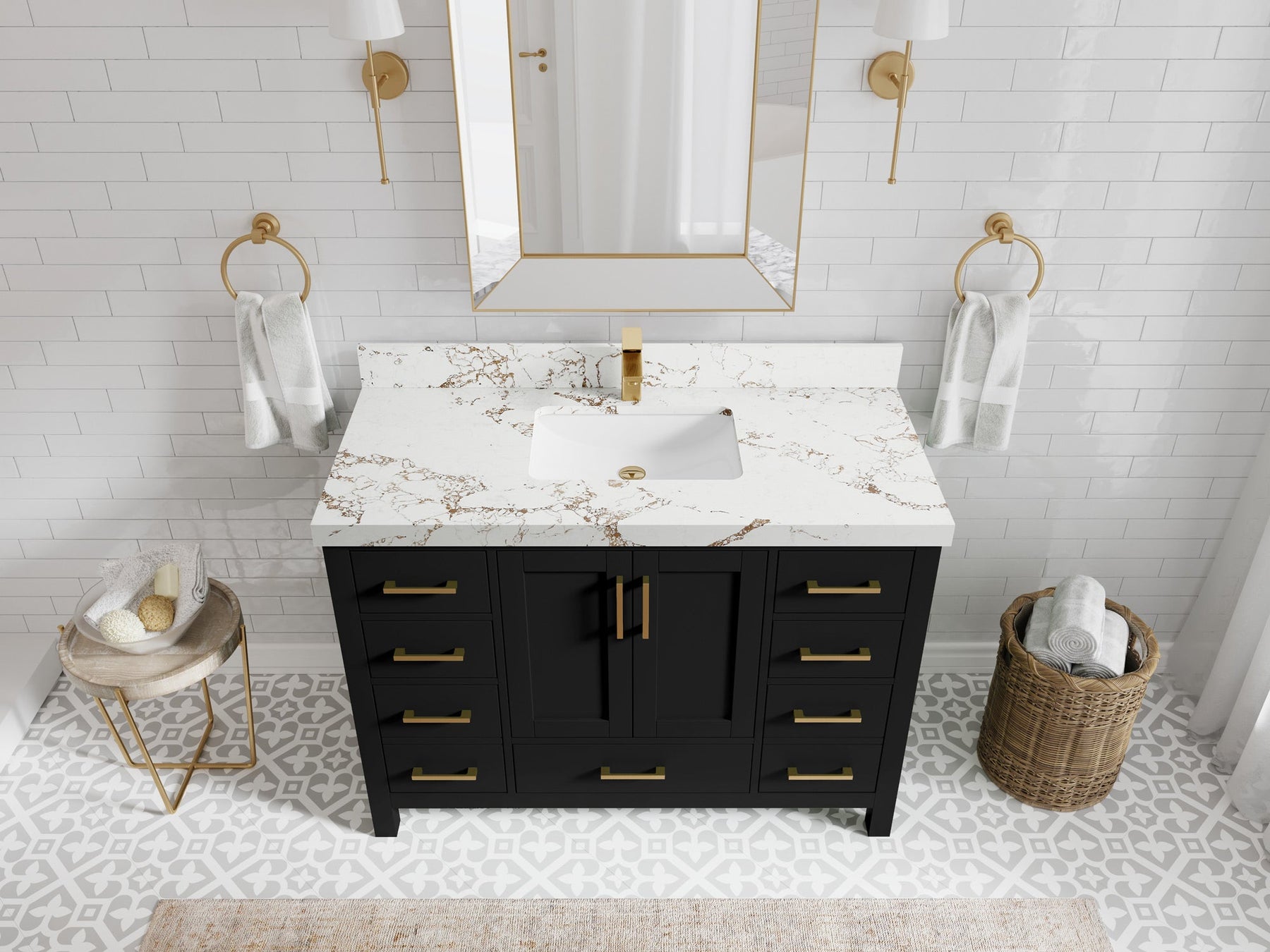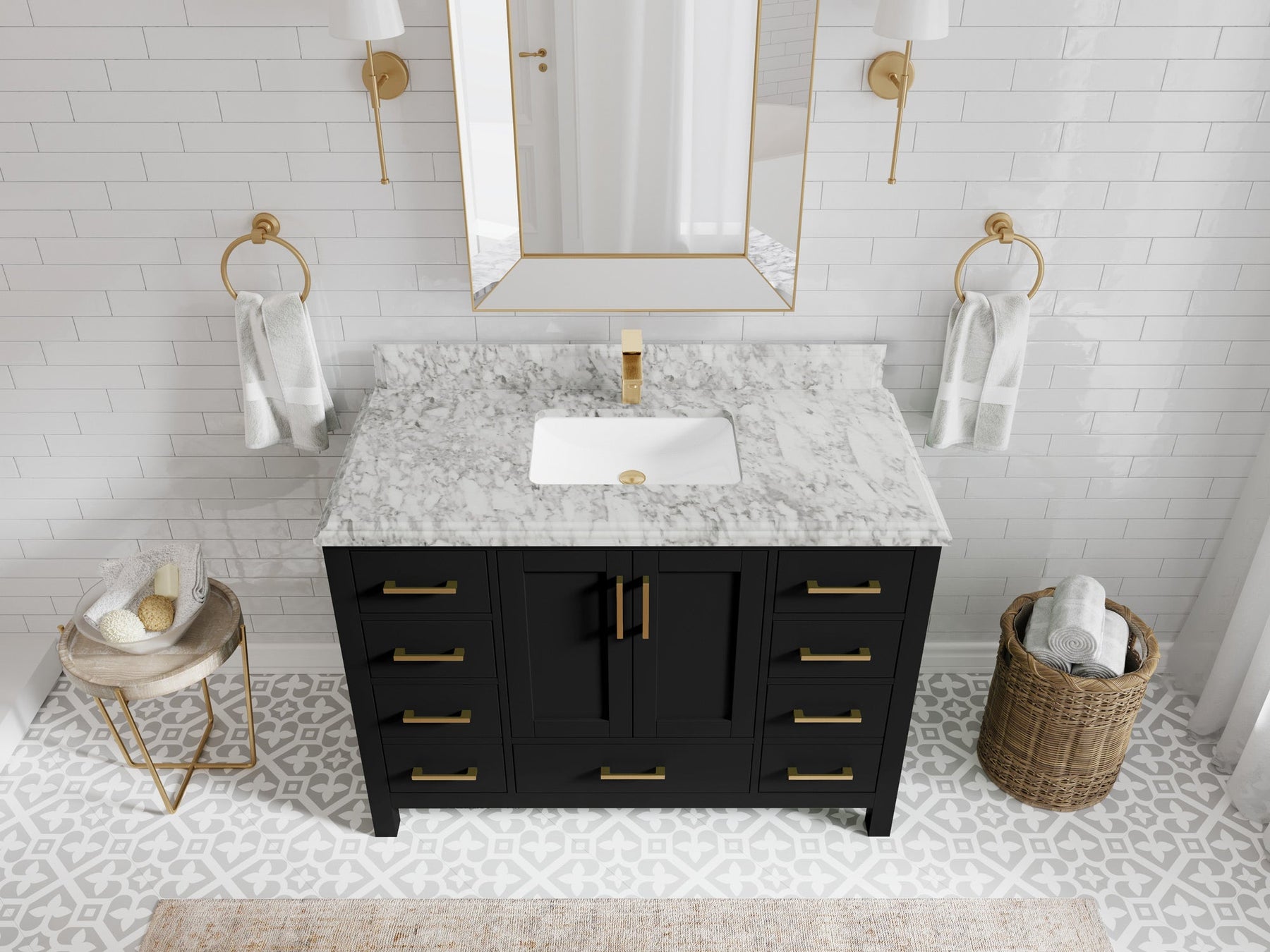 1. Traditional style with a modern twist - made from birch tree and plywood, this bathroom vanity features a clean, contemporary design with soft-close hardware and gold and nickel brushed hardware.