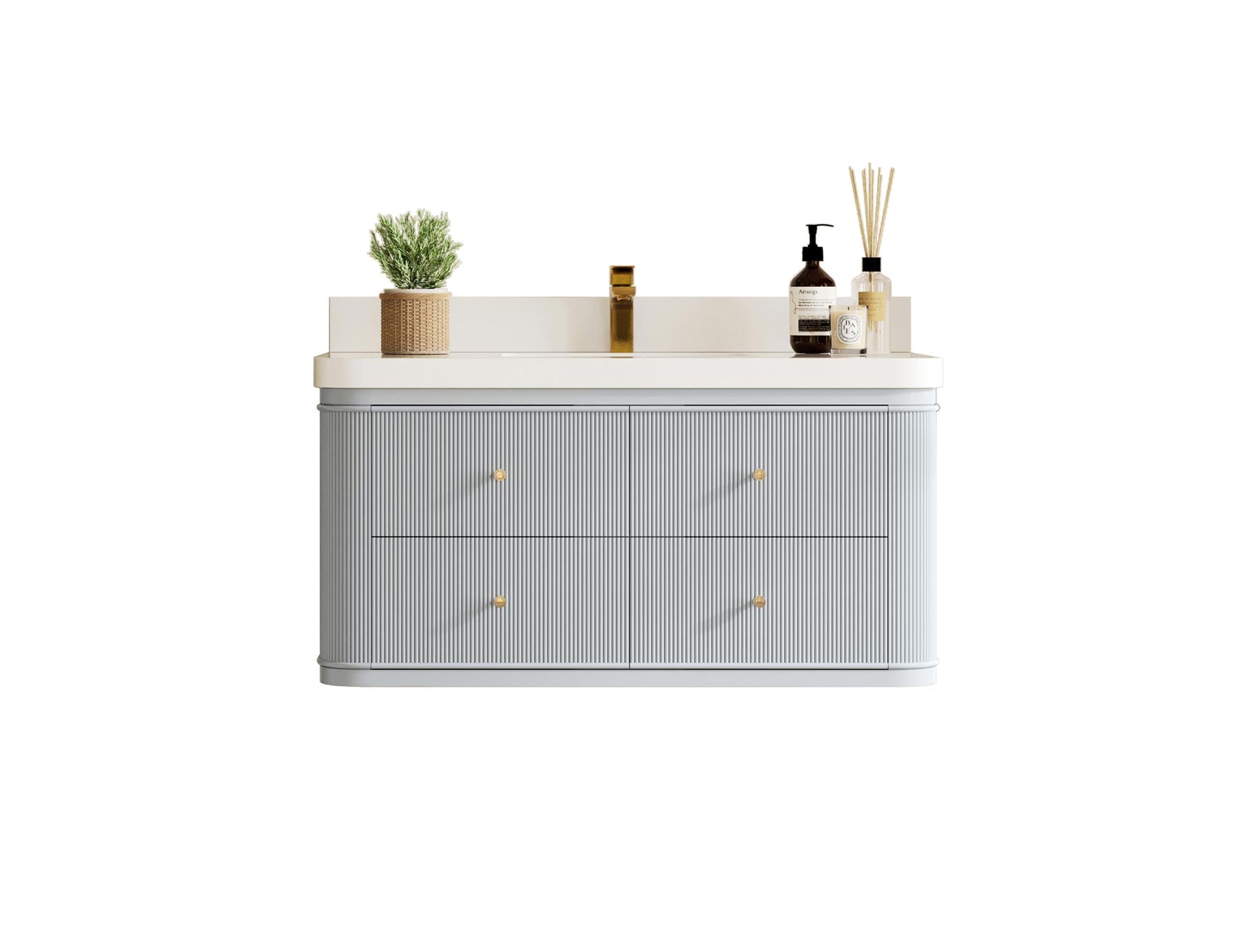 The Hampton Collection embodies understated elegance through its fluted detailing, soft rounded corners, and floating form. This wall-mounted vanity creates an elevated sense of space while offering exceptional storage and organization. Every drawer opens to reveal a thoughtfully designed interior with natural wood compartments, built-in power outlets, and soft-close hardware for a seamless experience.