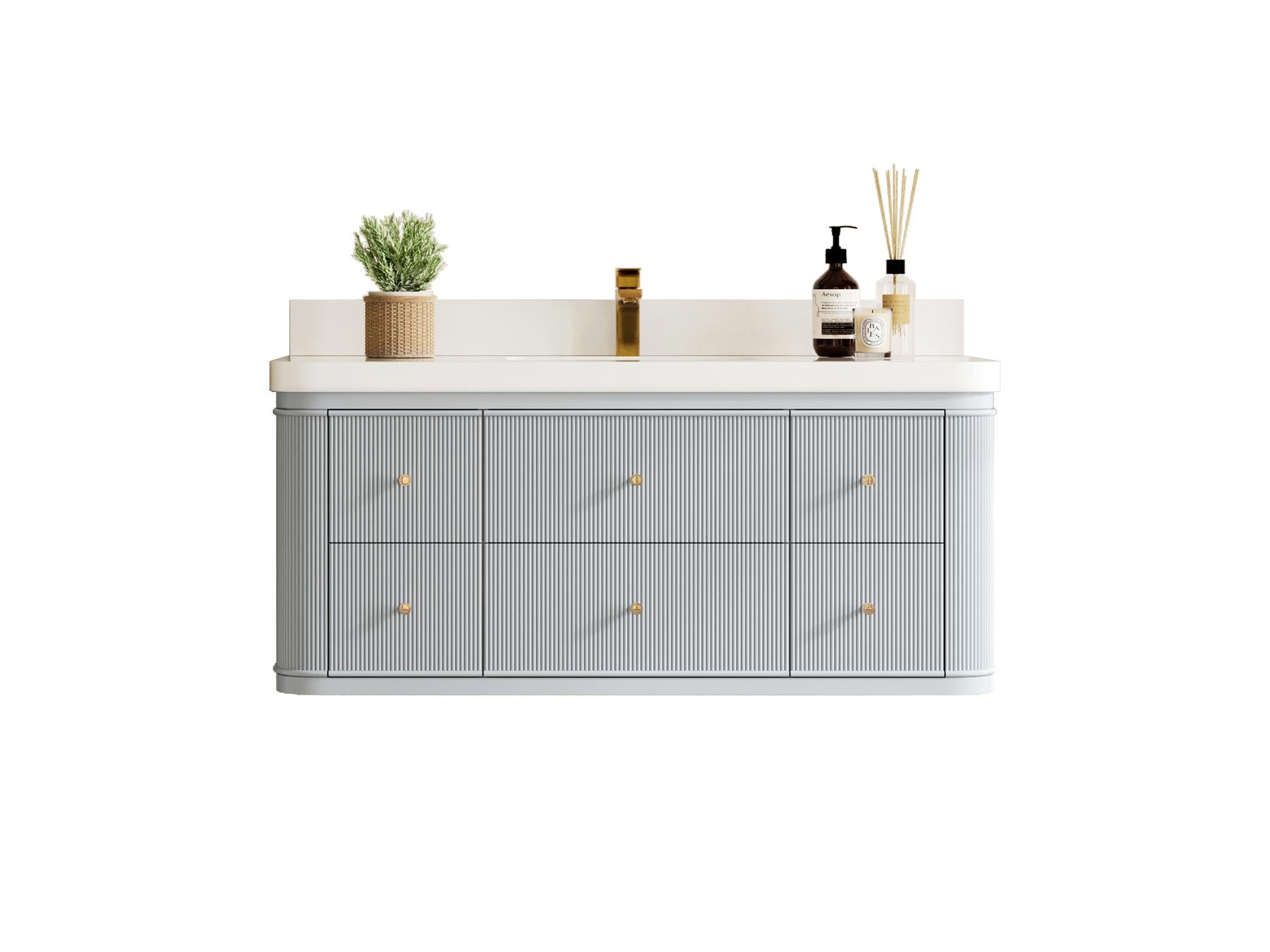 The Hampton Collection embodies understated elegance through its fluted detailing, soft rounded corners, and floating form. This wall-mounted vanity creates an elevated sense of space while offering exceptional storage and organization. Every drawer opens to reveal a thoughtfully designed interior with natural wood compartments, built-in power outlets, and soft-close hardware for a seamless experience.
