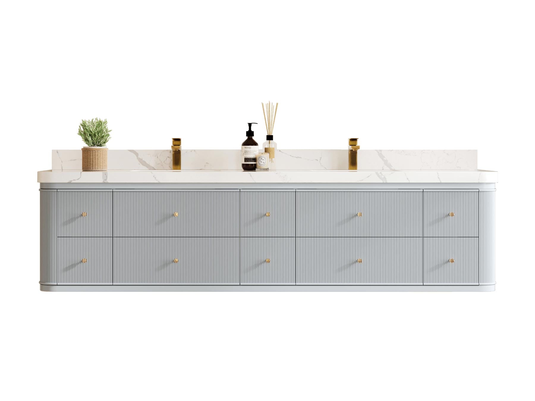 Vanity Countertops options: For Calacatta Laza Quartz, Calacatta Gold Quartz, Empira White Quartz, Pure White Quartz, Palissandro Quartz, Calacatta Nuvo Quartz, Carrara Marble, Carrara Quartz, Calacatta Sienna Quartz, Terrazzo Arctic Breeze, Terrazzo Golden Dusk we have Rounded - Edge option.