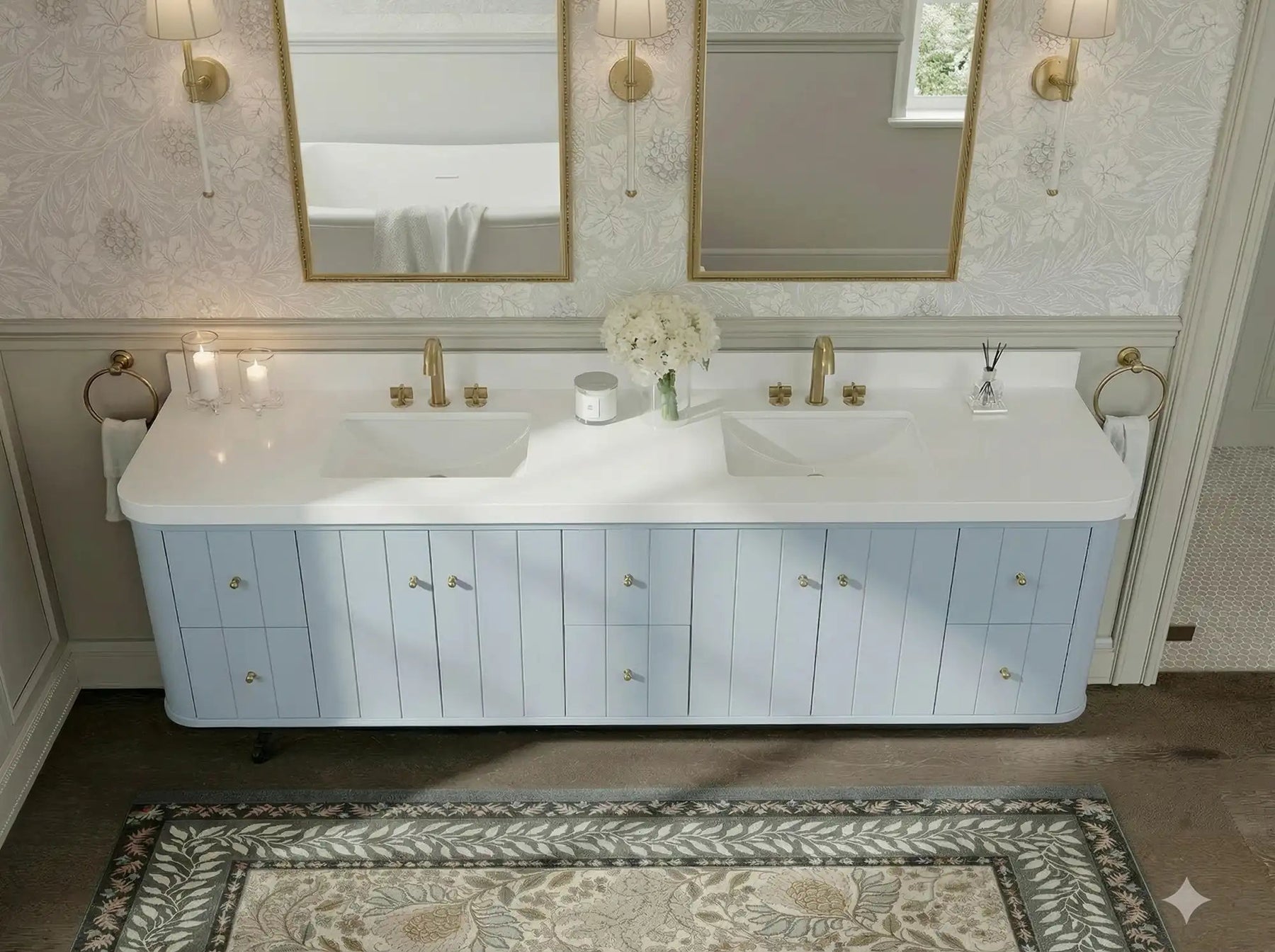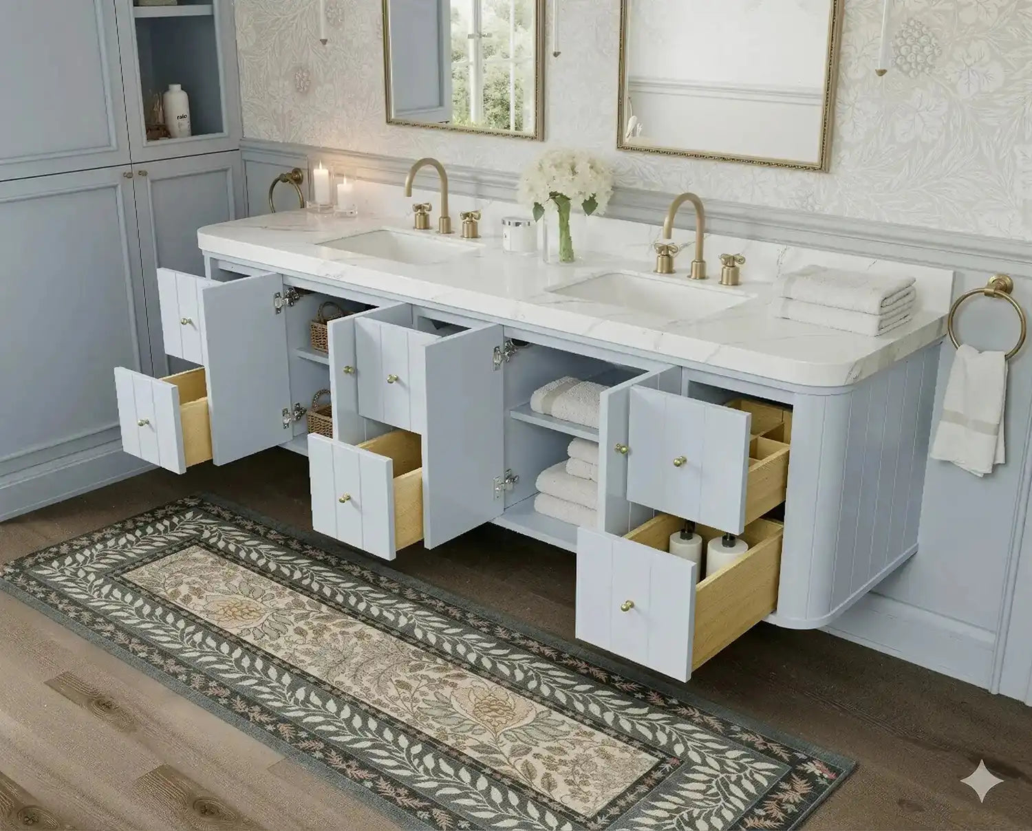 Vanity Countertops options: For Calacatta Laza Quartz, Calacatta Gold Quartz, Empira White Quartz, Pure White Quartz, Palissandro Quartz, Calacatta Nuvo Quartz, Carrara Marble, Carrara Quartz, Calacatta Sienna Quartz, Terrazzo Arctic Breeze, Terrazzo Golden Dusk we have Rounded - Edge option.