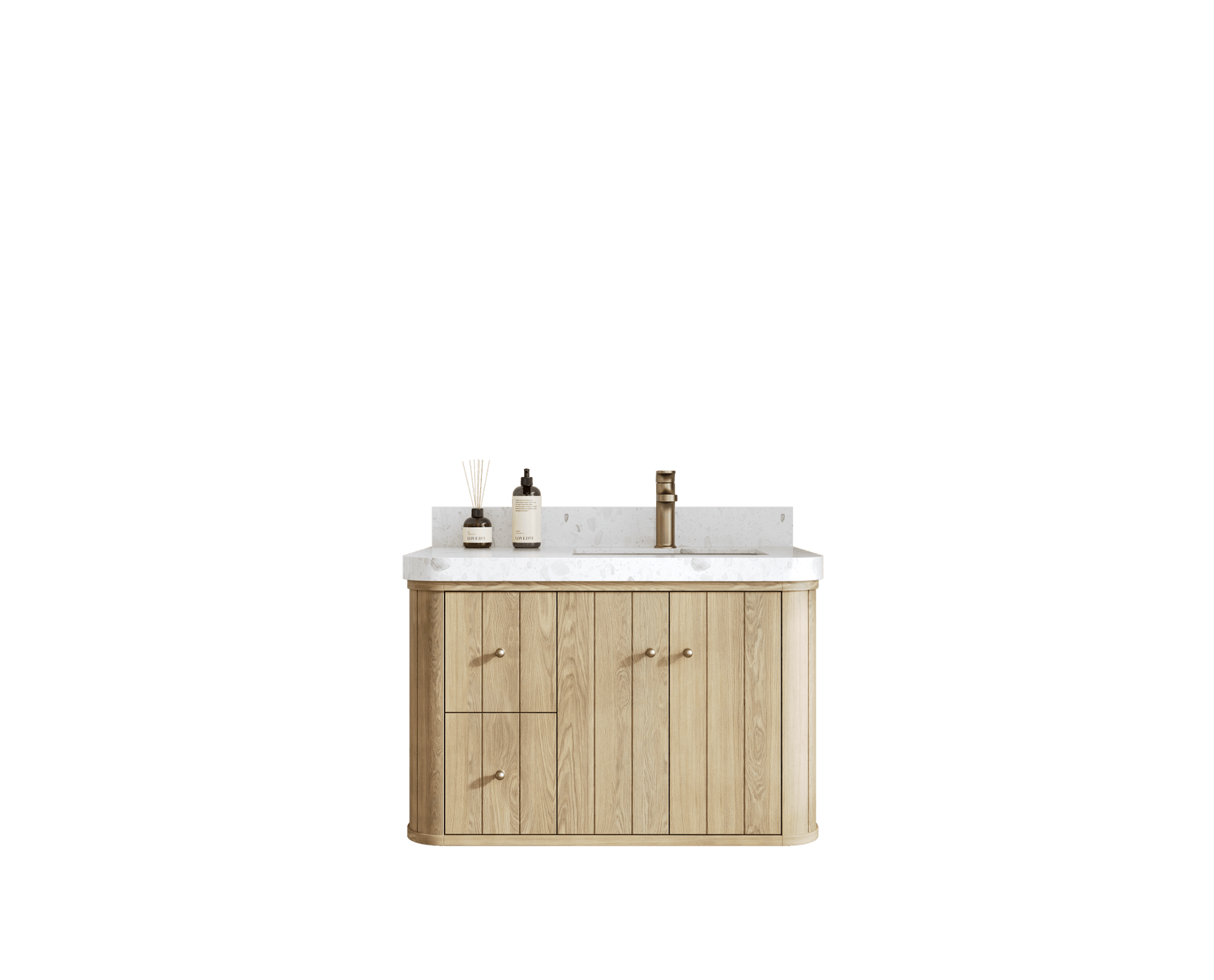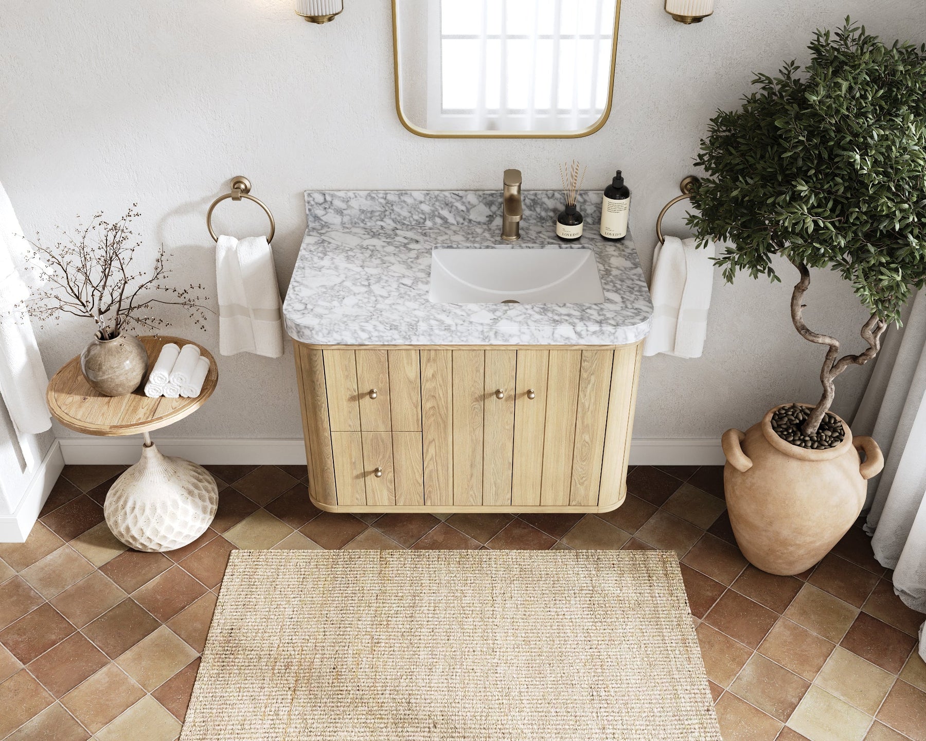 Vanity Countertops options: For Calacatta Laza Quartz, Calacatta Gold Quartz, Empira White Quartz, Pure White Quartz, Palissandro Quartz, Calacatta Nuvo Quartz, Carrara Marble, Carrara Quartz, Calacatta Sienna Quartz, Terrazzo Arctic Breeze, Terrazzo Golden Dusk we have Rounded - Edge option.