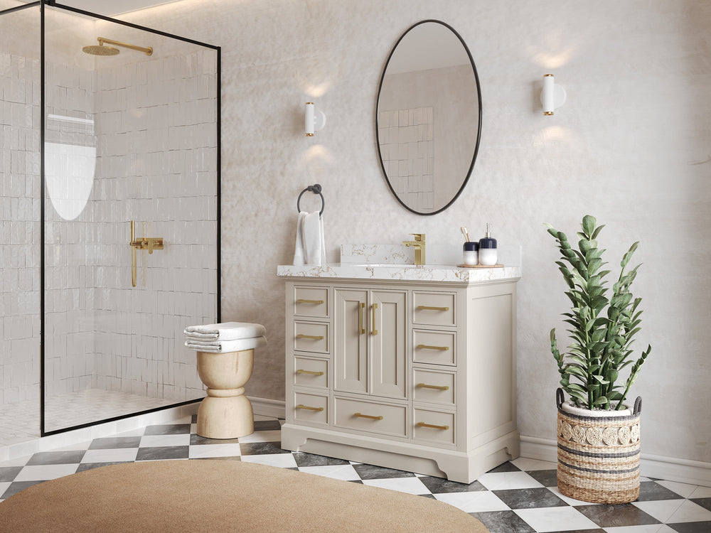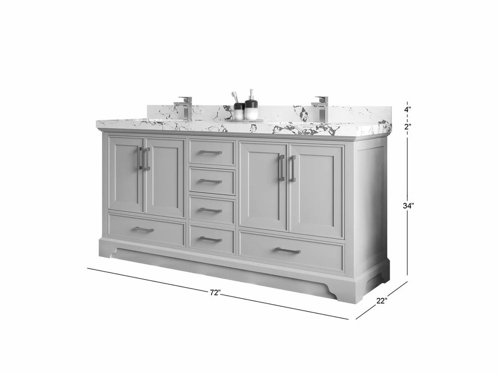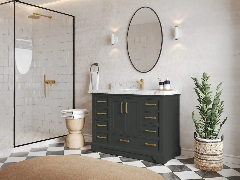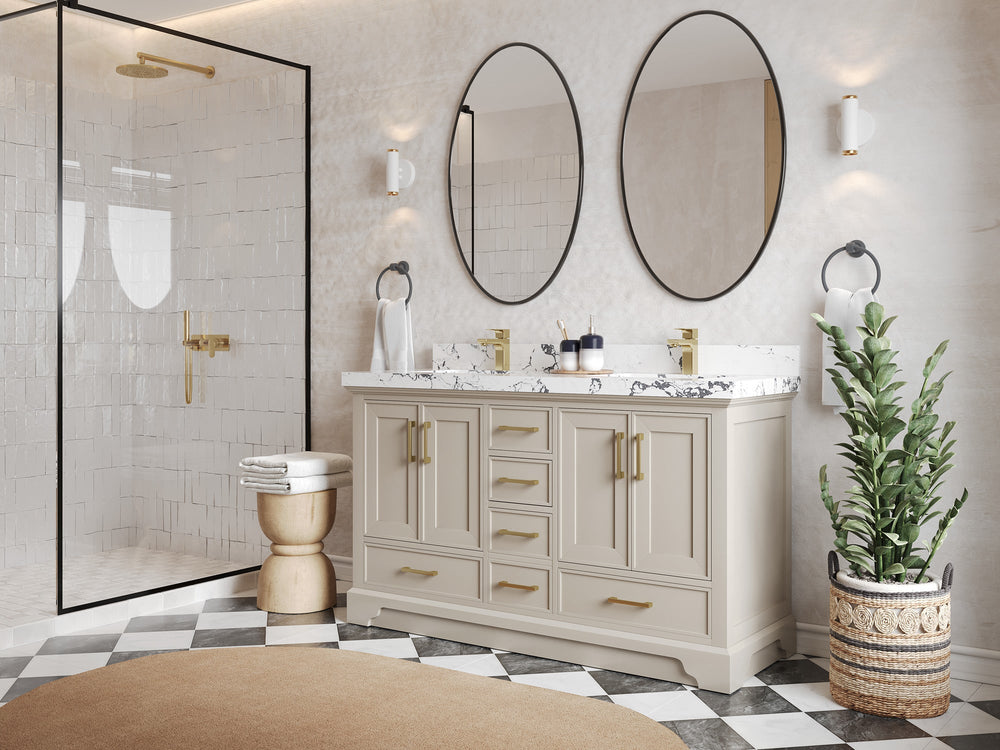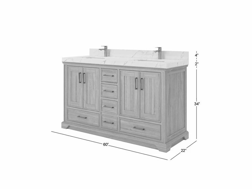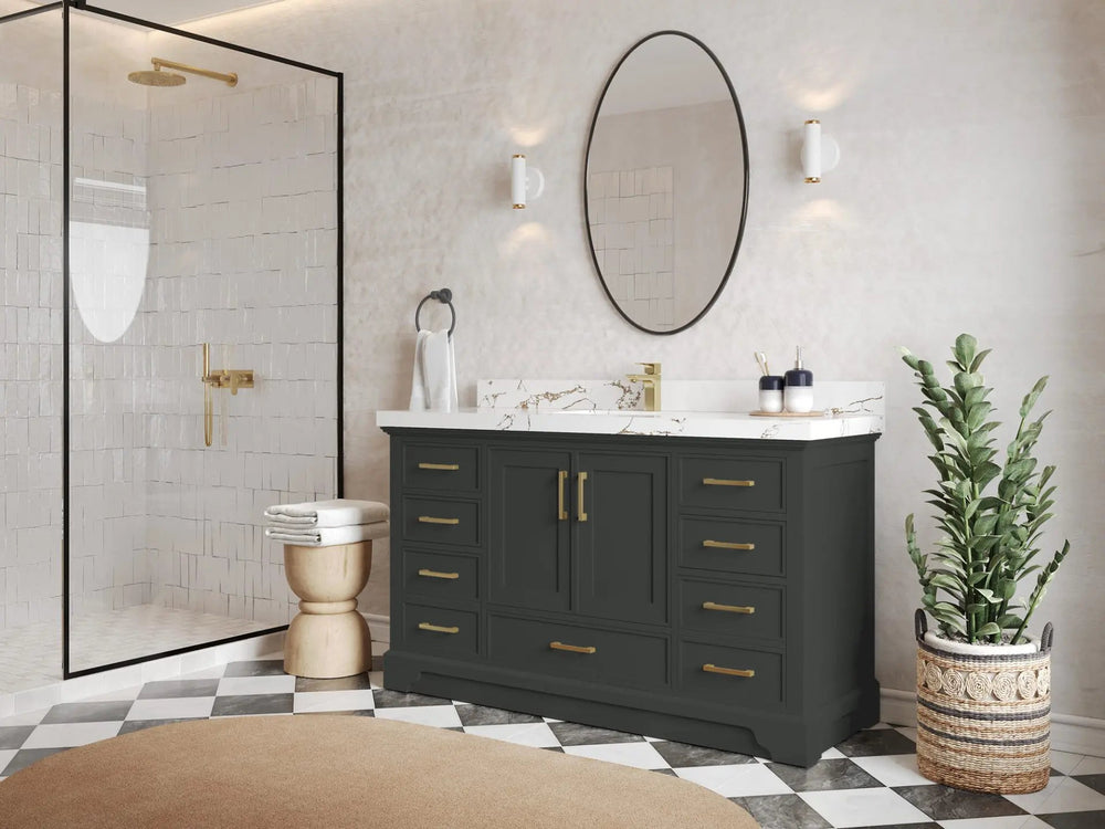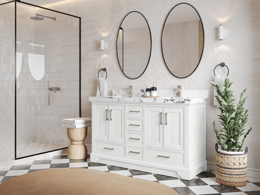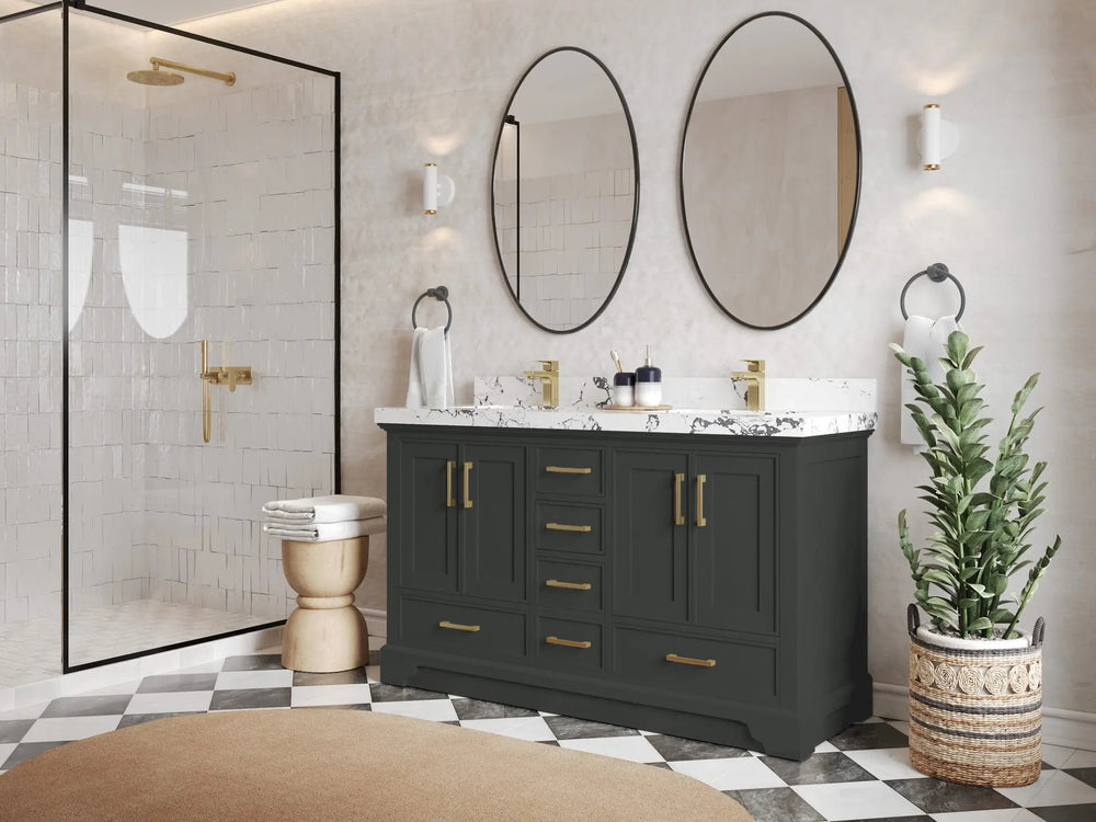 Included: Vanity base (fully assembled), stone top, backsplash/low riser (where applicable), undermount sink(s), pre‑drilling, hardware, and (on specified configurations) power/USB drawer + organizer.