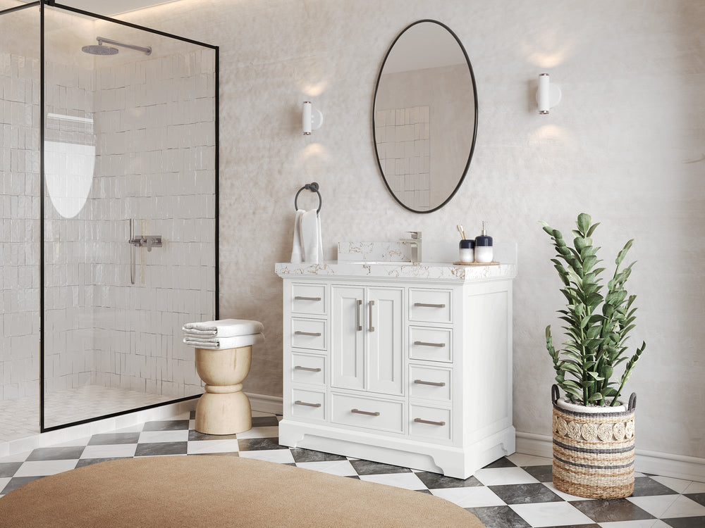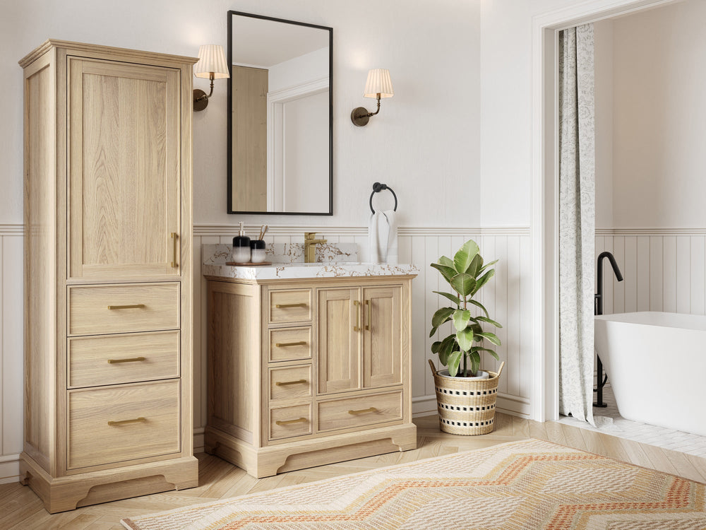 The Charlotte™ collection pairs a slim shaker profile (narrow shaker frame for a crisp transitional look) with furniture‑grade construction and modern utility. Choose White Oak, Teak, or painted finishes; pair with quartz, marble, or Taj Mahal quartzite tops. Every vanity arrives fully assembled with dovetail, soft‑close drawers, adjustable shelf, undermount sink(s), and your choice of single‑hole or 8" widespread faucet drilling (4" centerset available by special request). Add our USB/AC power drawer with hair‑dryer organizer to keep tools plugged in yet out of sight.