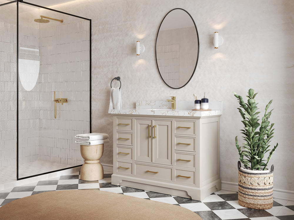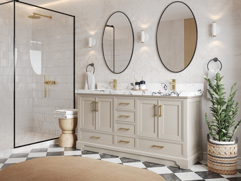 Hardware: Designer knobs/pulls compatible with brass, black, or nickel fixtures.