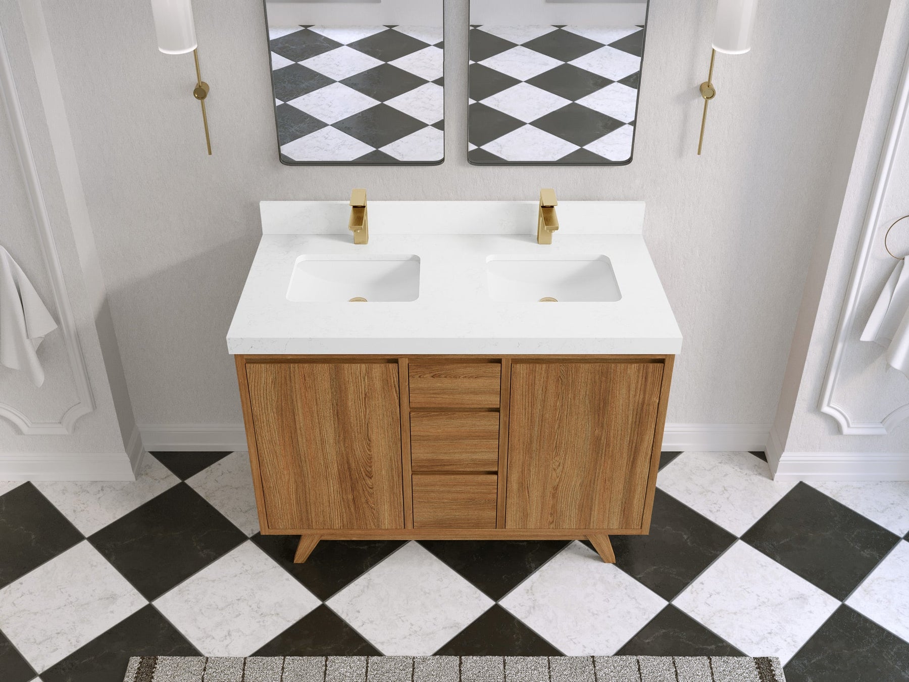 1. Traditional style with a modern twist - made from teak wood, this bathroom vanity features a clean, contemporary design with soft-close hardware and antique brass hardware.