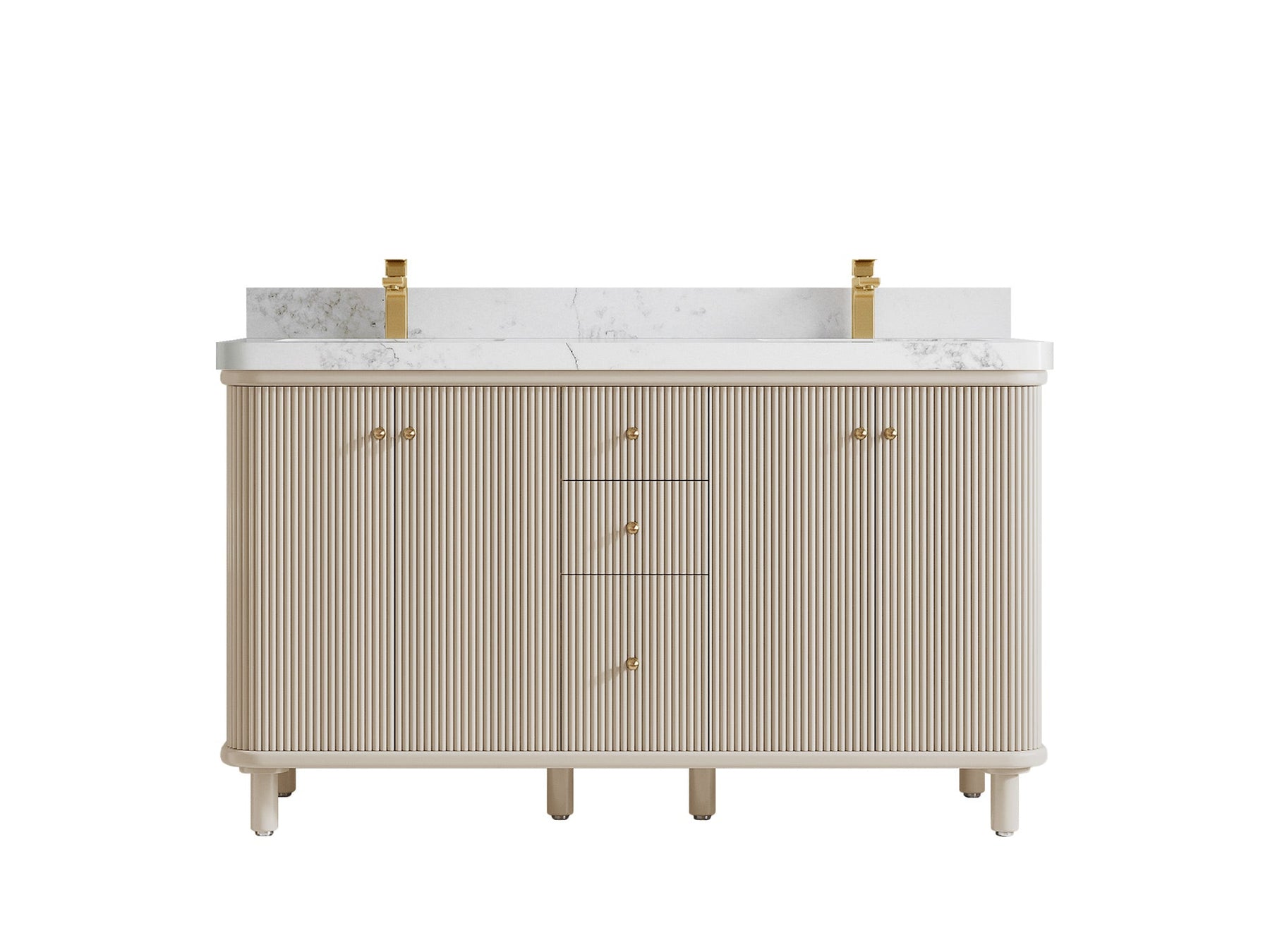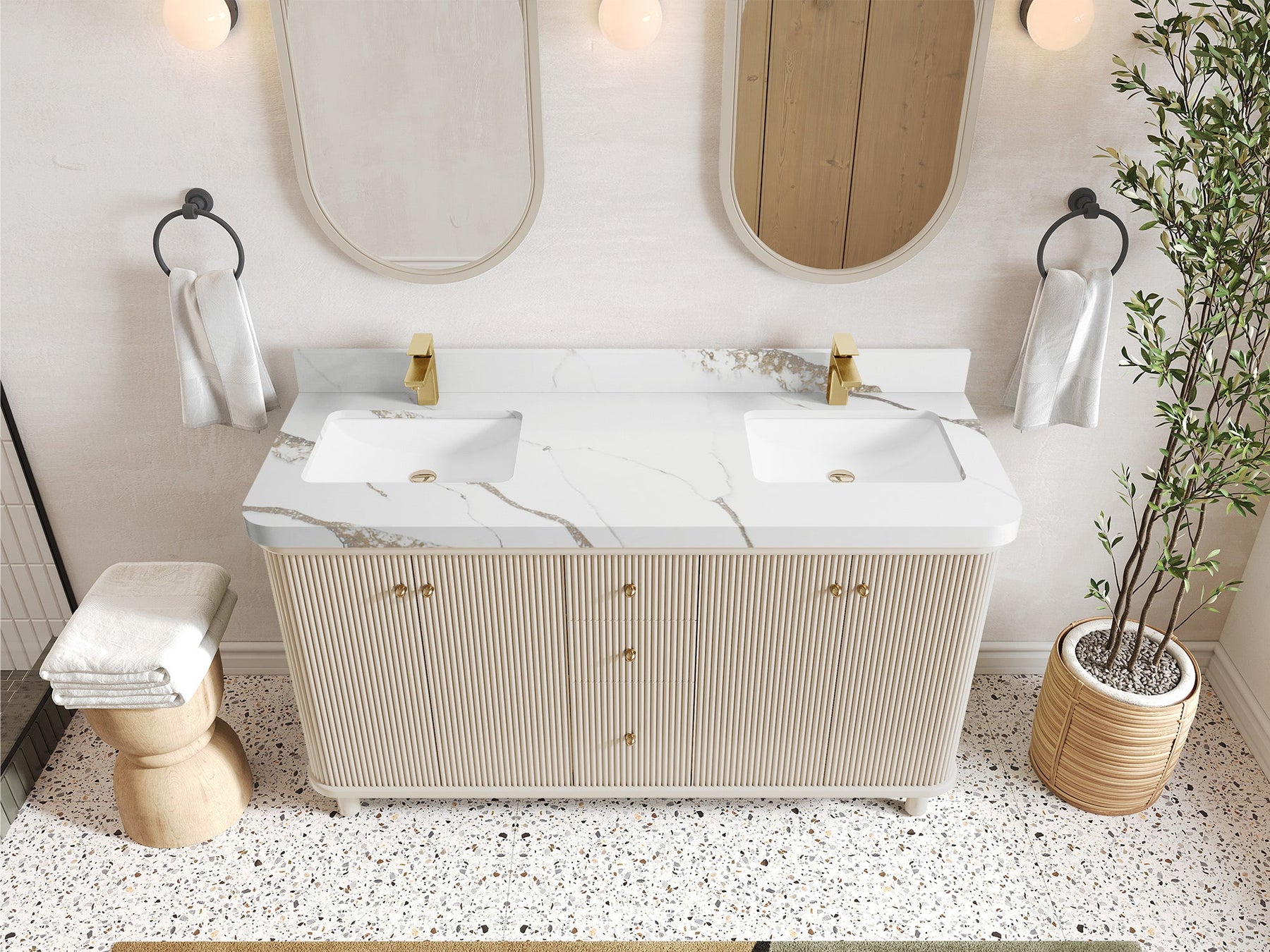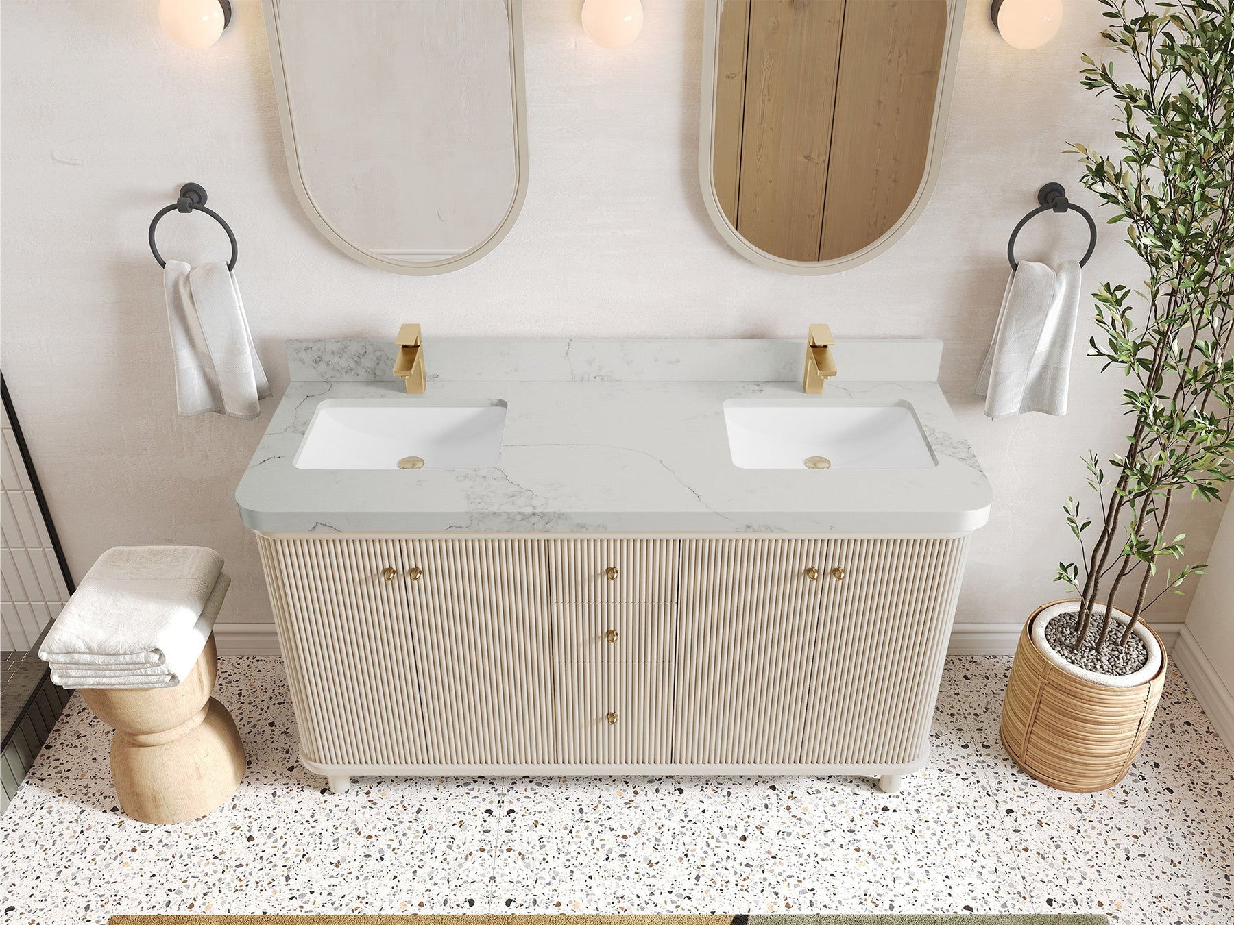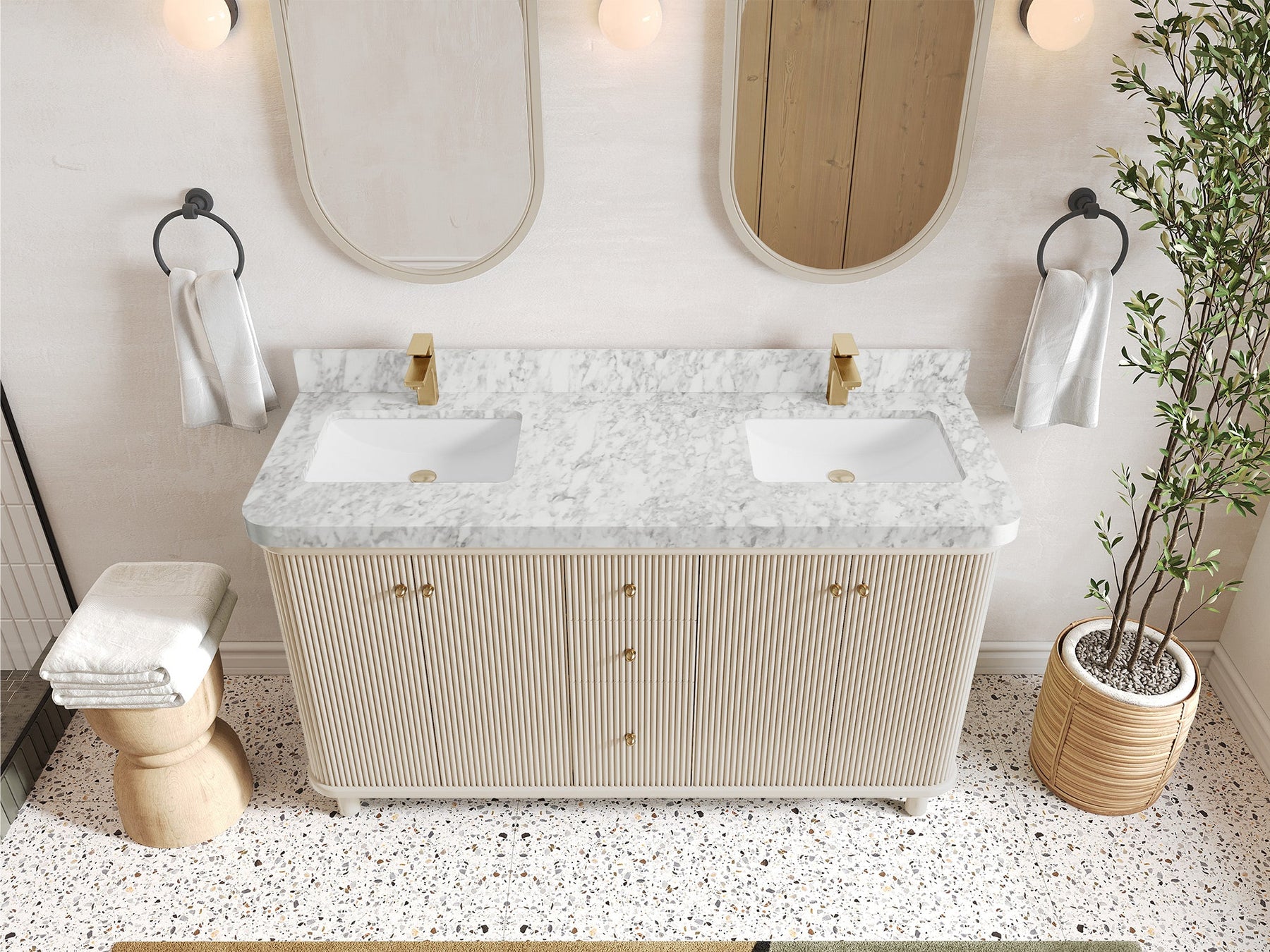Vanity Countertops options: For Calacatta Laza Quartz, Empira White Quartz, Pure White Quartz, Palissandro Quartz, Calacatta Nuvo Quartz, Carrara Quartz, Carrara Marble, Calacatta Gold Quartz, Calacatta Sienna Quartz we have Straight - Mitered Edge option.