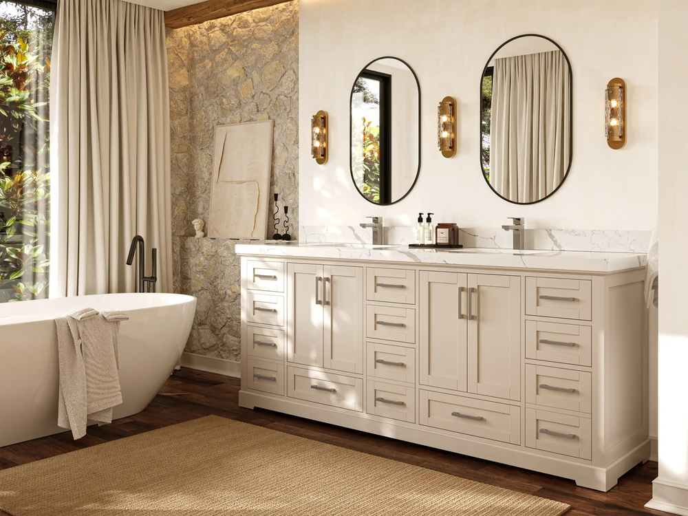 Vanity Countertops options: For Calacatta Laza Quartz, Empira White Quartz, Pure White Quartz, Palissandro Quartz we have 2 options Straight-Mitered Edge and Double Cove Edge; For Calacatta Nuvo Quartz, Carrara Marble, Carrara Quartz, Piatra Gray Quartz, Pearl Light Gray Quartz, Calacatta Black Quartz, Calacatta Gold Quartz, Calacatta Sienna Quartz, Calacatta Poanazzo Quartz, Venatino Quartz, Viola Brown Quartz, Viola Gold Quartz, Viola Night Quartz, Viola Biagio Quartz, Berkshire Brass Quartz, Frosty Carrara Quartz, Onyx Quartz we have Straight - Mitered Edge option.