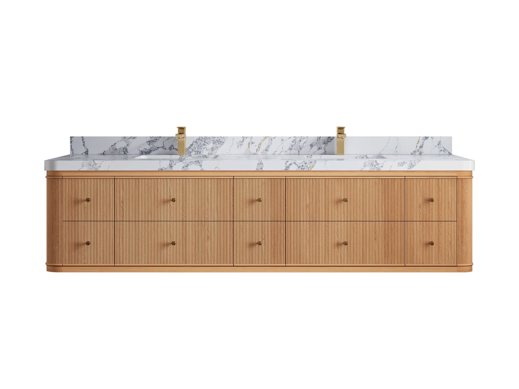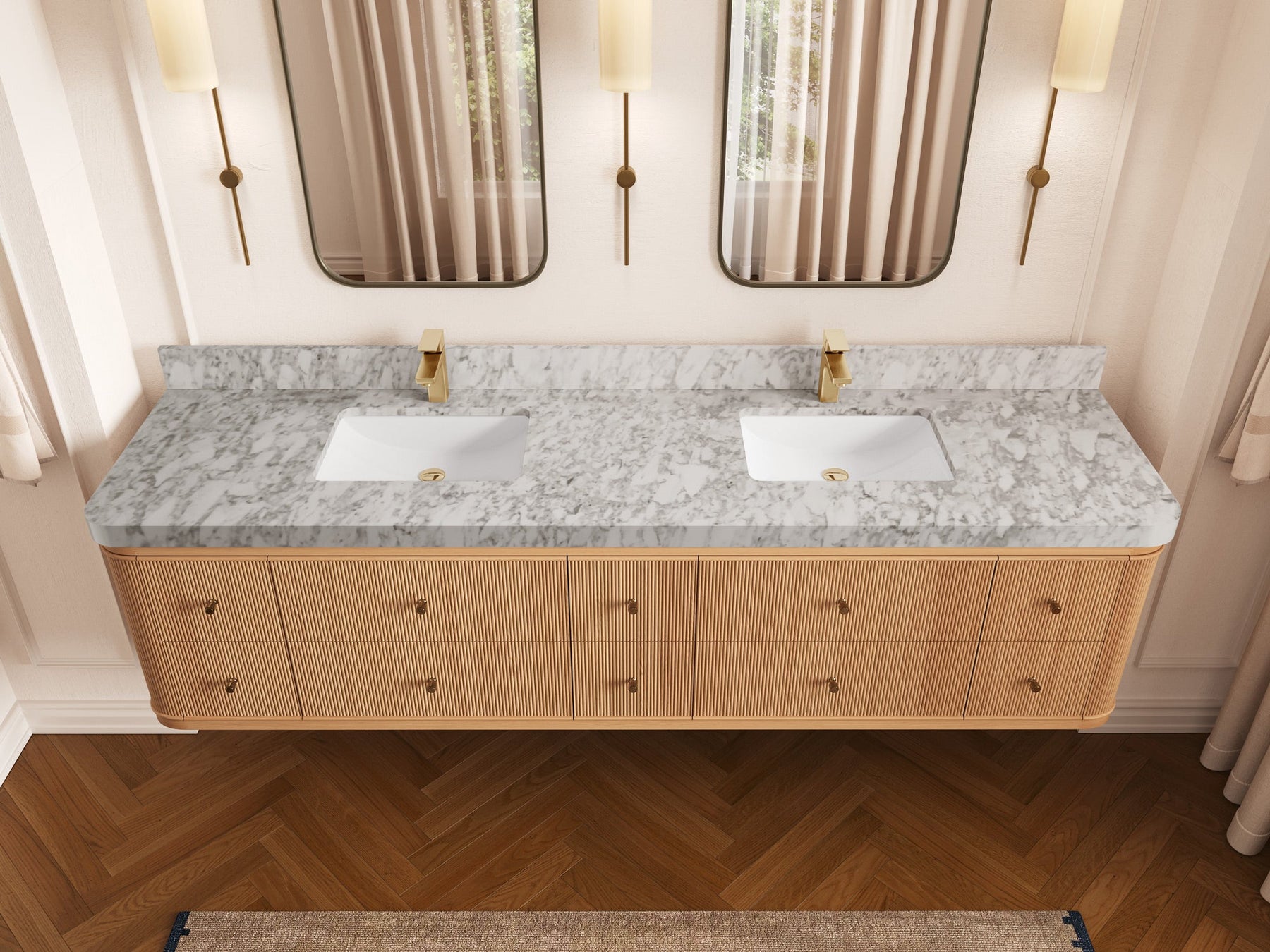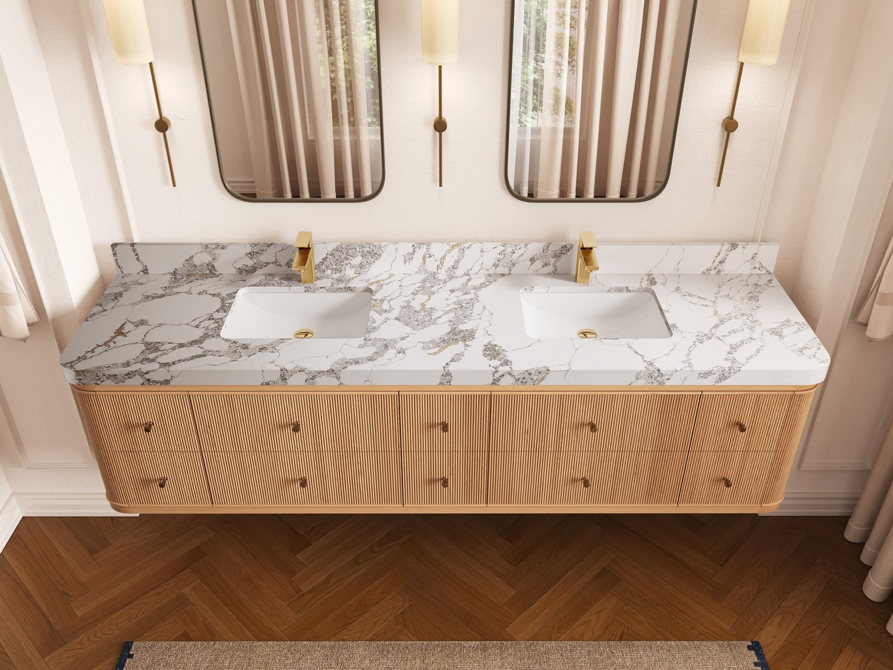 Vanity Countertops options: For Calacatta Laza Quartz, Empira White Quartz, Pure White Quartz, Palissandro Quartz, Calacatta Nuvo Quartz, Carrara Quartz, Calacatta Gold Quartz, Calacatta Sienna Quartz we have Straight - Mitered Edge option.