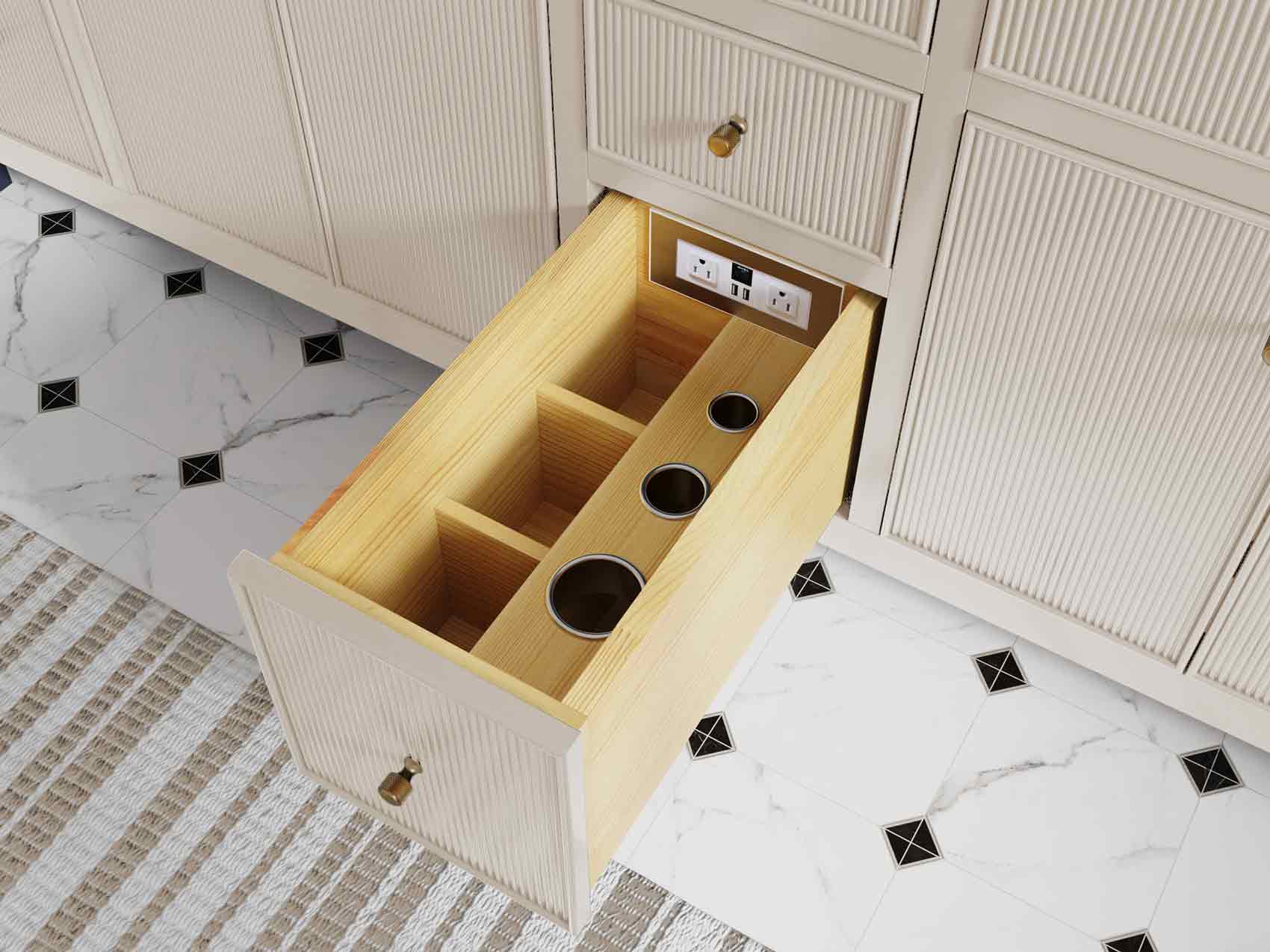 Number of Drawers: 2 Tip Out Drawers, 2 Regular Deep Drawers, 1 Deep Drawer with Power Outlet and Accessories, 6 Regular Drawers