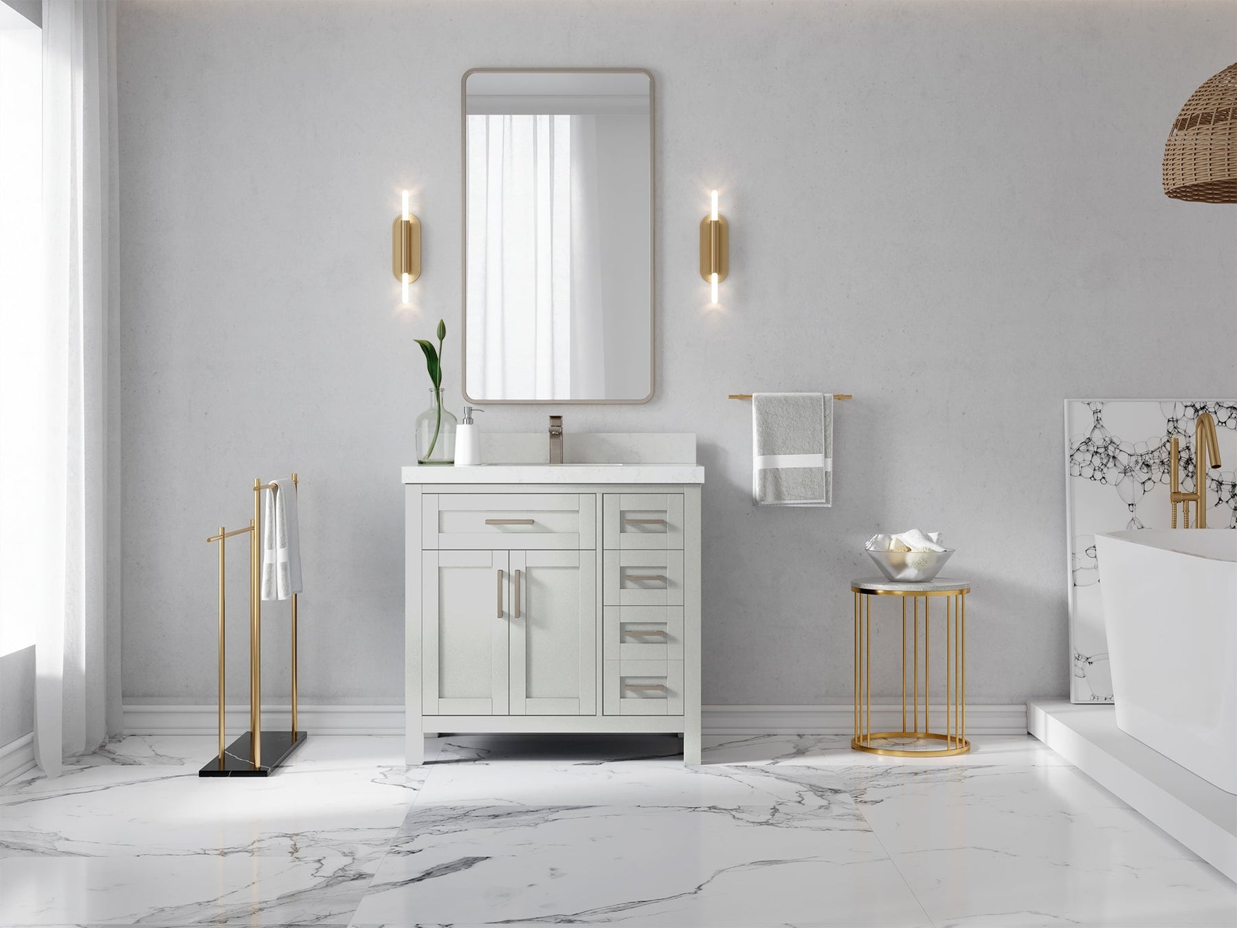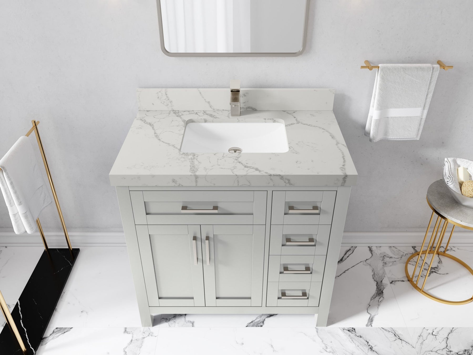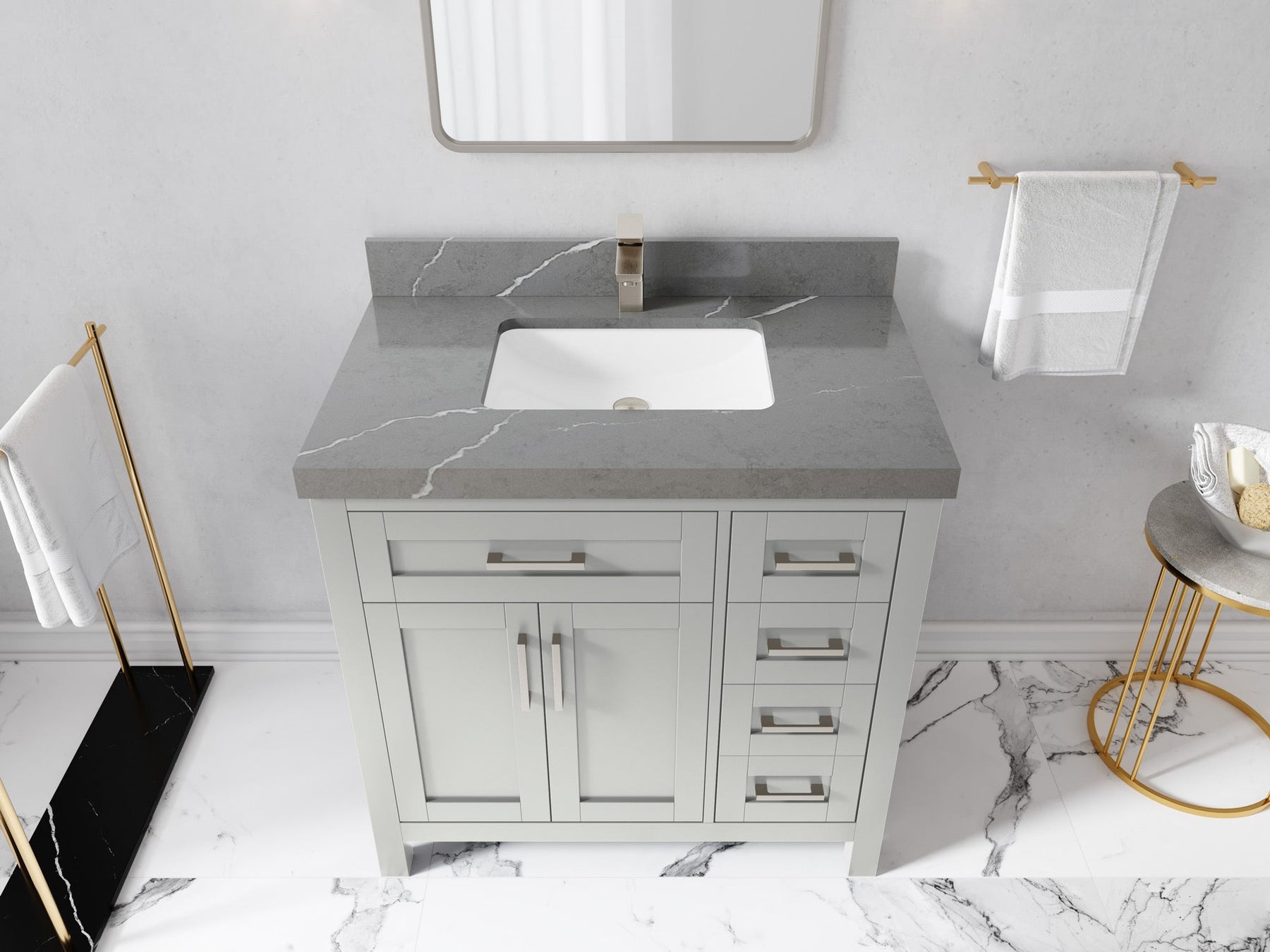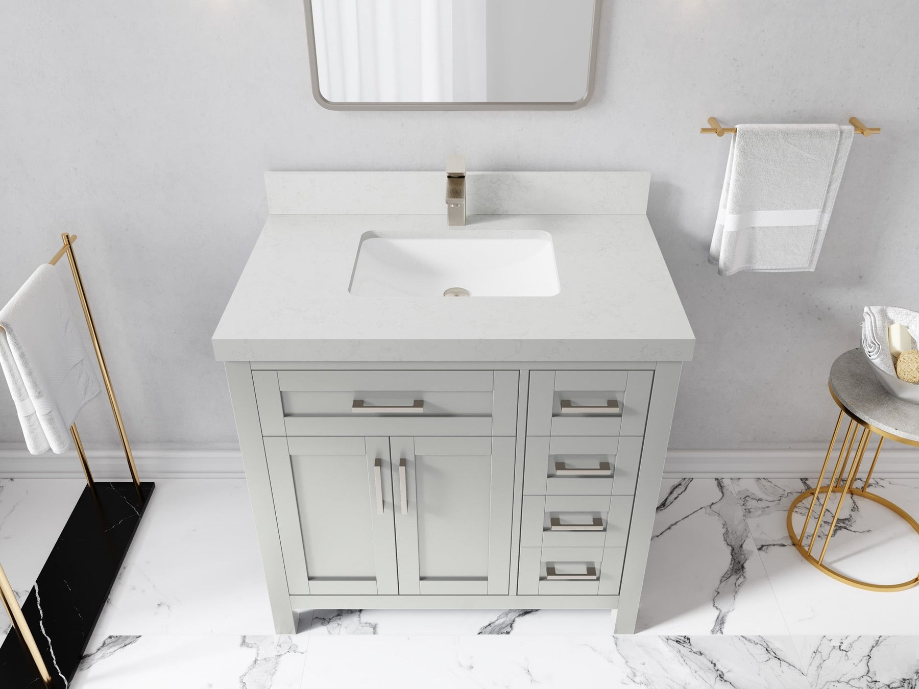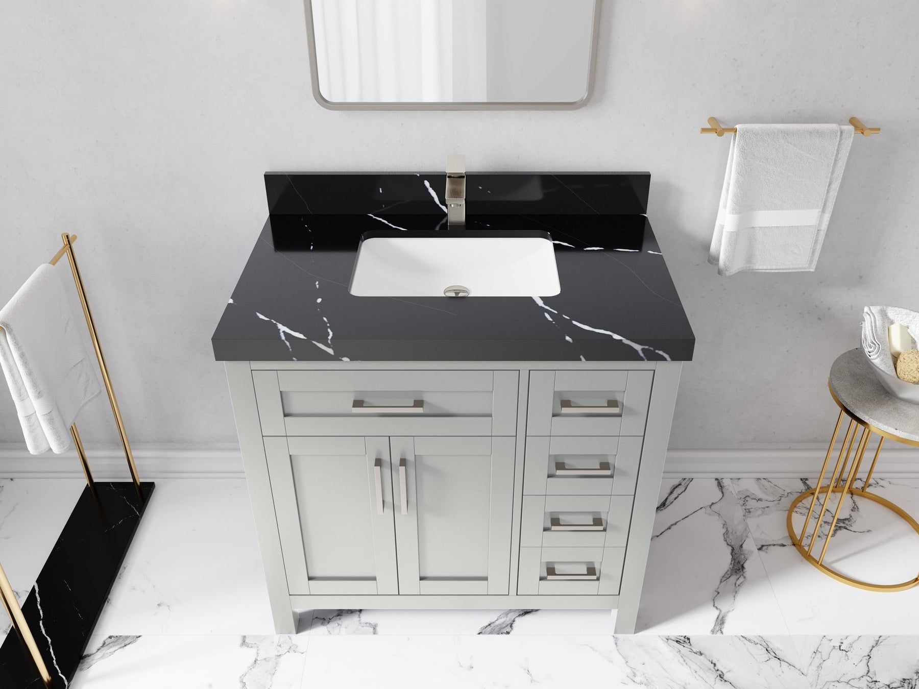 1. Traditional style with a modern twist - made from birch tree and plywood, this bathroom vanity features a clean, contemporary design with soft-close hardware and gold and nickel brushed hardware.
