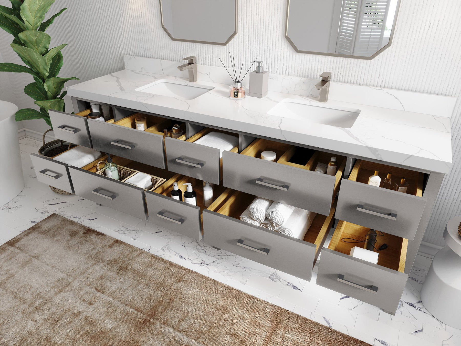 Vanity Countertops options: For Calacatta Laza Quartz, Empira White Quartz, Pure White Quartz, Palissandro Quartz we have 2 options Straight-Mitered Edge and Double Cove Edge; For Calacatta Nuvo Quartz, Carrara Marble, Carrara Quartz, Piatra Gray Quartz, Pearl Light Gray Quartz, Calacatta Black Quartz, Calacatta Gold Quartz, Calacatta Sienna Quartz, Calacatta Poanazzo Quartz, Venatino Quartz, Viola Brown Quartz, Viola Gold Quartz, Viola Night Quartz, Viola Biagio Quartz, Berkshire Brass Quartz, Frosty Carrara Quartz, Onyx Quartz we have Straight - Mitered Edge option.