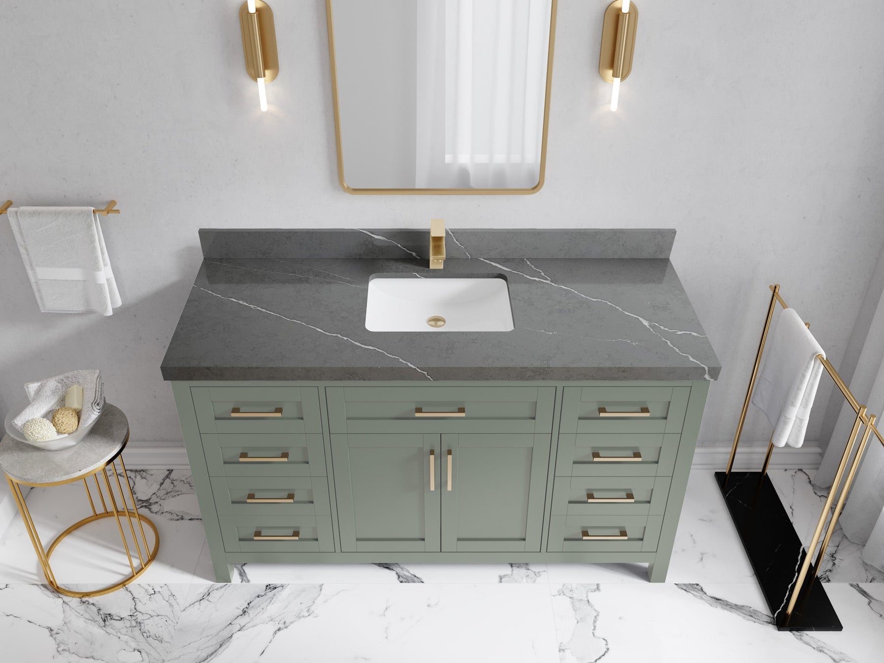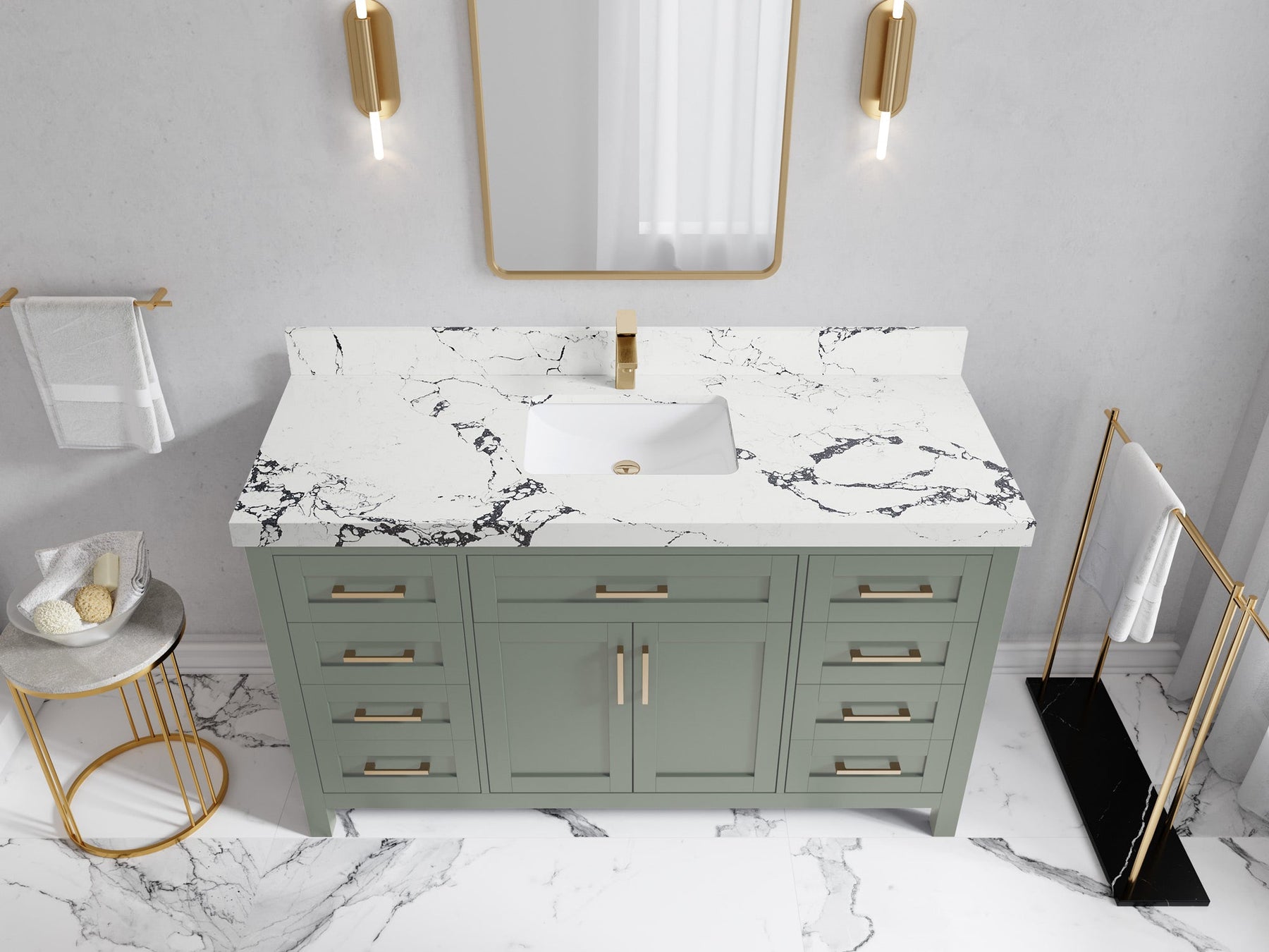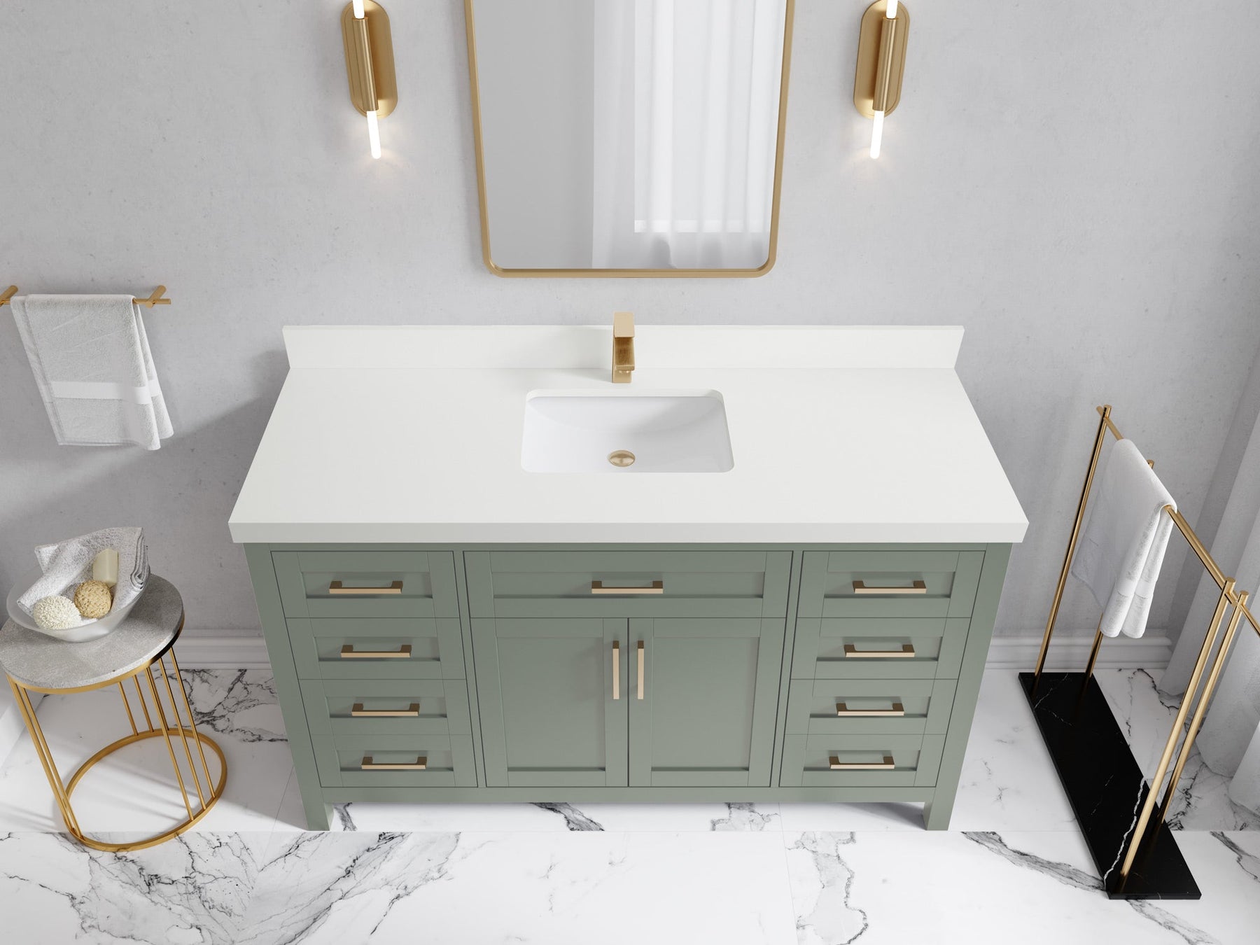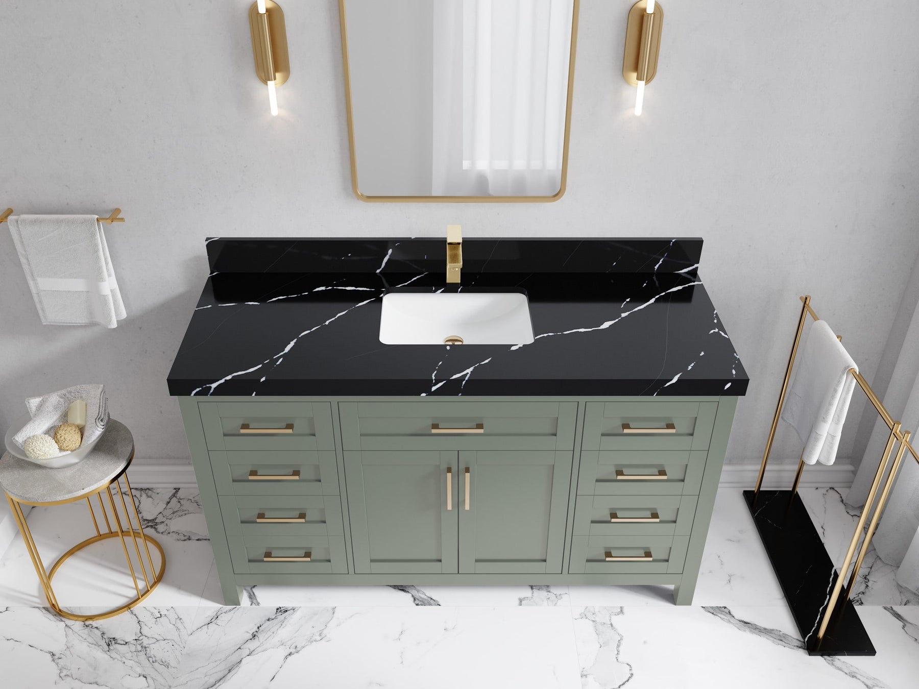 1. Traditional style with a modern twist - made from birch tree and plywood, this bathroom vanity features a clean, contemporary design with soft-close hardware and gold and nickel brushed hardware.