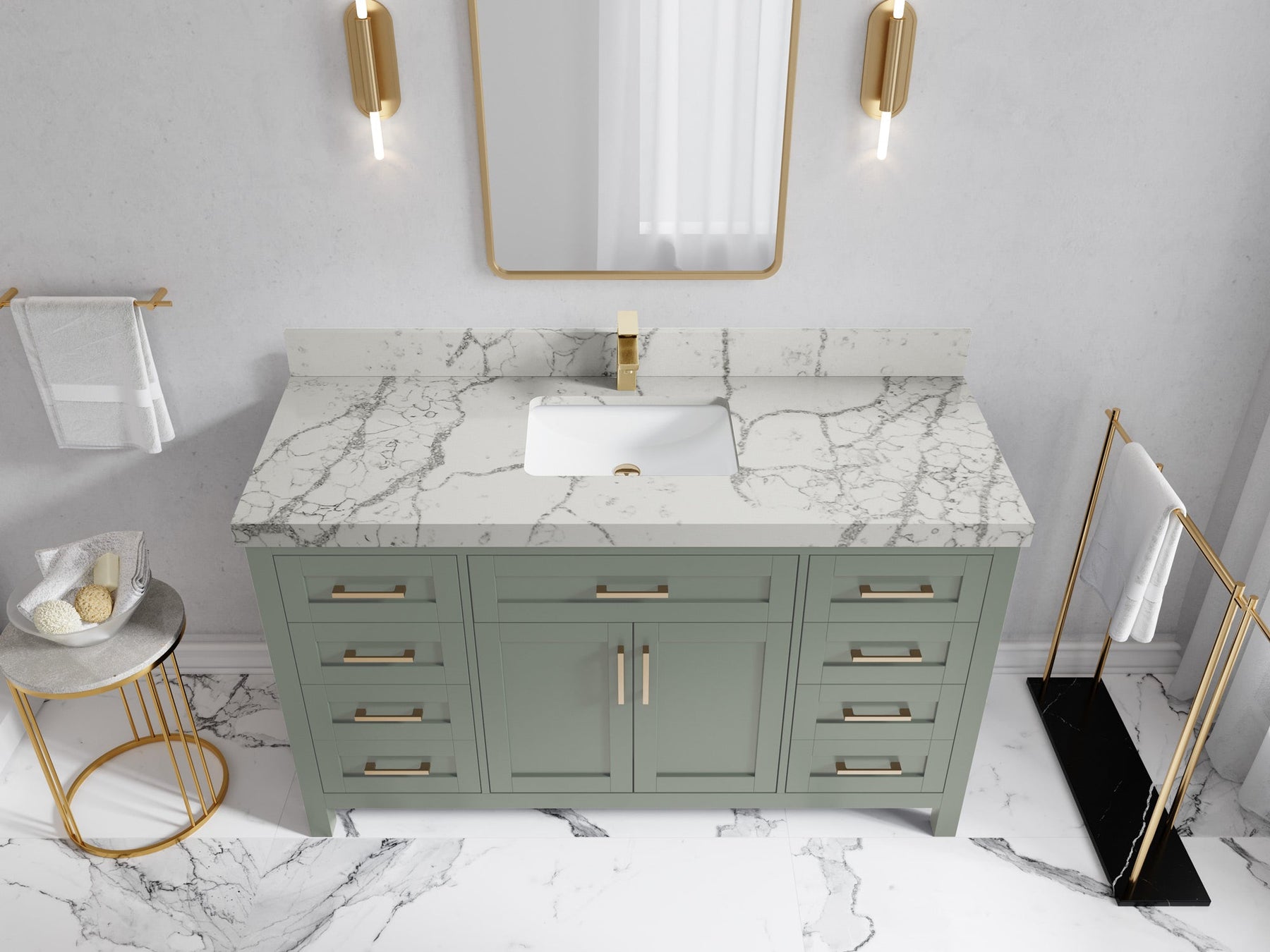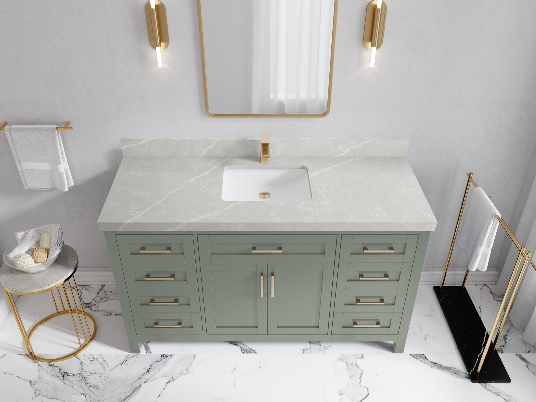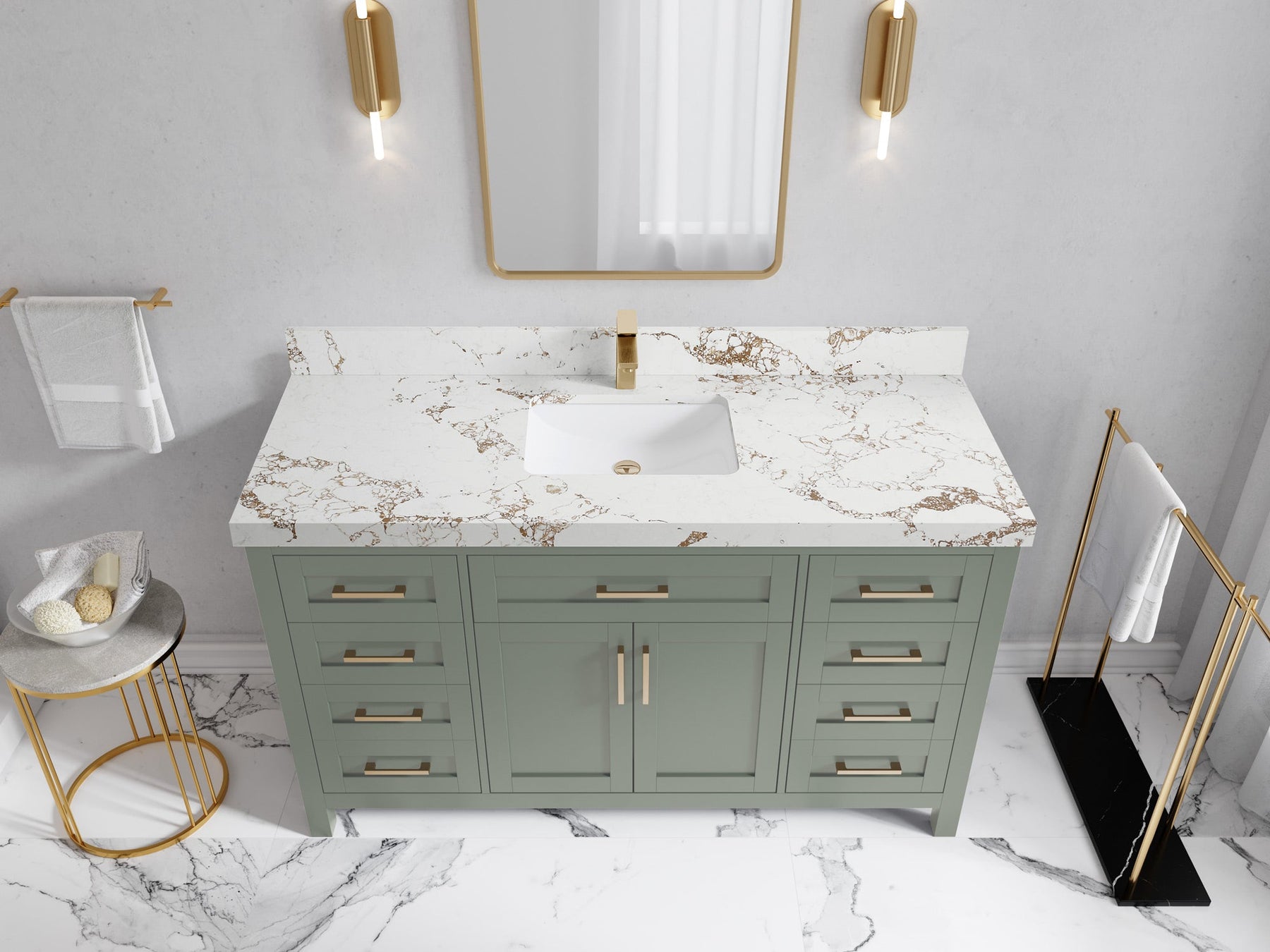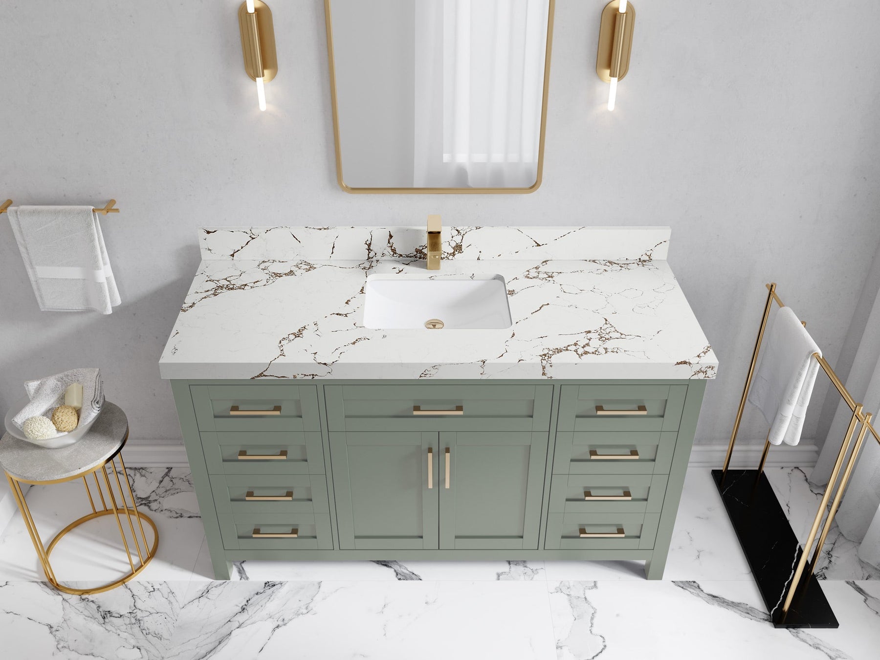 1. Traditional style with a modern twist - made from birch tree and plywood, this bathroom vanity features a clean, contemporary design with soft-close hardware and gold and nickel brushed hardware.