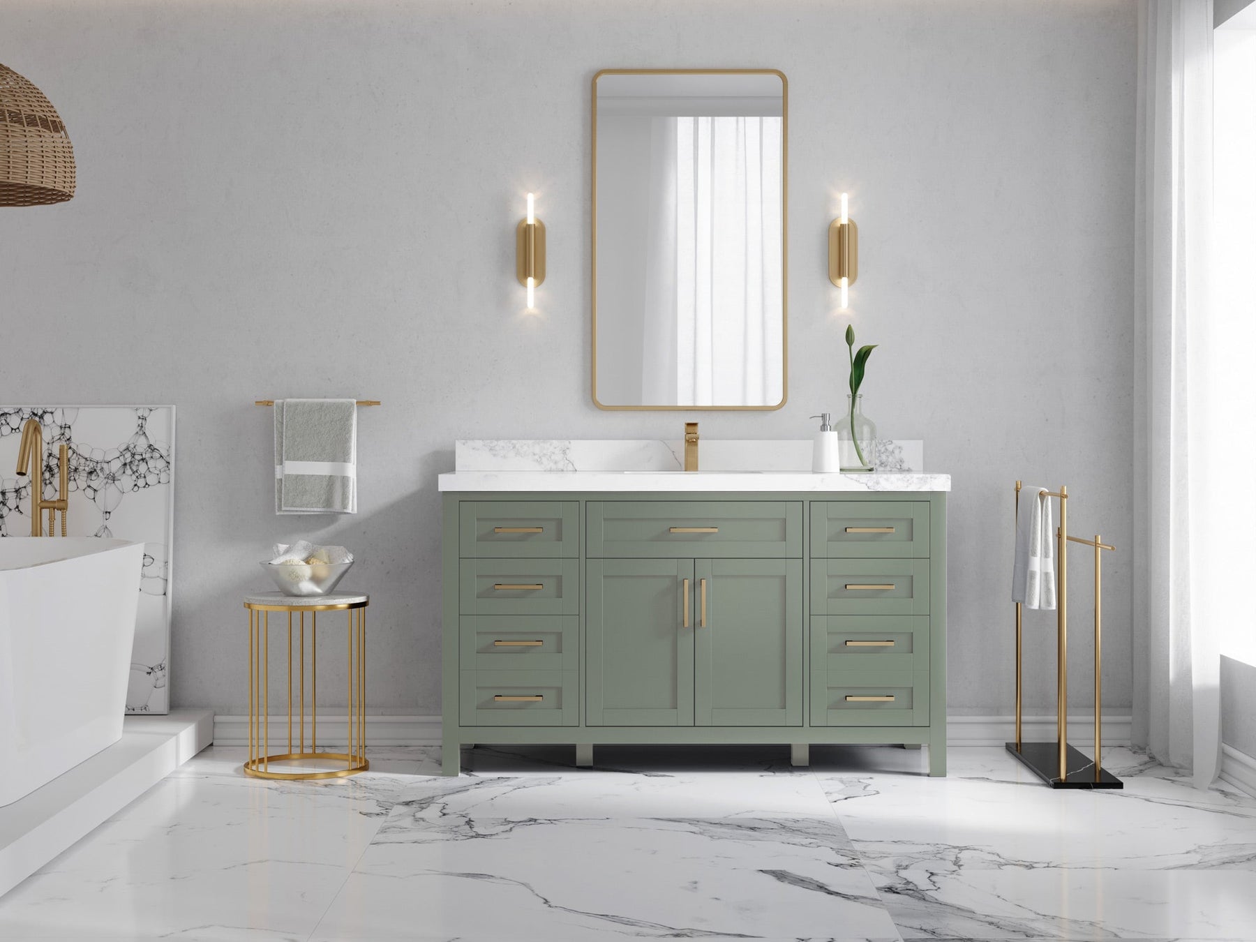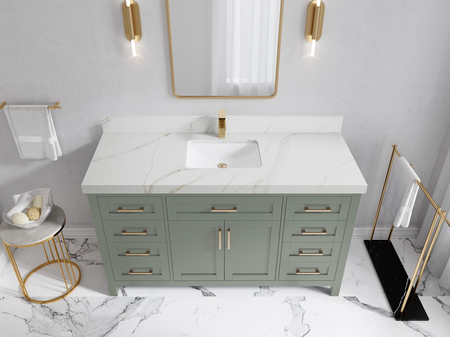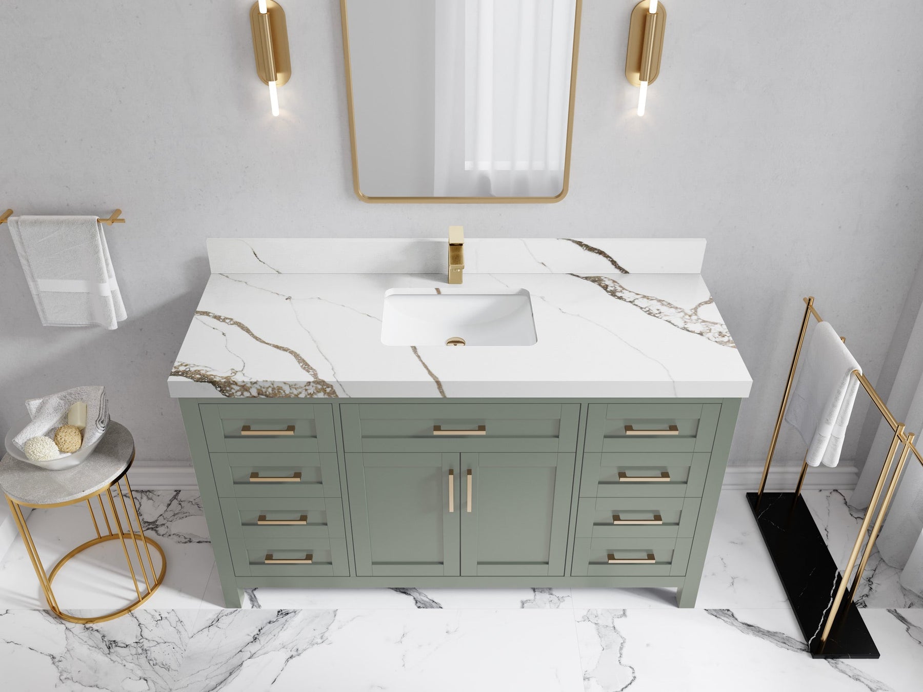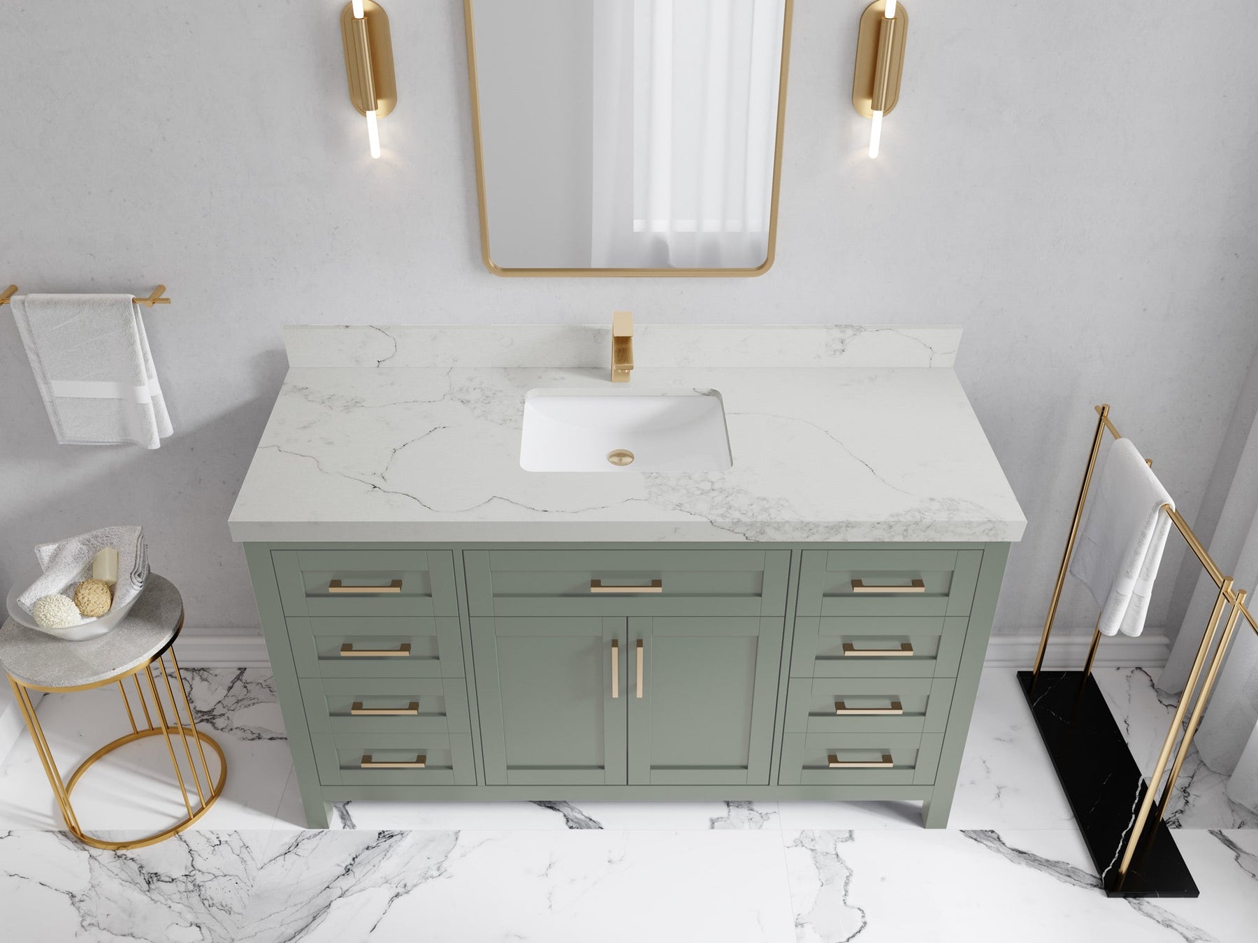 1. Traditional style with a modern twist - made from birch tree and plywood, this bathroom vanity features a clean, contemporary design with soft-close hardware and gold and nickel brushed hardware.