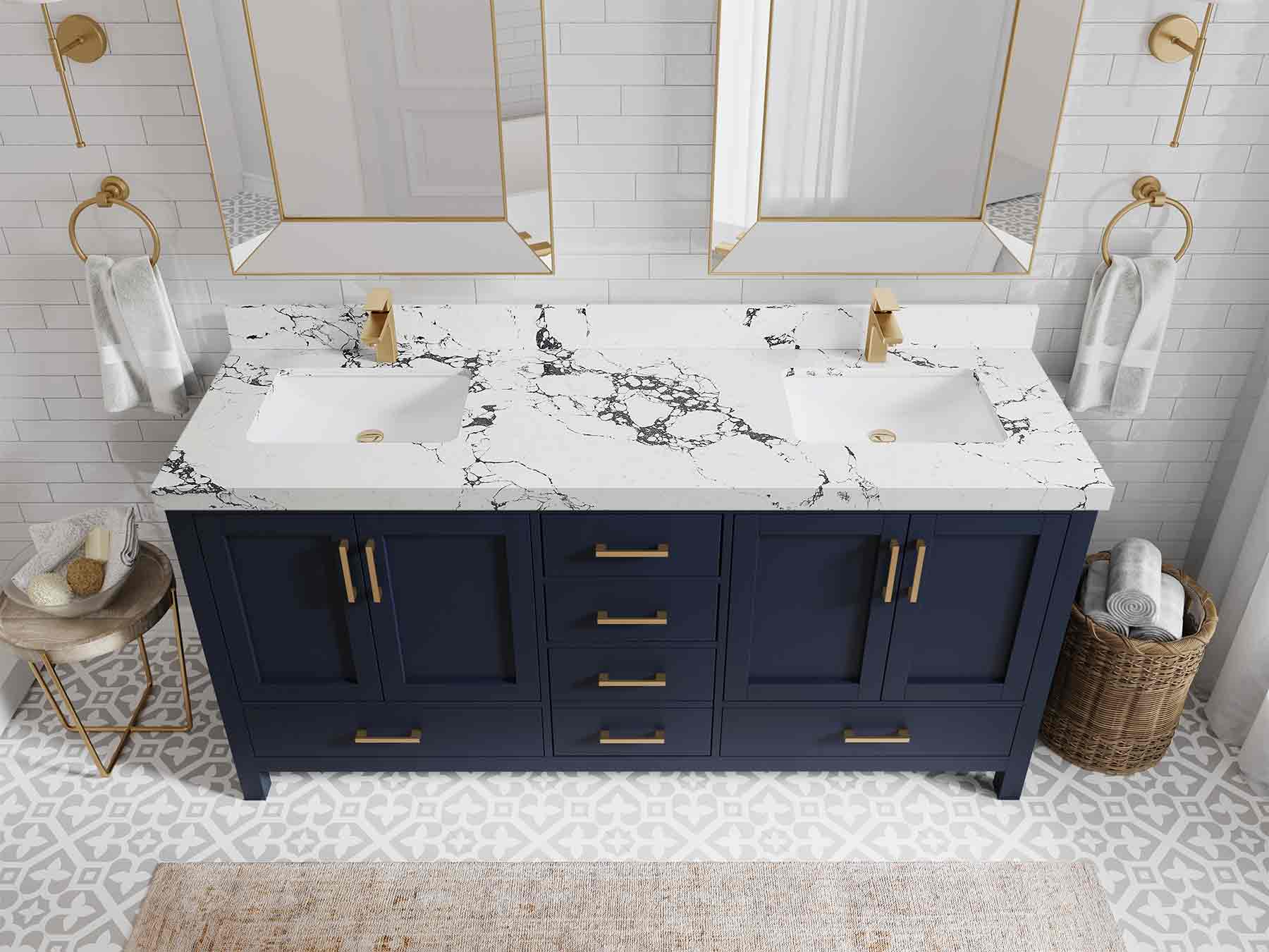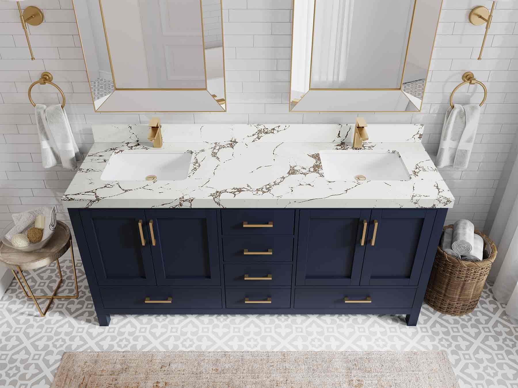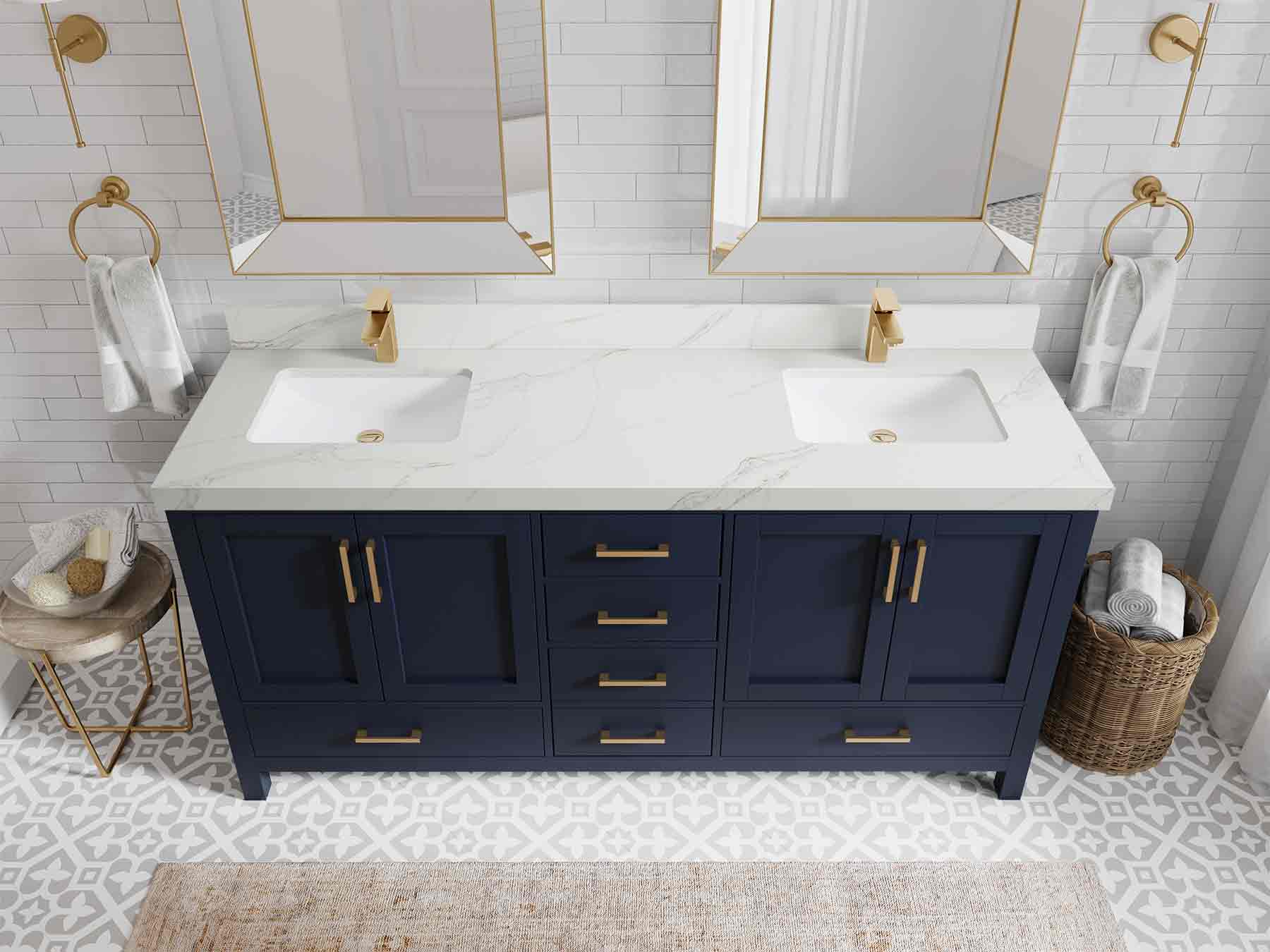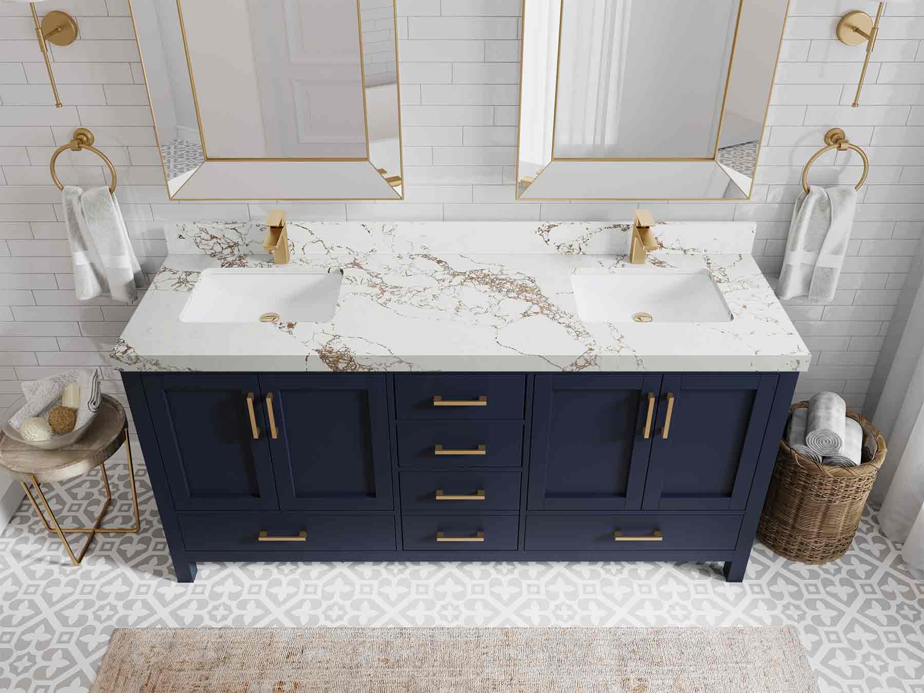 1. Traditional style with a modern twist - made from birch tree and plywood, this bathroom vanity features a clean, contemporary design with soft-close hardware and gold and nickel brushed hardware.