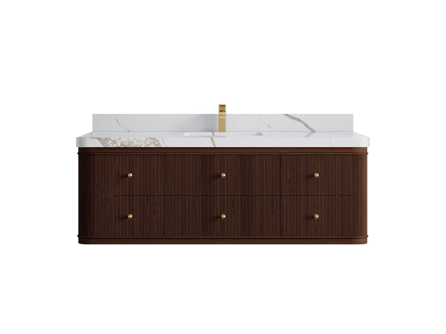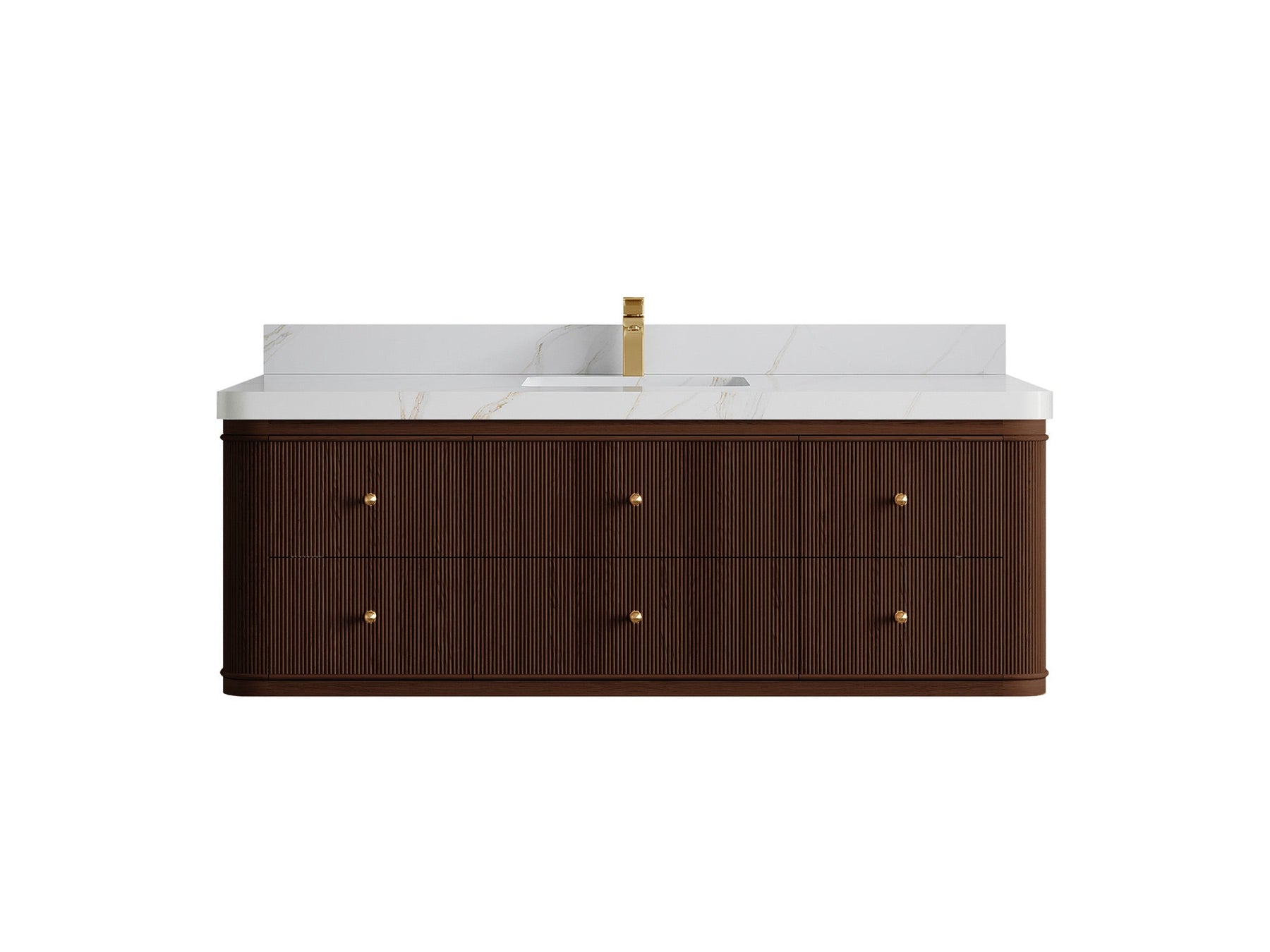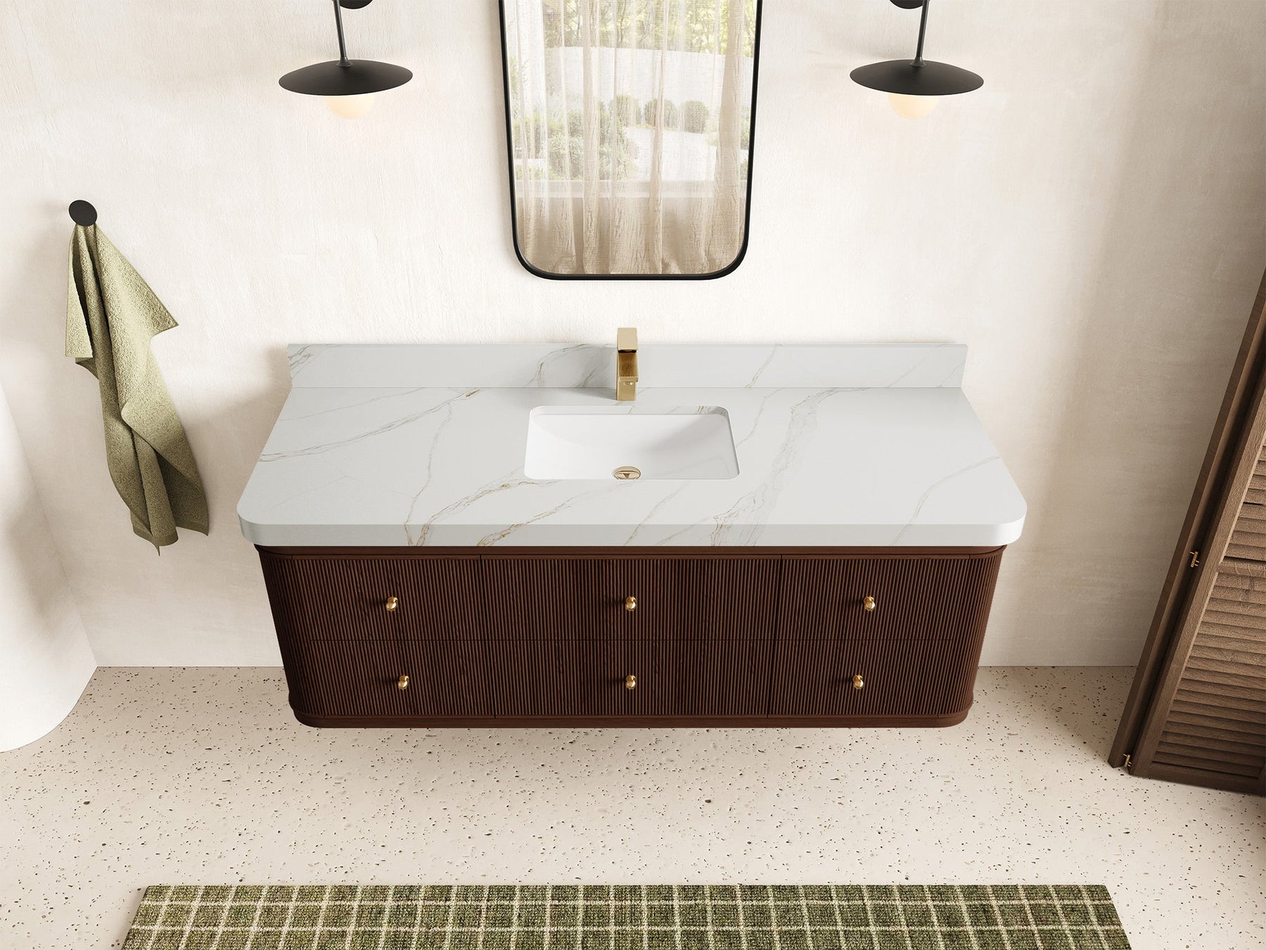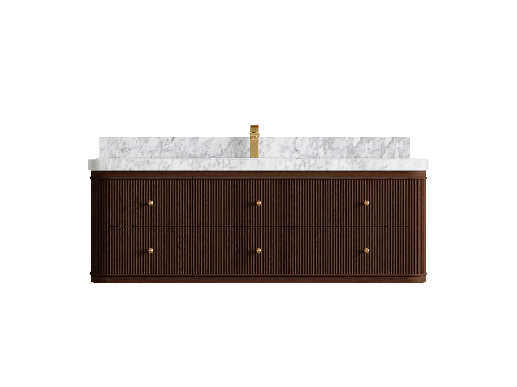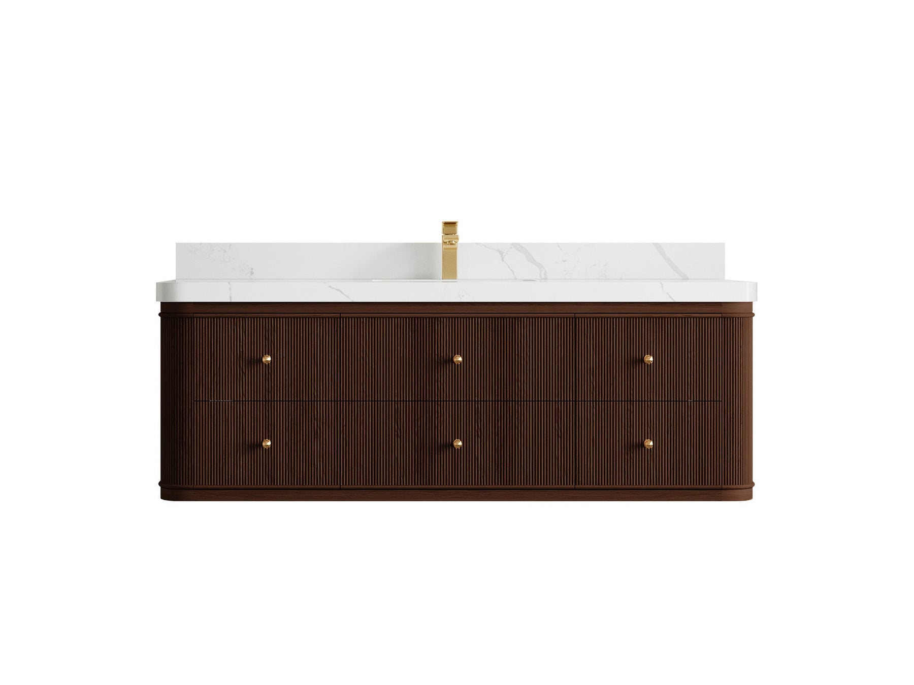 Elevate your bathroom with the Hampton Floating Teak Collection, where sleek contemporary design meets the natural warmth of fine teak wood. Featuring reeded drawer fronts, clean lines, and a luxurious white quartz countertop, this double vanity blends form and function effortlessly. The floating design creates a spacious, airy aesthetic perfect for modern interiors while maximizing storage with an elegant, minimalist appeal.