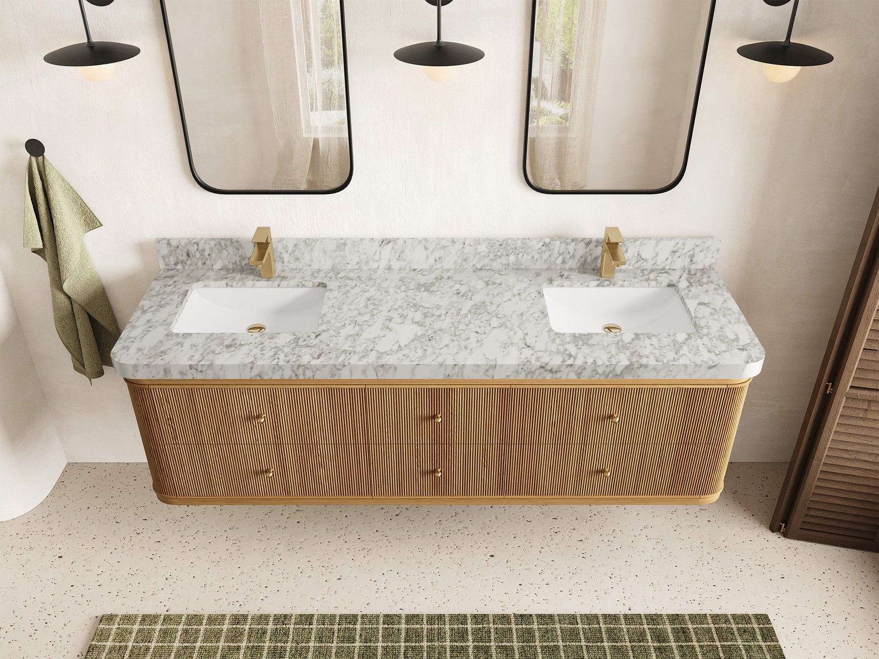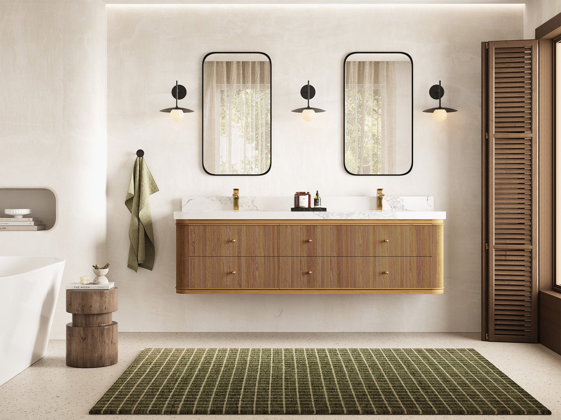 5. Minimalist Lighting & Hardware Complemented by matte black wall sconces and brass-finished faucets and knobs, the collection reflects timeless sophistication and contrast.