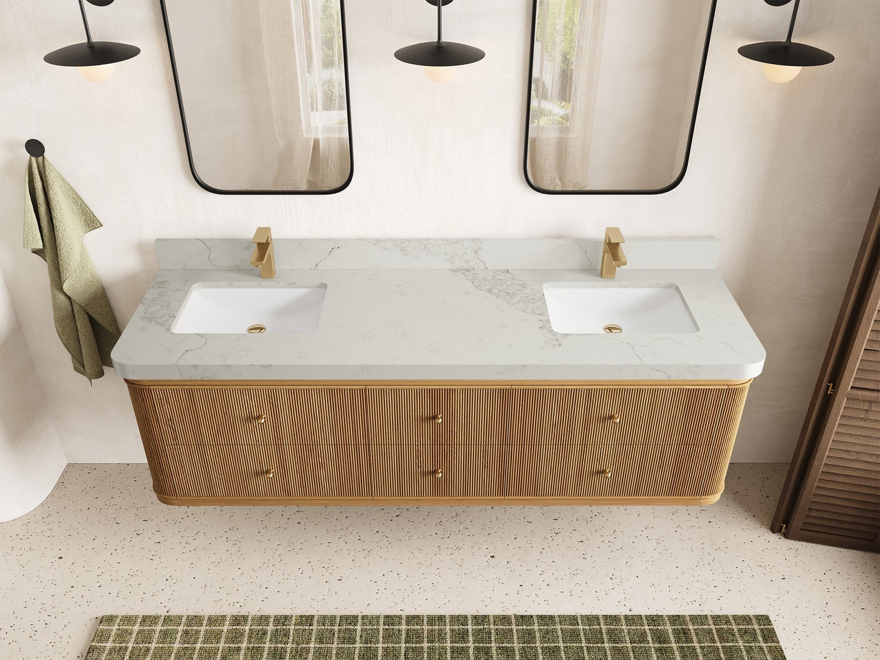 4. Integrated White Quartz Countertop The double-sink countertop features a durable and easy-to-clean white quartz surface with subtle veining, adding a touch of luxury.