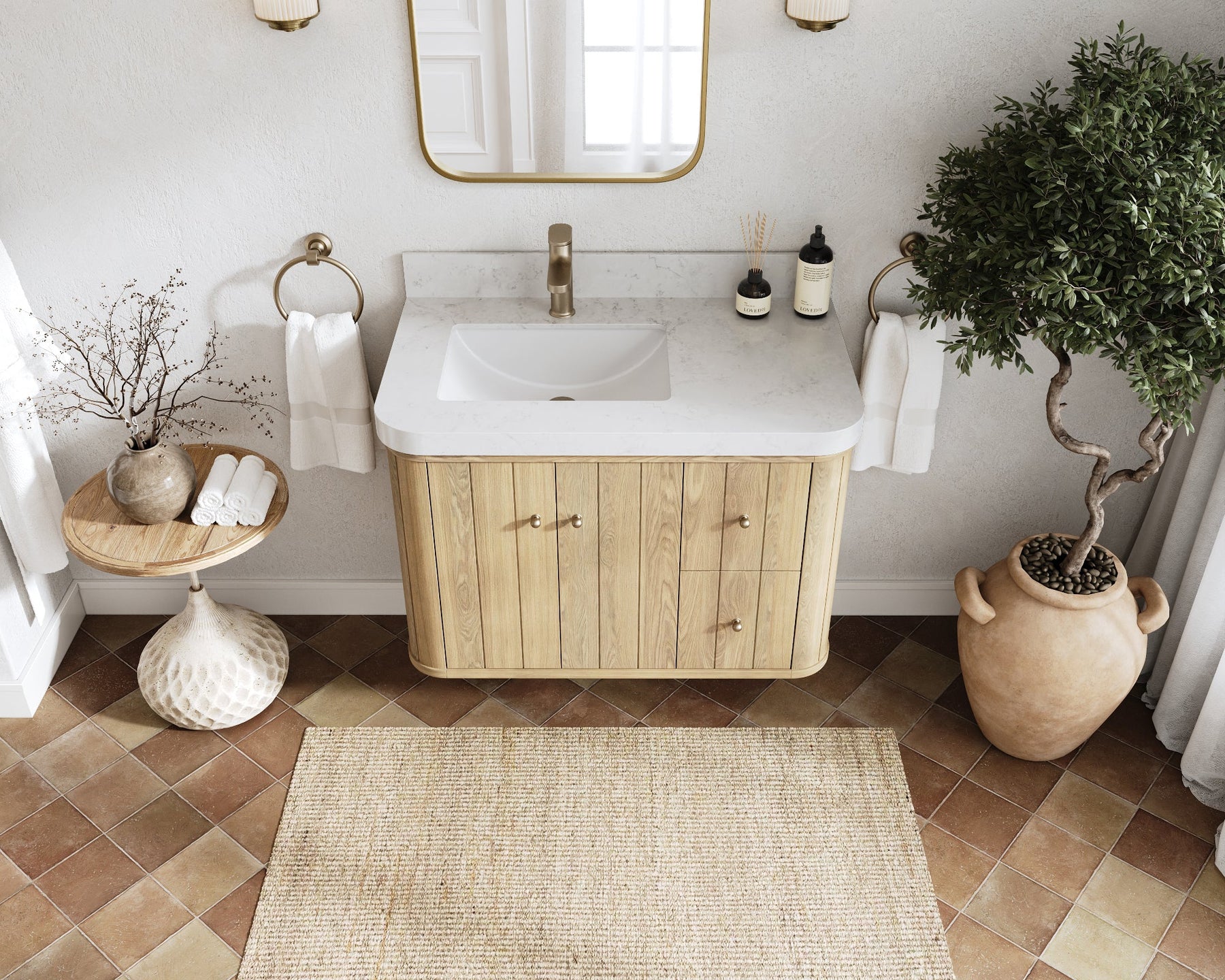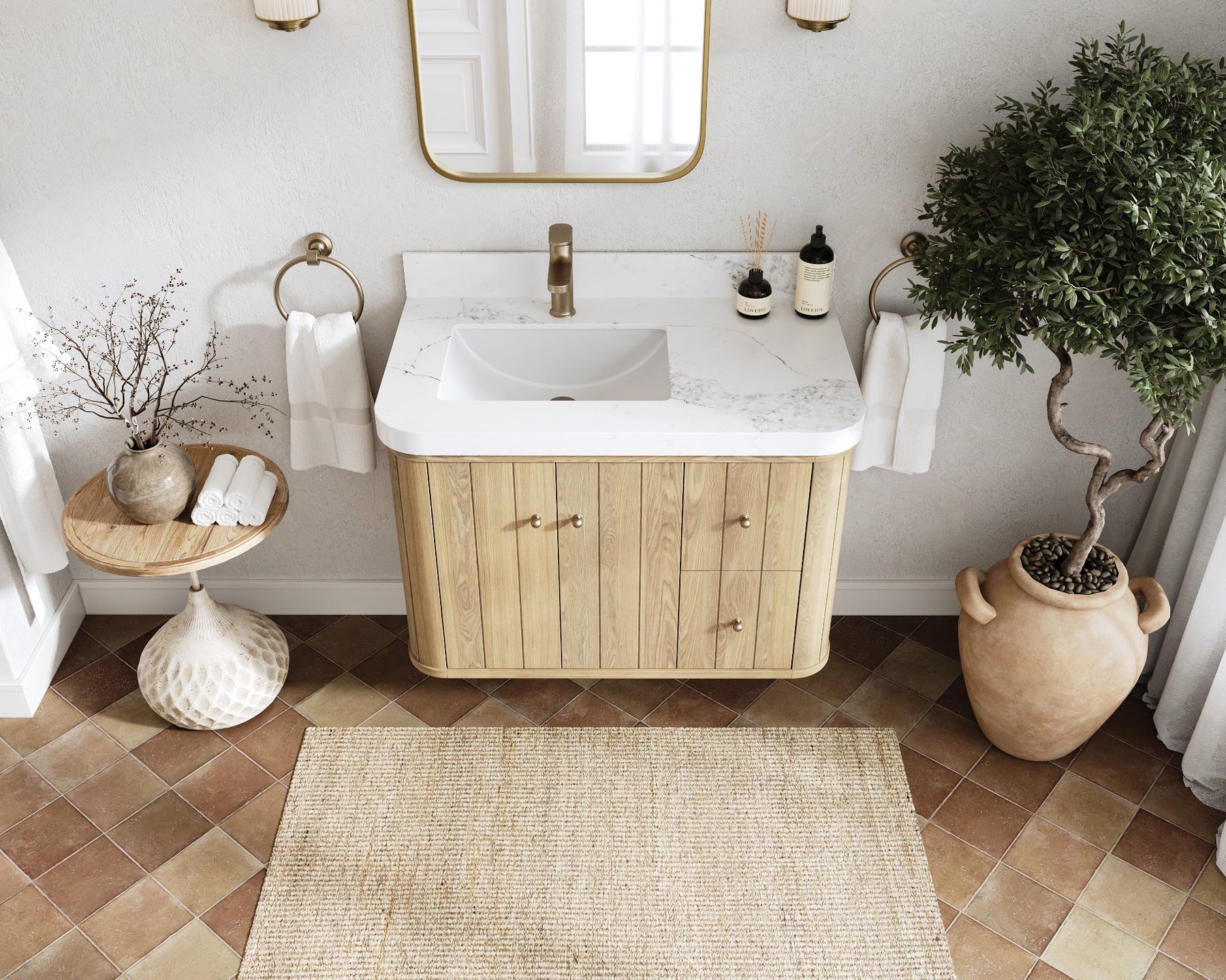 Vanity Countertops options: For Calacatta Laza Quartz, Calacatta Gold Quartz, Empira White Quartz, Pure White Quartz, Palissandro Quartz, Calacatta Nuvo Quartz, Carrara Marble, Carrara Quartz, Calacatta Sienna Quartz, Terrazzo Arctic Breeze, Terrazzo Golden Dusk we have Rounded - Edge option.