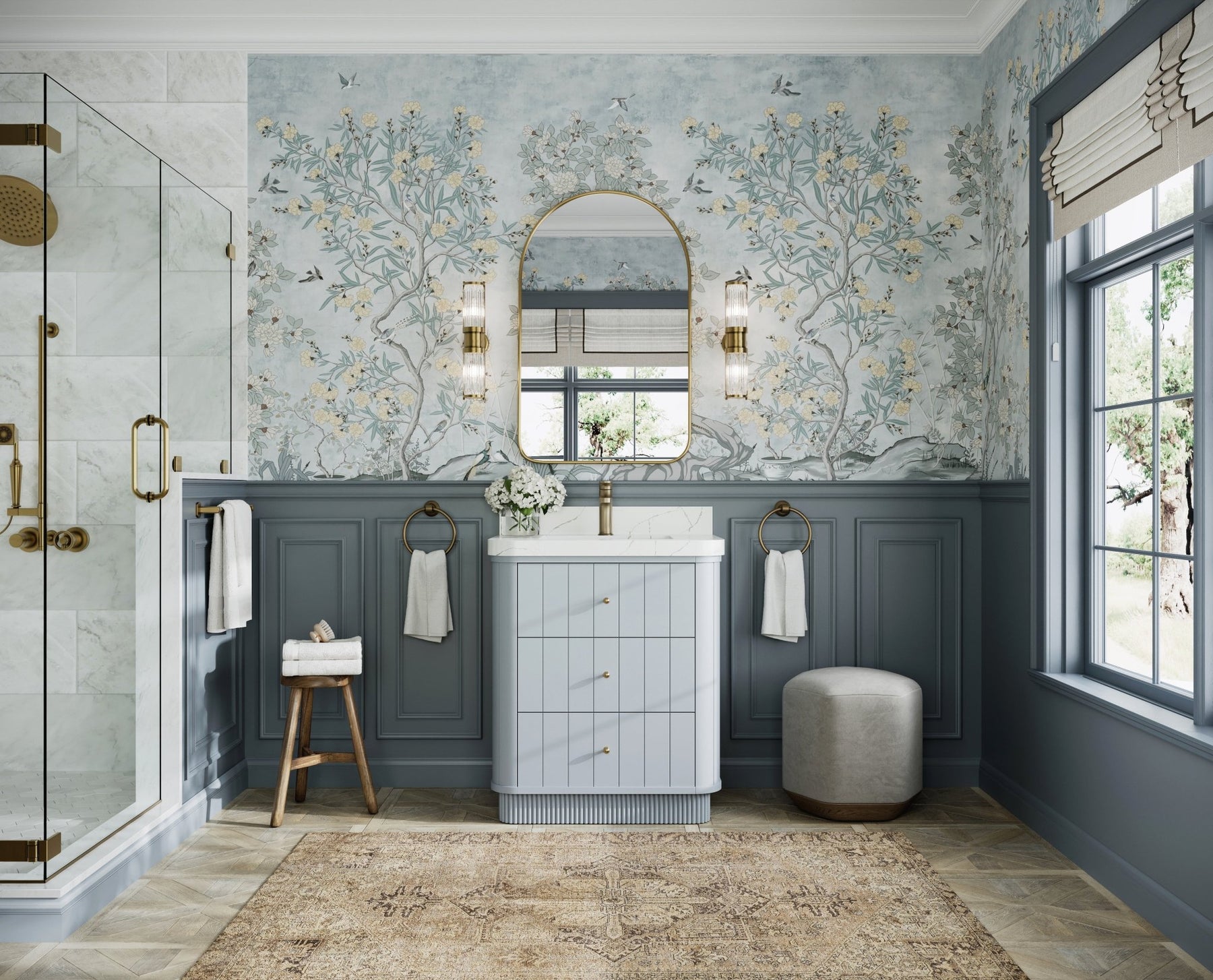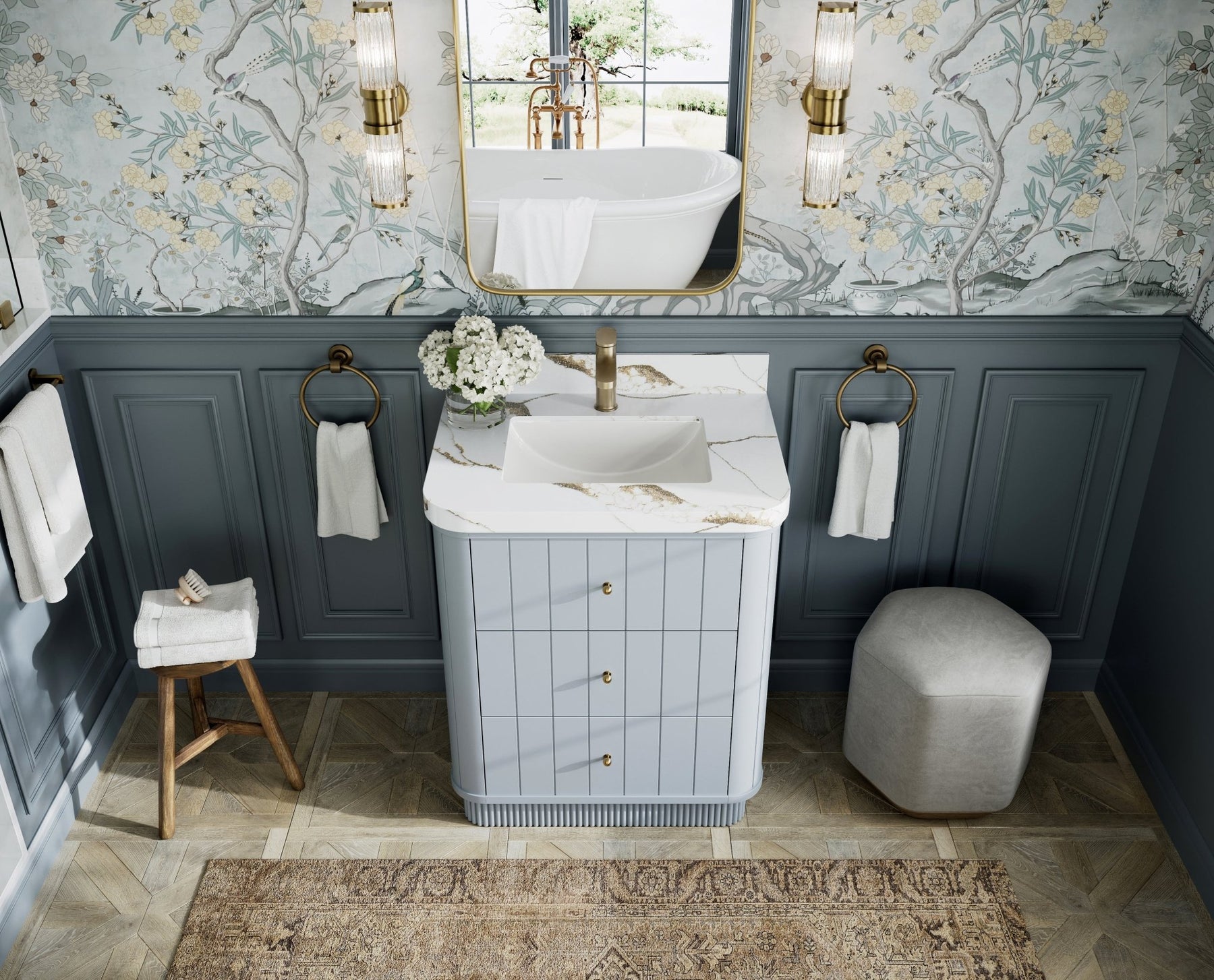 Premium countertop options – choose from Quartz or Marble, both featuring eased, rounded edges that echo the vanity’s curves.