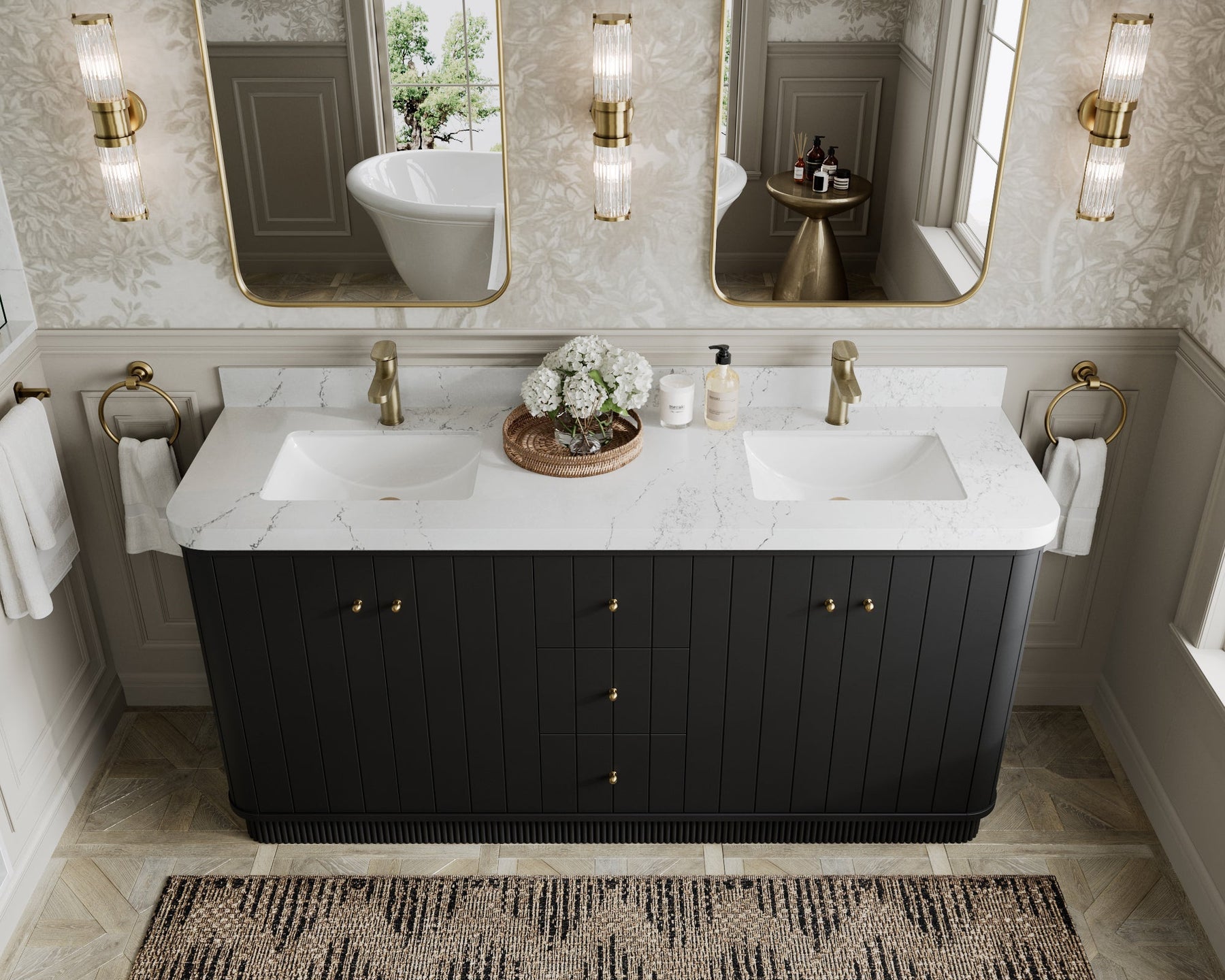 Premium countertop options – choose from Quartz or Marble, both featuring eased, rounded edges that echo the vanity’s curves.