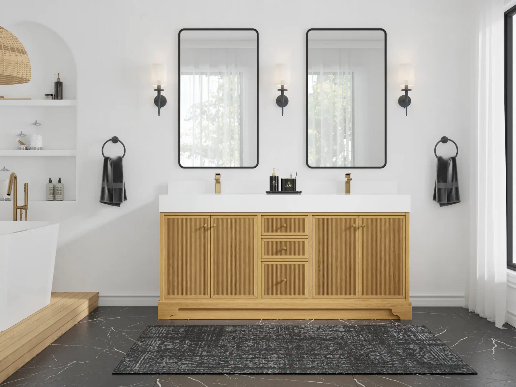 Vanity Countertops options: Straight edge (Calacatta Laza Quartz, Calacatta Nuvo Quartz, Arabescato Marble, Carrara Quartz, Empira White Quartz, Palissandro Quartz, White Quartz, Terrazzo Arctic Breeze, Terrazzo Golden Dusk)