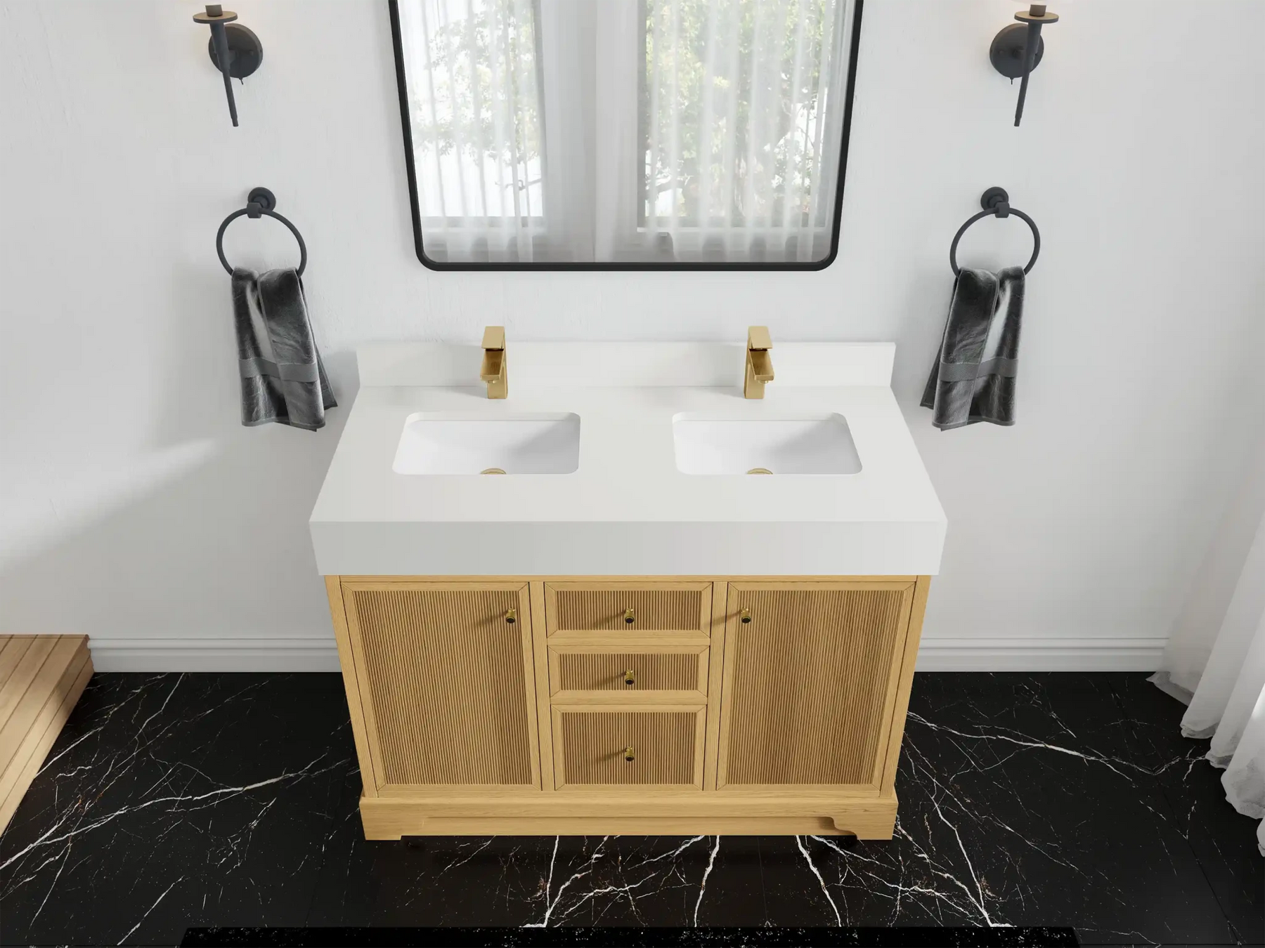Vanity Countertops options: Straight edge (Calacatta Laza Quartz, Calacatta Nuvo Quartz, Arabescato Marble, Carrara Quartz, Empira White Quartz, Palissandro Quartz, White Quartz, Terrazzo Arctic Breeze, Terrazzo Golden Dusk)