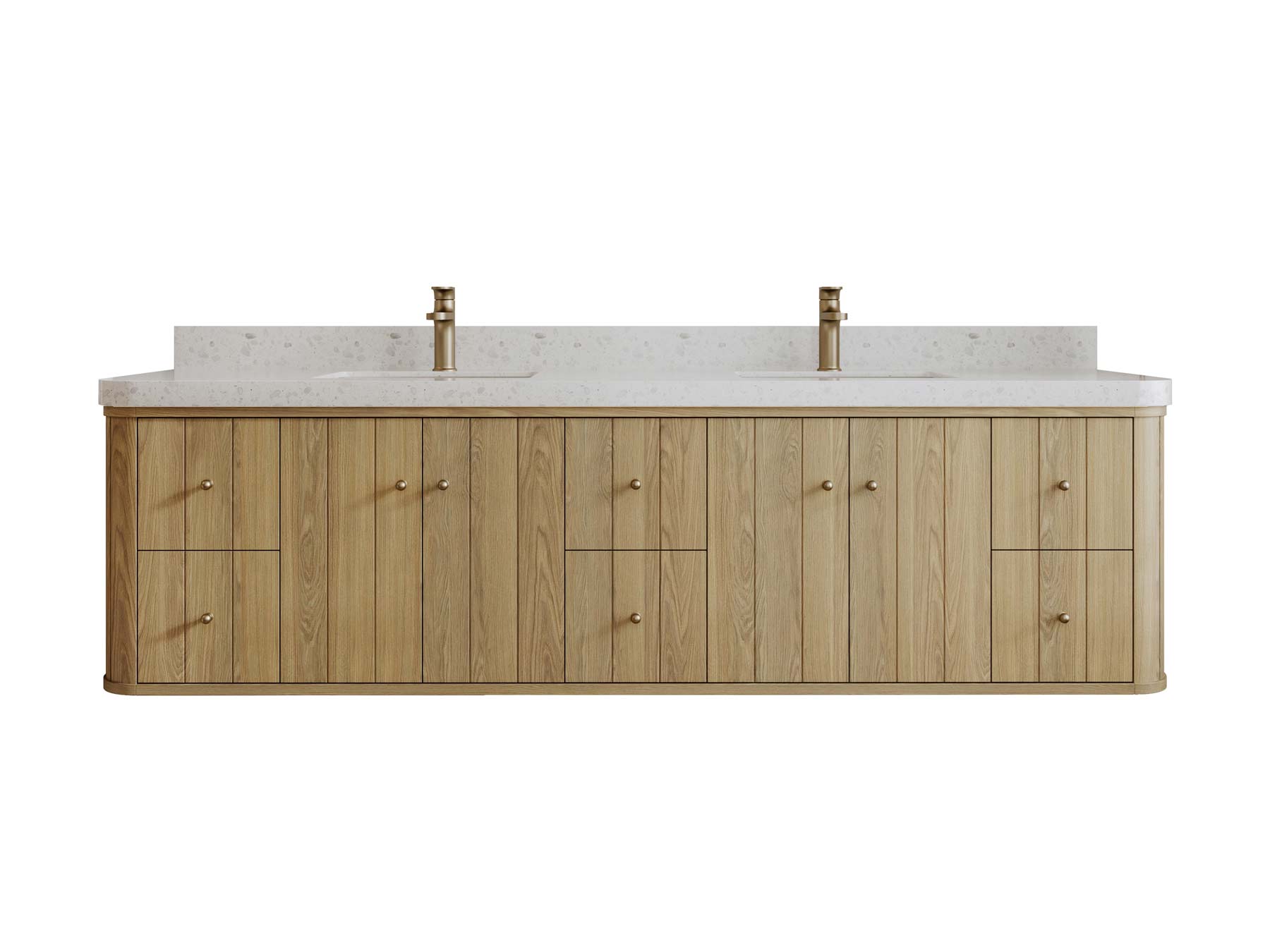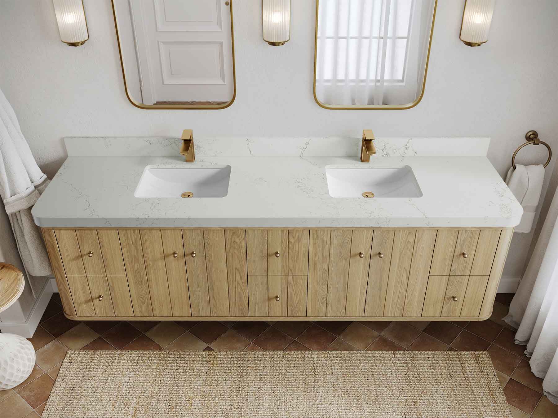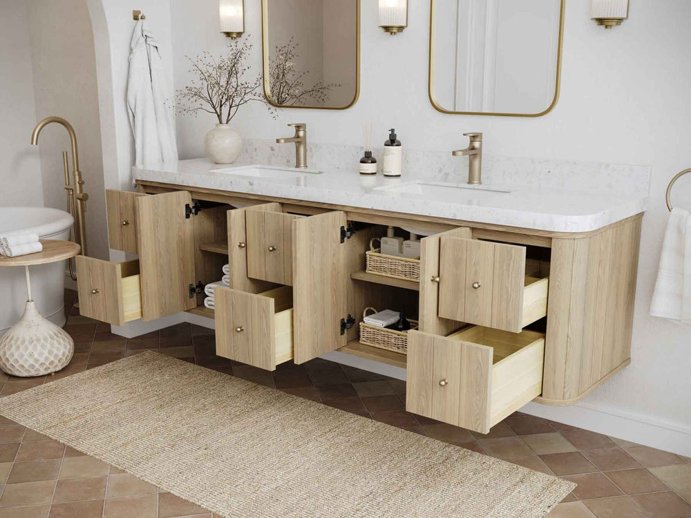 Meet Houston, our modern showpiece in warm white oak. A sculpted, softly rounded silhouette flows from the curved ends to the smooth, radiused countertop corners, while a fluted front meets a reeded kick plate for subtle texture and shadow play. The result is a clean, contemporary vanity that feels tailored and timeless made for bathrooms that want the look of luxury without sharp lines.