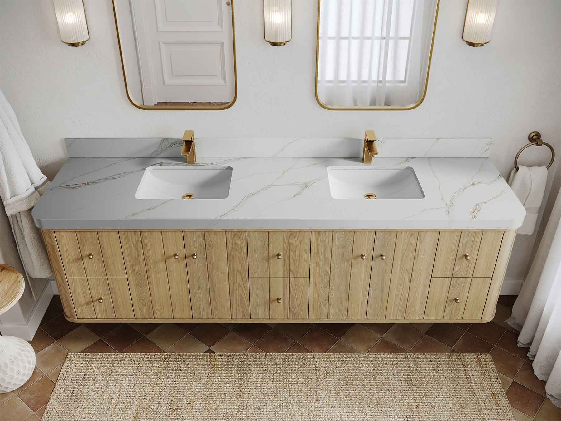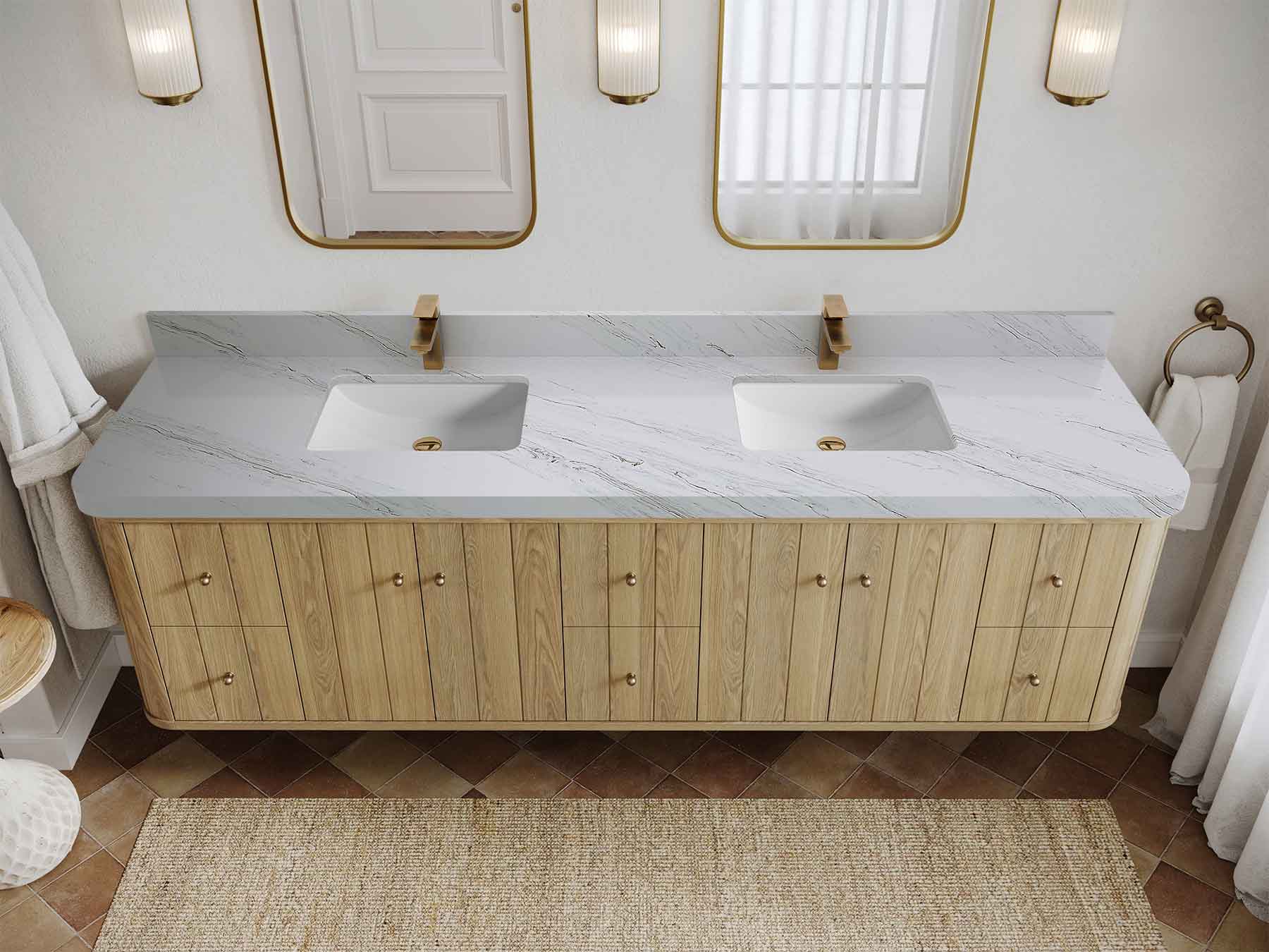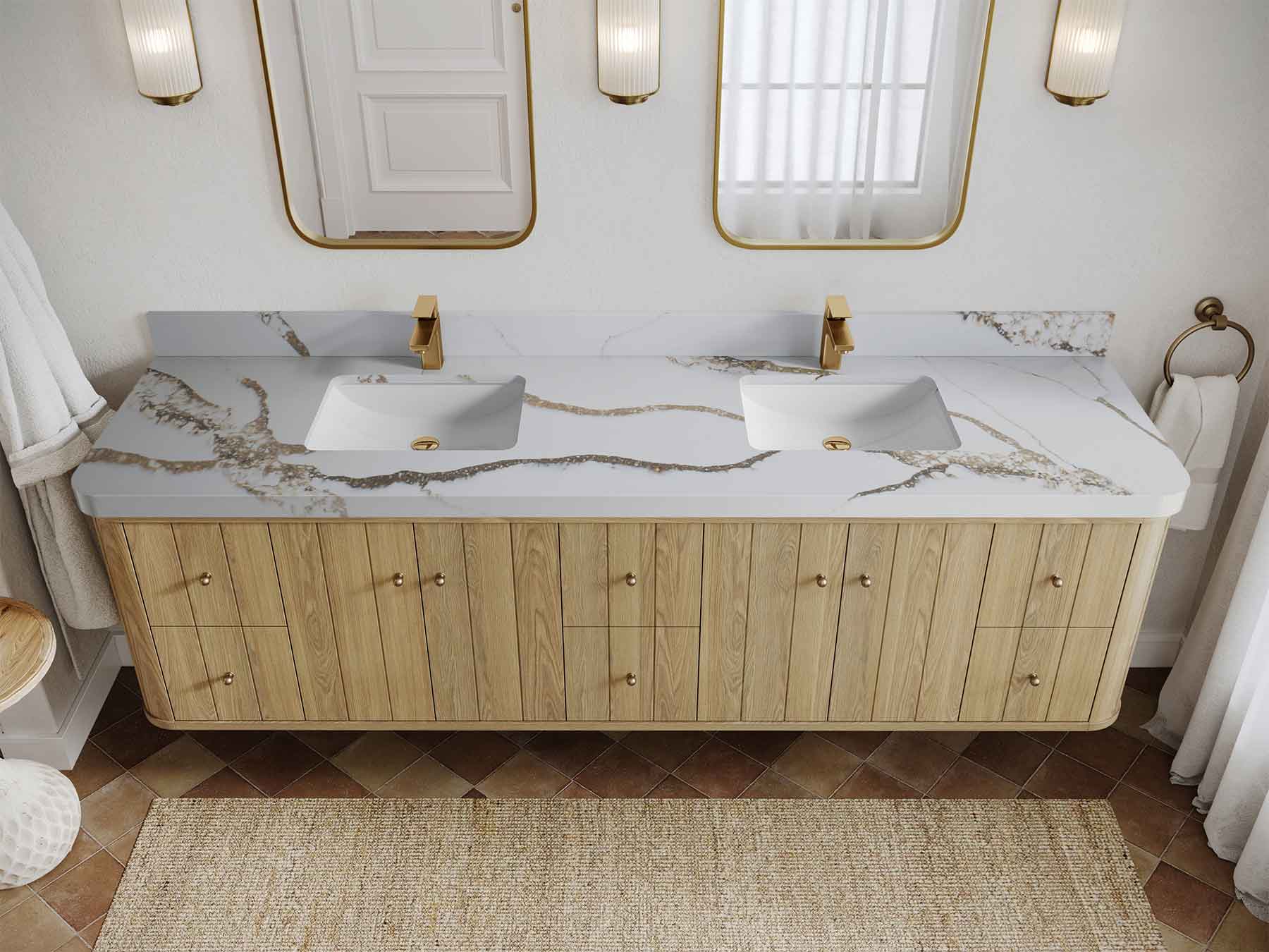 Premium tops: your choice of quartz (low‑maintenance) or natural marble (classic character), both with rounded, eased edges to echo the cabinet’s curves.