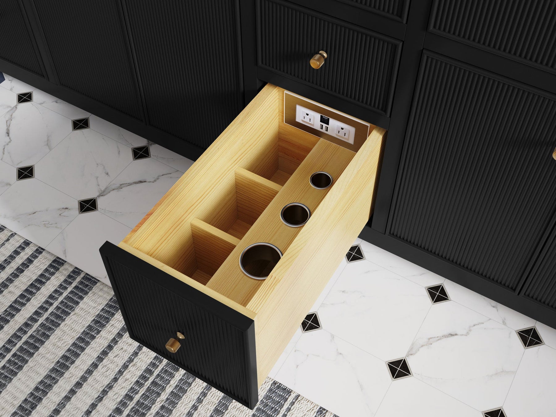 Number of Drawers: 2 Tip Out Drawers, 1 Deep Drawer with Power Outlet and Accessories, 2 Regular Drawers