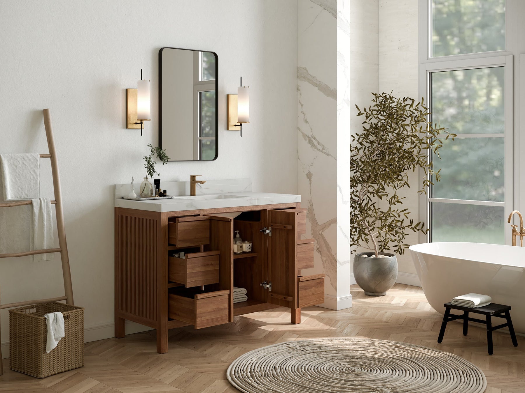 Invite a sense of calm in your space with this solid teak vanity, where sleek lines and ribbed texture create a refined, spa-like feel. Raised legs lend an airy, open look, while the customizable quartz or marble countertop completes the design with a luxurious finish. 100% solid teak wood in various finishes Soft-close doors and drawers for smooth operation Customizable countertop materials. Elevated raised legs for an open, spacious feel ribbed side panels for texture and visual interest. Looking for modern teak bathroom ideas that blend style and substance? This bathroom vanity is the answer. The rich, natural tones of the wood bring warmth and character to your space, while the ribbed texture adds depth without overwhelming the design. Ideal for those who want the clean, minimalist look of wood vanities for bathrooms without sacrificing storage, it features smooth soft-close drawers and ample cabinetry to keep essentials neatly tucked away. Plus, the airy, raised base of this teak sink makes even small bathrooms feel more open and spacious.