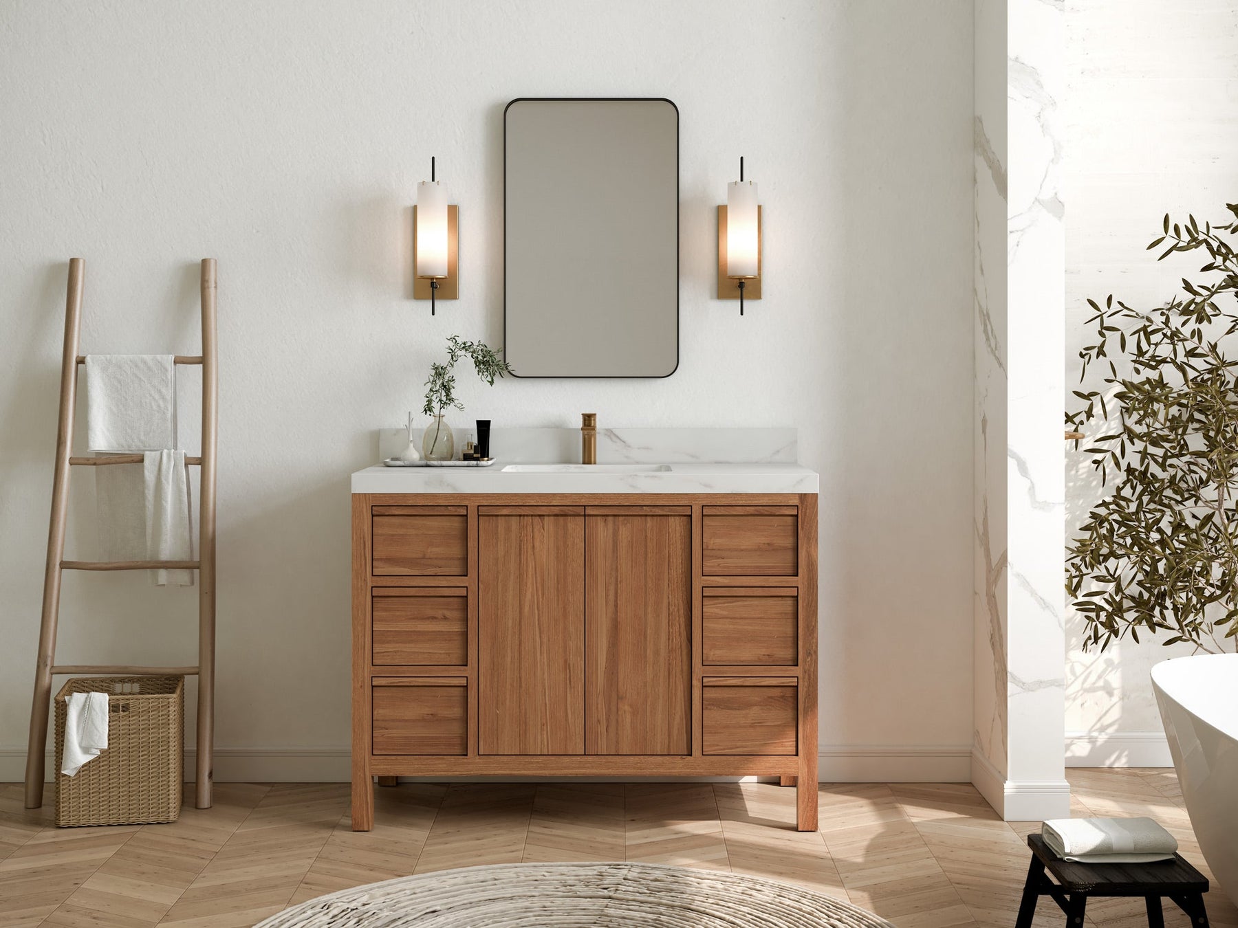 CUSTOM: Choose from quartz or marble countertops in a variety of finishes. The vanity base is available in light or dark natural teak for a soft, organic appearance, or in deep dark walnut for a more dramatic effect. Tailor it to your needs with flexible faucet configurations, making our teak vanities the ultimate choice for those who want both beauty and functionality in their bathroom design.