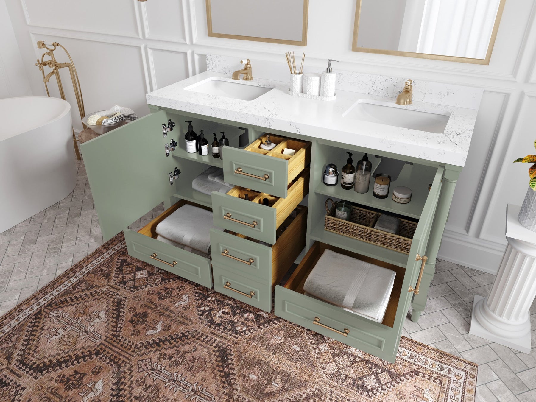 4. Ample Storage Space - The Aberdeen Vanity comes with spacious cabinet space to store all your bathroom essentials, including towels, toiletries, and more. The soft-close drawers and doors ensure that you can access your items easily and quietly.