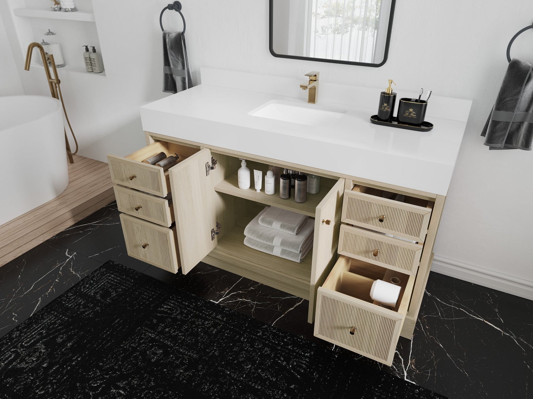 The Manhattan Collection is a modern and stylish addition to any bathroom. It is made from white oak wood and plywood, a strong and durable material that will last for years to come. The reeded design adds a sophisticated touch to the vanity, making it a statement piece in any bathroom. The thick countertop adds an extra layer of strength and durability, making it perfect for a busy bathroom. The white oak wood gives the vanity a clean, contemporary look that will complement any modern bathroom decor. The spacious countertop provides plenty of space for all of your bathroom essentials, and the deep drawer with built-in power station and organizer allows you to keep everything organized and easily accessible. The power station and organizer feature outlets and USB ports to charge your devices, as well as compartments for organizing your personal items. The strong and sturdy construction of this vanity makes it a reliable and functional addition to any bathroom.