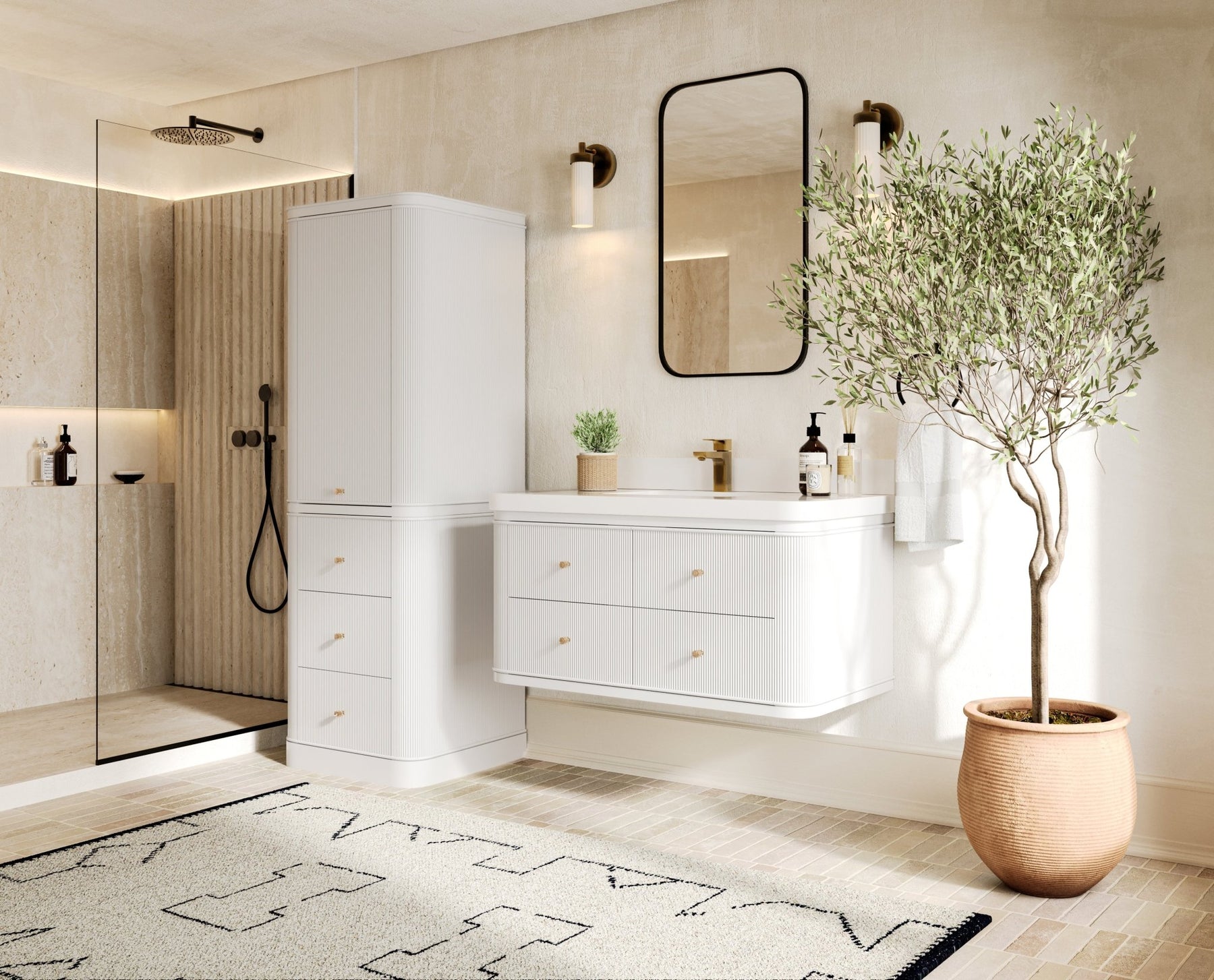 The Hampton Collection embodies understated elegance through its fluted detailing, soft rounded corners, and floating form. This wall-mounted vanity creates an elevated sense of space while offering exceptional storage and organization. Every drawer opens to reveal a thoughtfully designed interior with natural wood compartments, built-in power outlets, and soft-close hardware for a seamless experience.