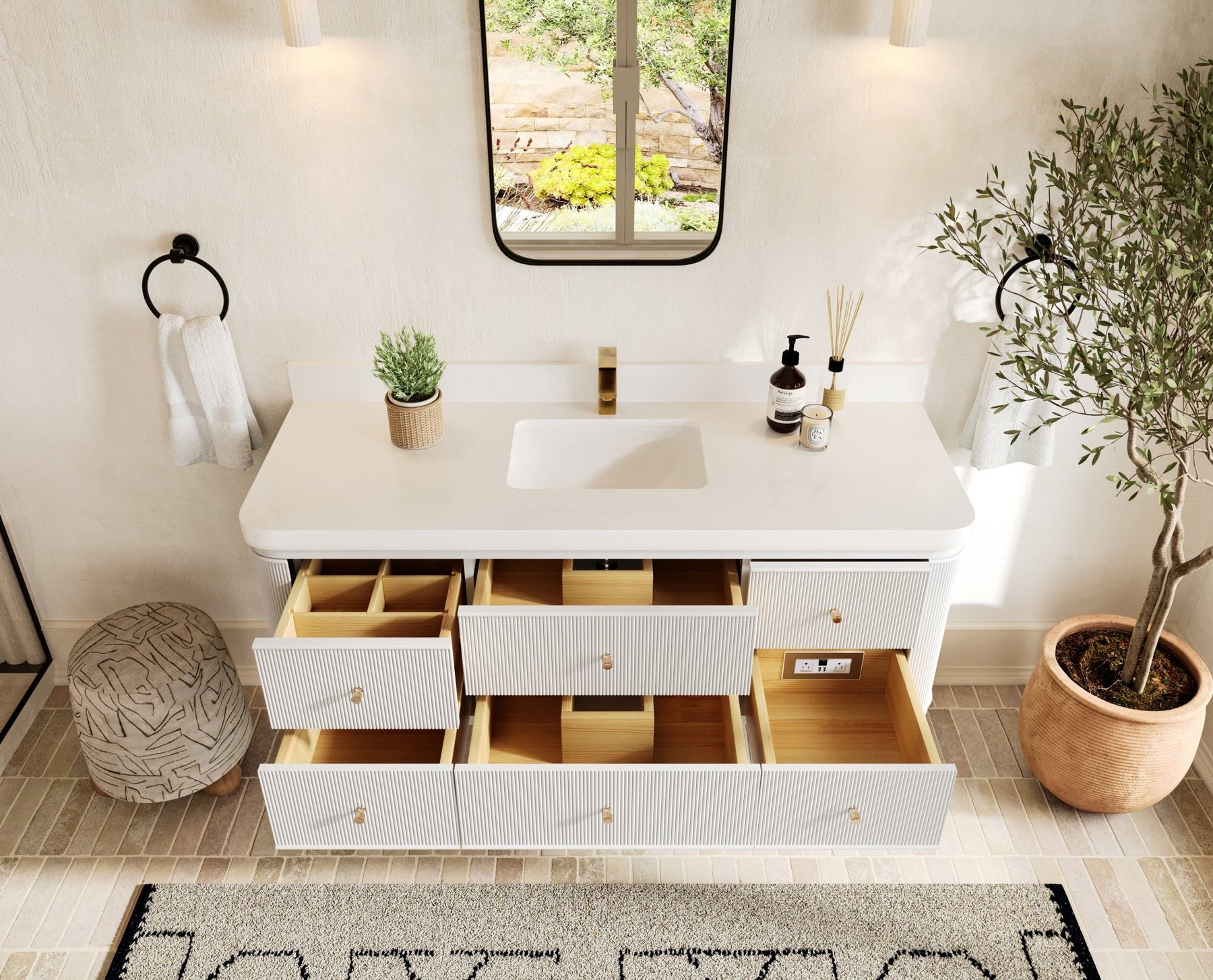The Hampton Collection embodies understated elegance through its fluted detailing, soft rounded corners, and floating form. This wall-mounted vanity creates an elevated sense of space while offering exceptional storage and organization. Every drawer opens to reveal a thoughtfully designed interior with natural wood compartments, built-in power outlets, and soft-close hardware for a seamless experience.
