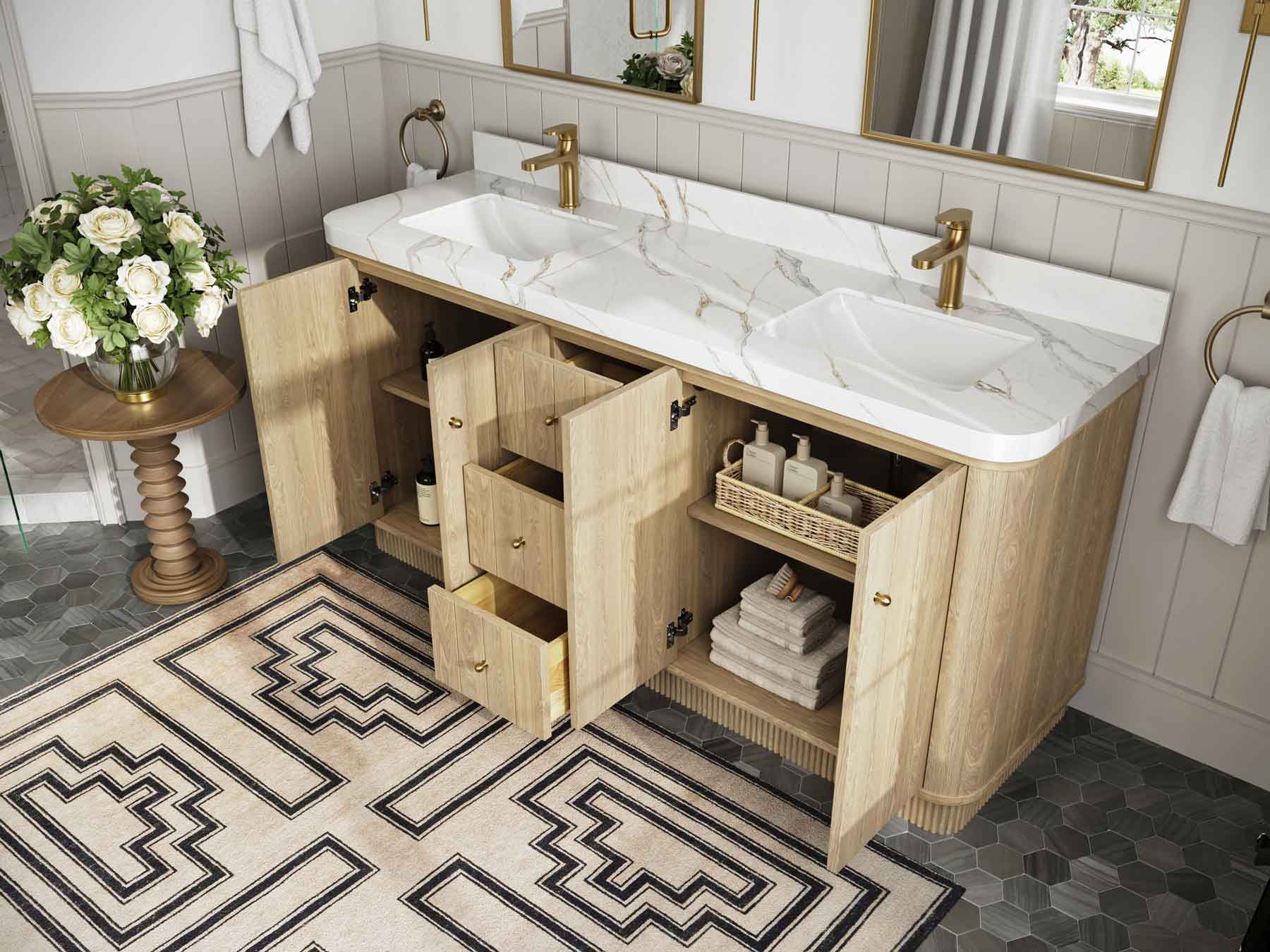 Meet Houston, our modern showpiece in warm white oak. A sculpted, softly rounded silhouette flows from the curved ends to the smooth, radiused countertop corners, while a fluted front meets a reeded kick plate for subtle texture and shadow play. The result is a clean, contemporary vanity that feels tailored and timeless made for bathrooms that want the look of luxury without sharp lines.