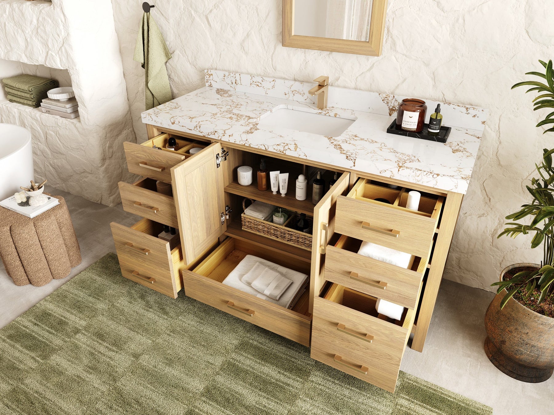 Topped with your choice of premium countertops, from sleek quartz to timeless Carrara marble, the Malibu Collection adapts to both modern and classic interiors. Its clean lines, shaker-style doors, and natural white oak finish create a versatile design that blends seamlessly into any bathroom aesthetic.